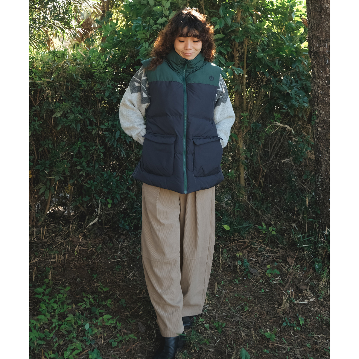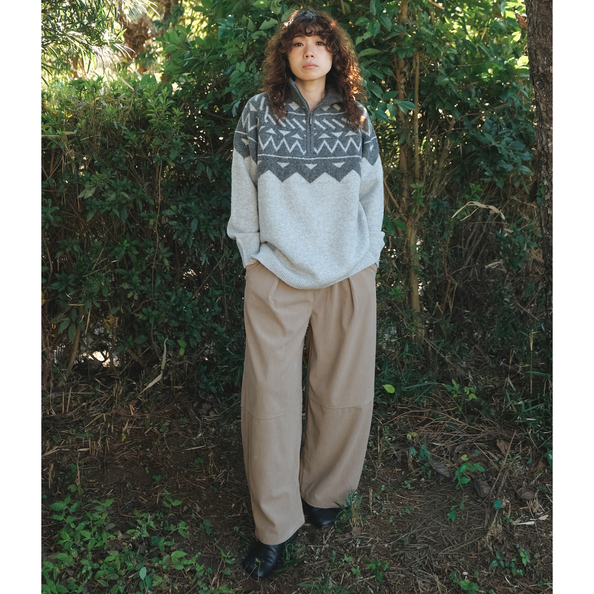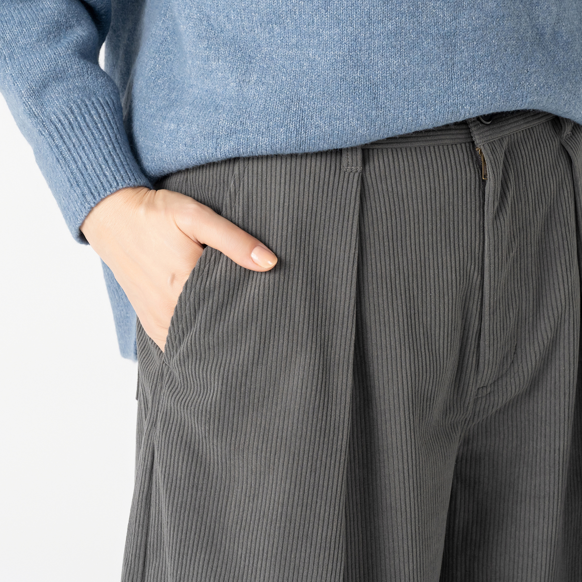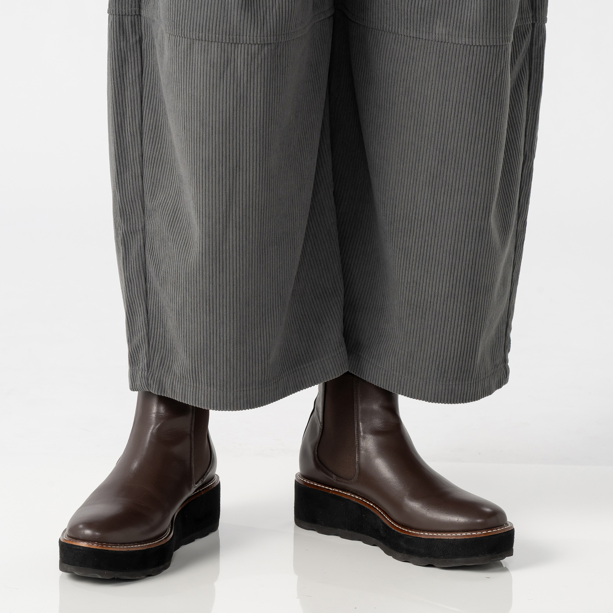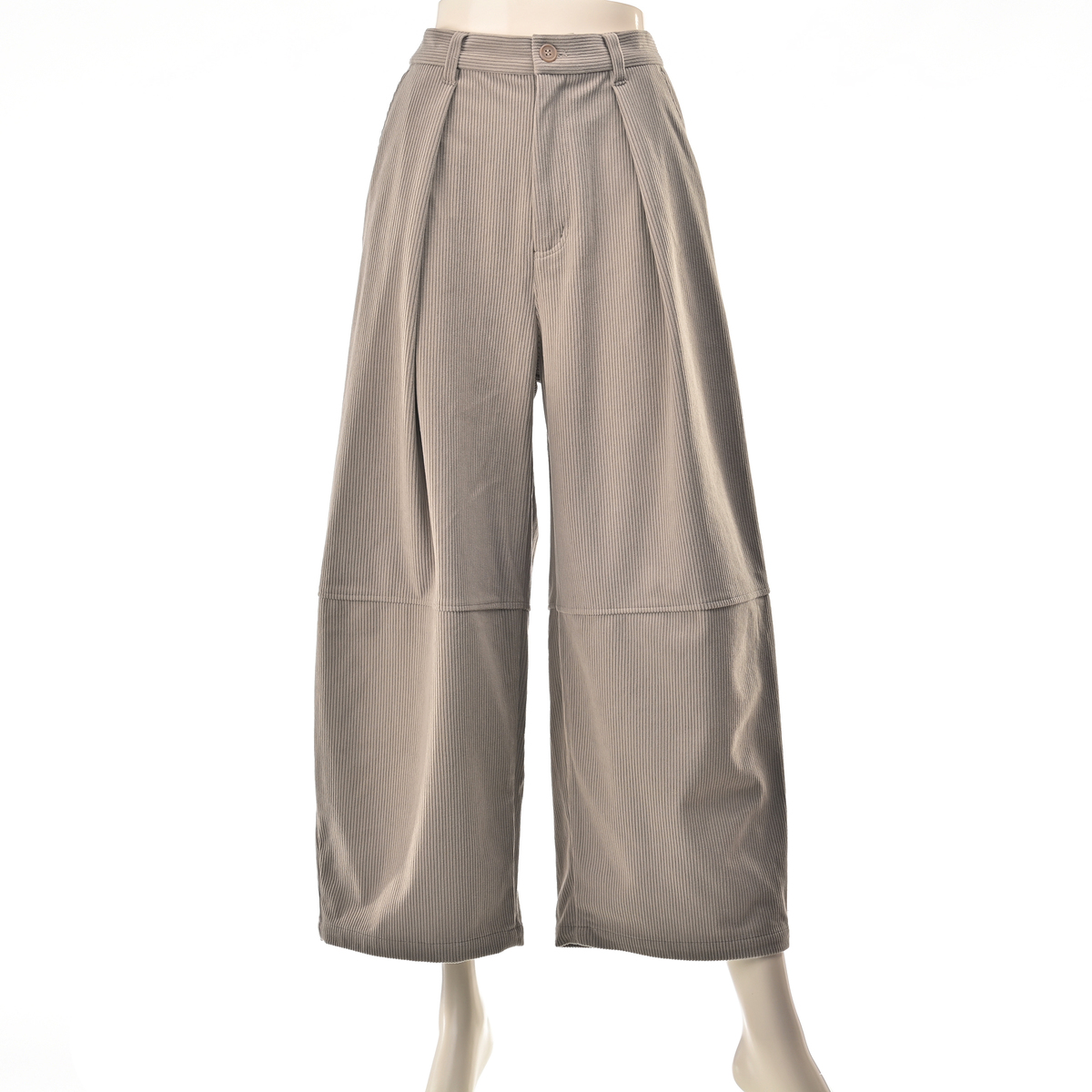 しっかりとした肉感のある、ポリエステルのニットコーデュロイを使用。適度に広めのヒップと渡りから延長したワイドシルエットを膝位置で切替え、緩やかに裾を絞った丸いシルエット。足首が見える長さのガウチョパンツを作りました