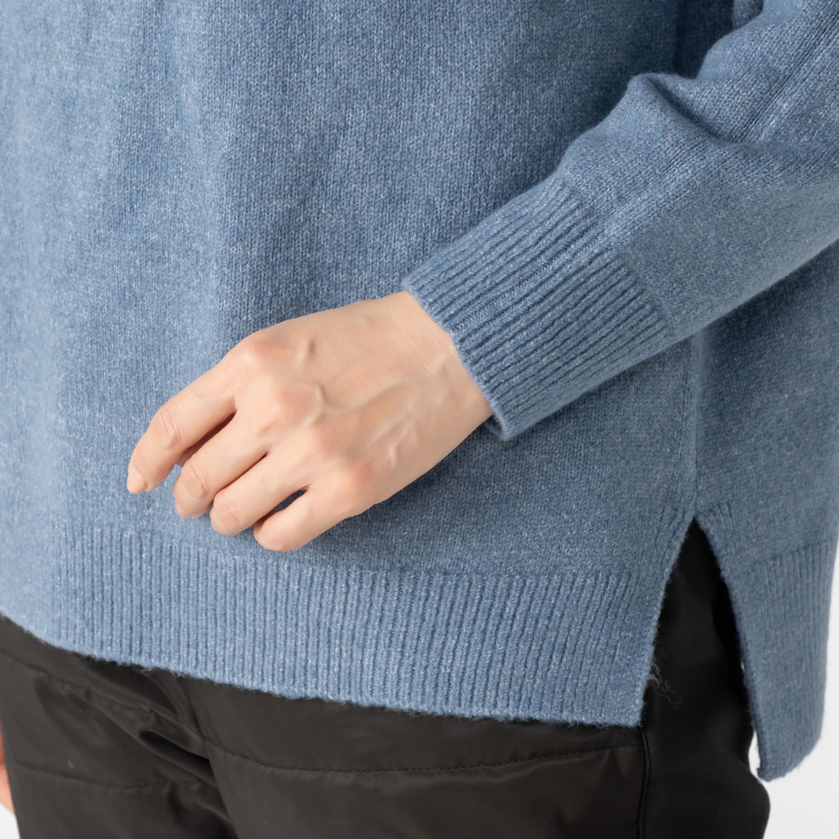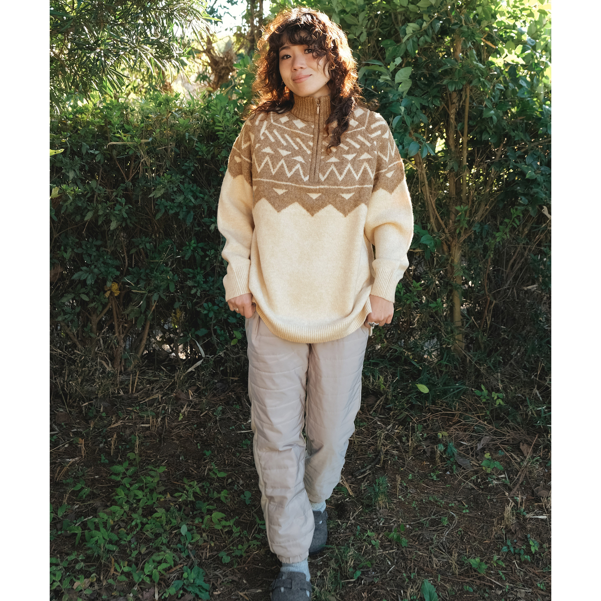 暖かく、もっちりとした風合いの糸を使用したハーフジッププルオーバー。ややオーバーサイズで高めの衿が特徴で、Tシャツやハイネックの上に重ねれば、アウター代わりにもなる一枚です