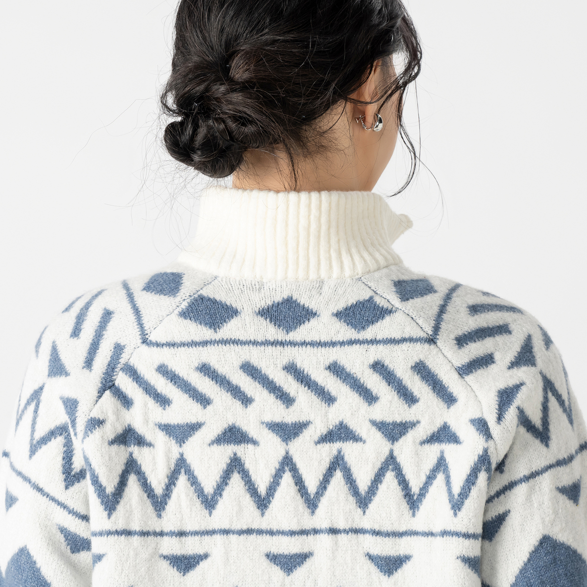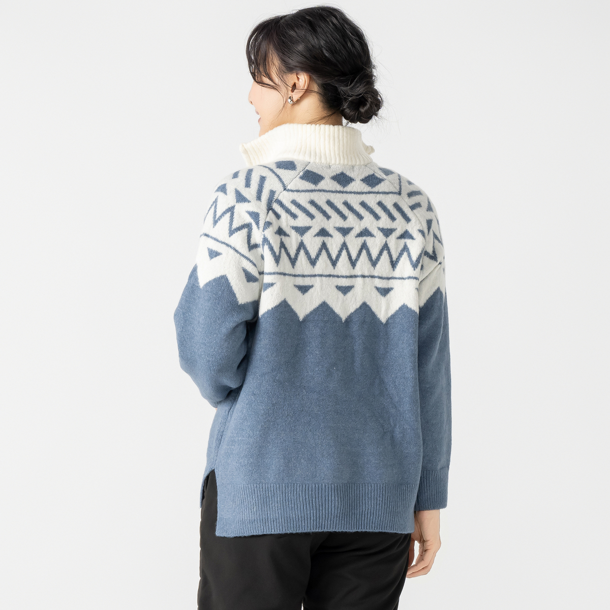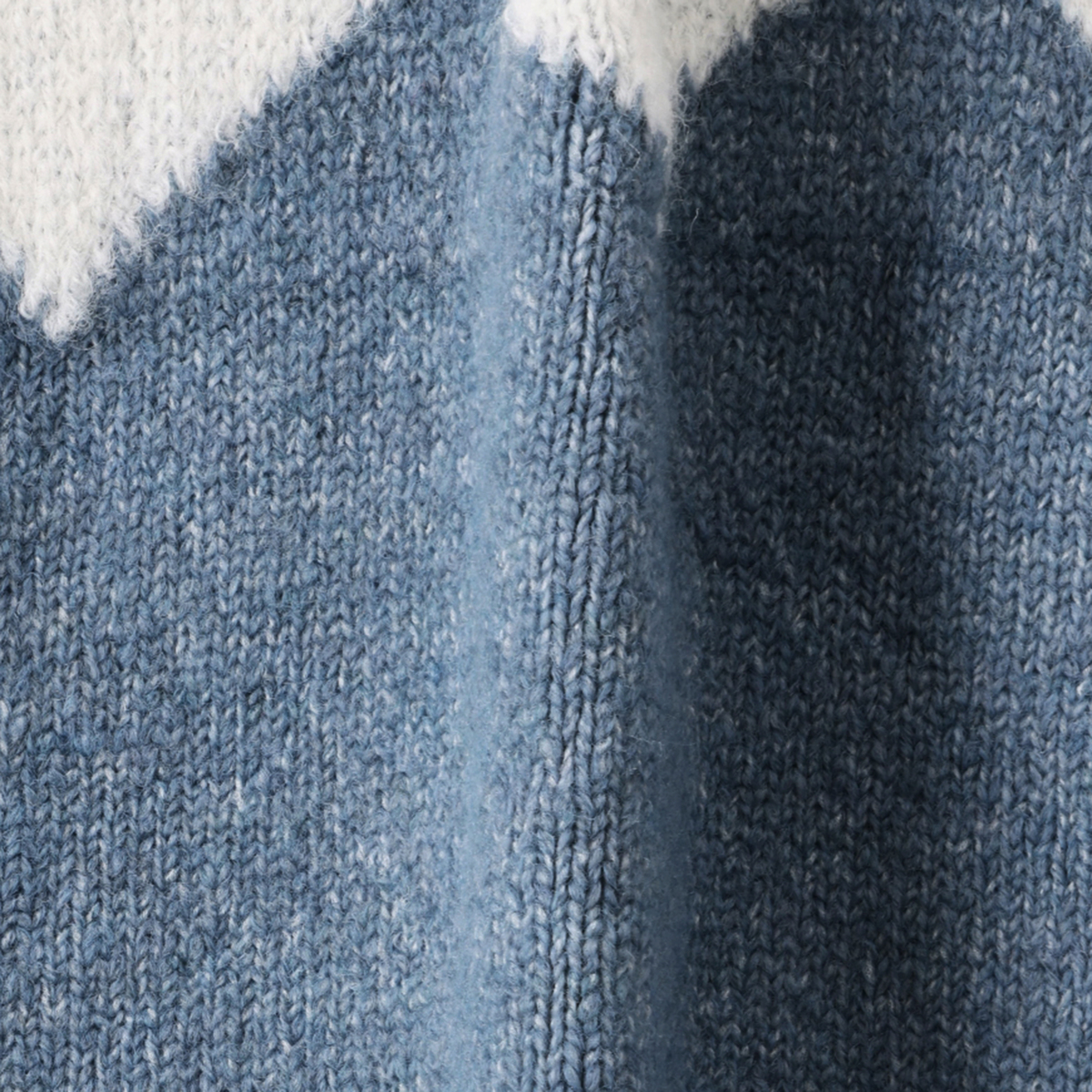 シンプルな幾何柄を並べたバイカラーが、衿元にアクセントを添えます。直線的なラインが肩をすっきり見せ、シャープな印象を演出。肩回りは袋ジャカードで二重組織に仕上げ、暖かさと柄の美しさを両立しました