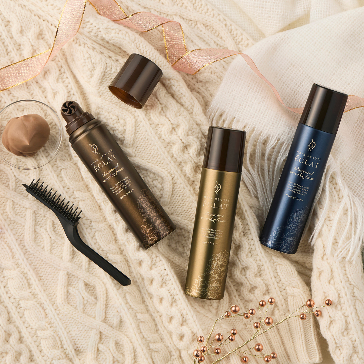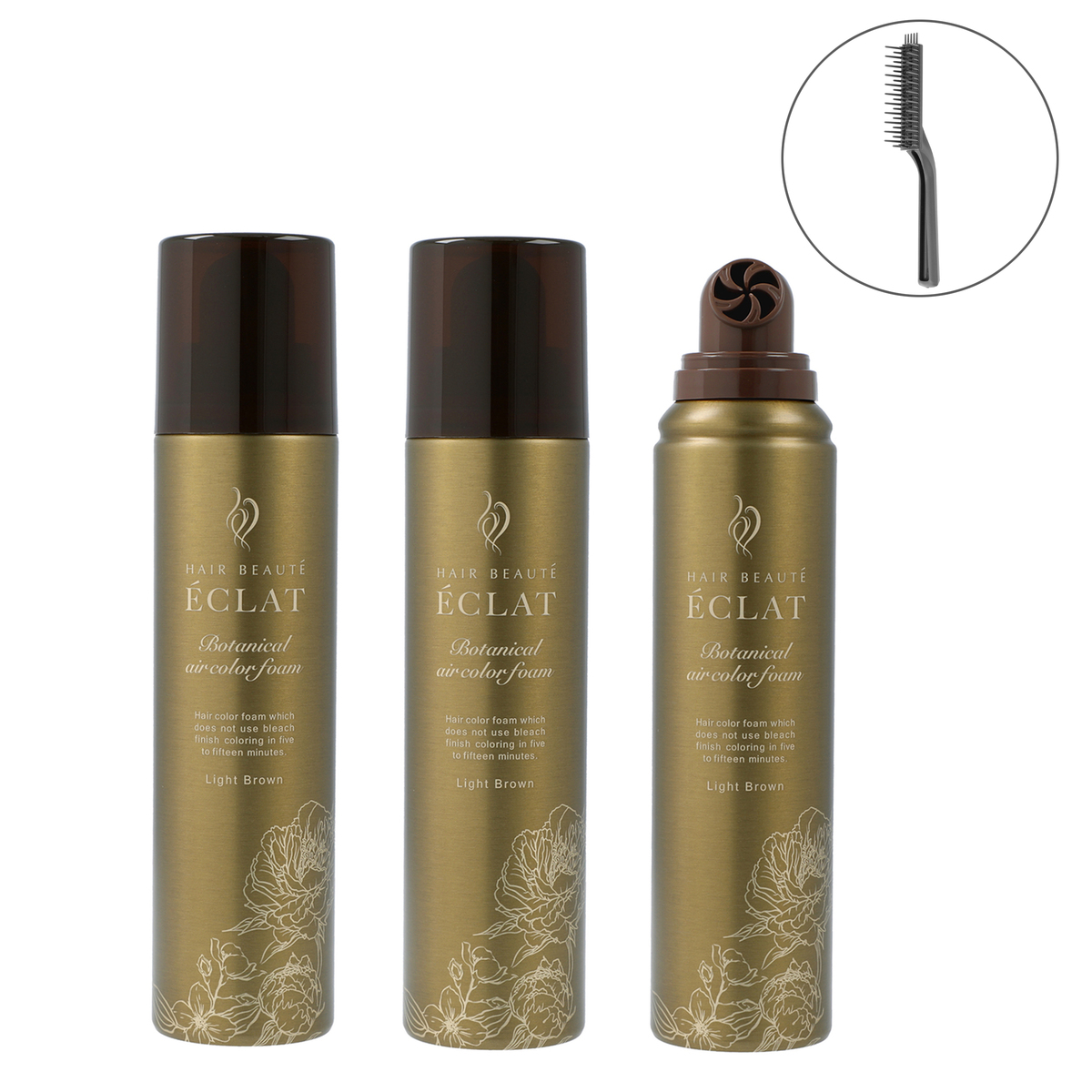 [使用方法] ※容器(缶)を上下によく振ってお使い下さい 1、付属の手袋を装着し、適量を手にとり、乾いた髪の白髪が気になる部分から塗布します 2、髪を手で分けながら根元に揉み込むように、髪全体にしっかりとなじませます 3、5〜15分ほど放置します。 4、ヘアカラーの色が出なくなるまですすぎ、シャンプーした後、リンスまたはコンディショナーで仕上げてよく乾かします [注意事項] ※次の方は使用しないで下さい ・今までに本品に限らずヘアカラーでかぶれたことのある方 ・今までに染毛中または直後に気分の悪くなったことのある方 ・皮膚アレルギー試験(パッチテスト)の結果、皮膚に異常を感じた方 ・頭皮あるいは皮膚が過敏な状態になっている方(病中、病後の回復期、生理時、妊娠中等) ・頭、顔、首筋にはれもの、傷、皮膚病がある方 ・腎臓病、血液疾患等の既往症がある方 ・体調不良の症状が持続する方(微熱、倦怠感、動悸、息切れ、紫斑、出血しやすい、月経等の出血が止まりにくい等) ※皮膚アレルギー試験(パッチテスト)を毎回必ず行って下さい ※ご使用の際は必ず同封の使用説明書をよく読んで正しくお使い下さい ※薬液や洗髪時の洗い液が目に入らないようにして下さい ※眉毛、まつ毛には使用しないで下さい ※幼小児の手の届かないところに保管して下さい ※高温や直射日光を避けて保管して下さい ※直射日光の当たるところ、暖房器具(ファンヒーター等)の周囲は温度が上がり破裂する危険があるので置かないで下さい ※火気と高温に注意 ※高圧ガスを使用した可燃性の製品であり、危険なため、下記の注意を守ること ・炎や火気の近くで使用しないこと ・火気を使用している室内で大量に使用しないこと ・高温にすると破裂の危険があるため、直射日光の当たる所や火気等の近くなど温度が40度以上となる所に置かないこと ・火の中に入れないこと ・使い切って捨てること ※高圧ガス:LPG ■医薬部外品(染毛) 【日本製】 [セット内容] ・ヘアボーテエクラボタニカルエアカラーフォームup3本セット ・毛染めブラシ(プレゼント) [成分] ボタニカルエアカラーフォームupナチュラルブラック: 【有効成分】塩酸2,4-ジアミノフェノキシエタノール、硫酸2,4-ジアミノフェノール、パラフェニレンジアミン、5-アミノオルトクレゾール 【その他の成分】精製水、LPG、ポリエチレングリコール600、パルミチン酸2-エチルヘキシル、フノリ粉、ジグルコシル没食子酸、塩化N-[2-ヒドロキシ-3-(ラウリルジメチルアンモニオ)プロピル]加水分解ケラチン、加水分解ローヤルゼリータンパク液、ローヤルゼリーエキス、加水分解ケラチン液、加水分解シルク液、(加水分解シルク/PG-プロピルメチルシランジオール)クロスポリマー、 ヤシ油脂肪酸加水分解コラーゲンカリウム液、加水分解コンキオリン液、ヒドロキシアパタイト、センブリエキス、ビワ葉エキス、オウゴンエキス、クララエキス(1)、ショウキョウエキス、センキュウエキス、トウキエキス(1)、モモ葉エキス、ニンジンエキス、ジオウエキス、ボタンエキス、他 ボタニカルエアカラーフォームupダークブラウン: 【有効成分】塩酸2,4-ジアミノフェノキシエタノール、硫酸2,4-ジアミノフェノール、パラフェニレンジアミン、パラニトロオルトフェニレンジアミン、ニトロパラフェニレンジアミン 【その他の成分】精製水、LPG、ポリエチレングリコール600、パルミチン酸2-エチルヘキシル、フノリ粉、ジグルコシル没食子酸、塩化N-[2-ヒドロキシ-3-(ラウリルジメチルアンモニオ)プロピル]加水分解ケラチン、加水分解ローヤルゼリータンパク液、ローヤルゼリーエキス、 加水分解ケラチン液、加水分解シルク液、(加水分解シルク/PG-プロピルメチルシランジオール)クロスポリマー、他 ボタニカルエアカラーフォームupライトブラウン: 【有効成分】硫酸2,4-ジアミノフェノール、パラフェニレンジアミン、パラアミノフェノール、5-アミノオルトクレゾール、硫酸パラニトロメタフェニレンジアミン 【その他の成分】精製水、LPG、ポリエチレングリコール600、パルミチン酸2-エチルヘキシル、フノリ粉、ジグルコシル没食子酸、塩化N-[2-ヒドロキシ-3-(ラウリルジメチルアンモニオ)プロピル]加水分解ケラチン、加水分解ローヤルゼリータンパク液、ローヤルゼリーエキス、 加水分解ケラチン液、加水分解シルク液、(加水分解シルク/PG-プロピルメチルシランジオール)クロスポリマー、他