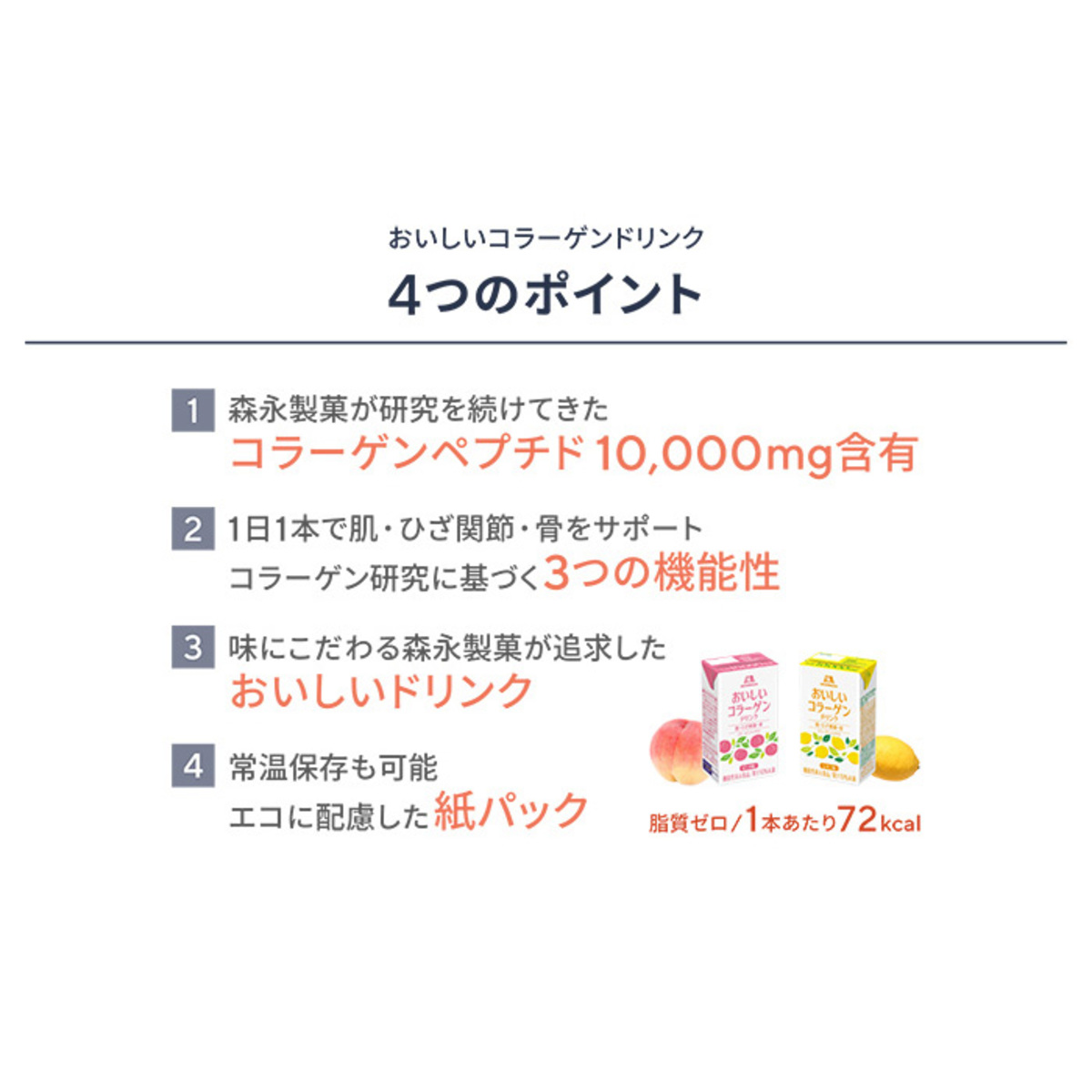 森永製菓のおいしいコラーゲンドリンク。機能性関与成分として、1本(125ml)あたりコラーゲンペプチドを10000mg含有しています