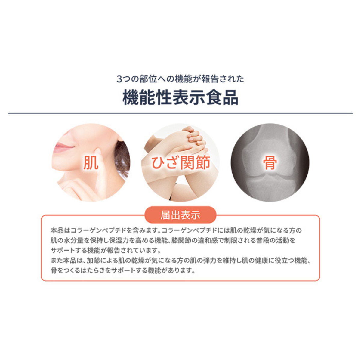 本品はコラーゲンペプチドを含みます。コラーゲンペプチドには肌の乾燥が気になる方の肌の水分量を保持し保湿力を高める機能、膝関節の違和感で制限される普段の活動をサポートする機能が報告されています。また本品は、加齢による肌の乾燥が気になる方の肌の弾力を維持し肌の健康に役立つ機能、骨をつくるはたらきをサポートする機能があります