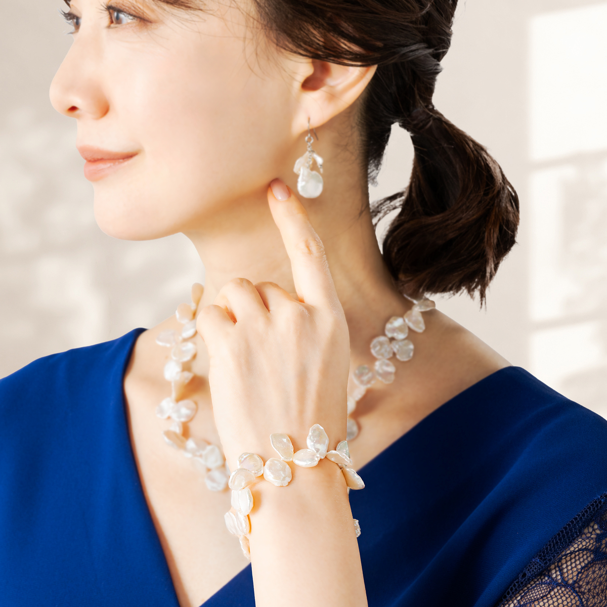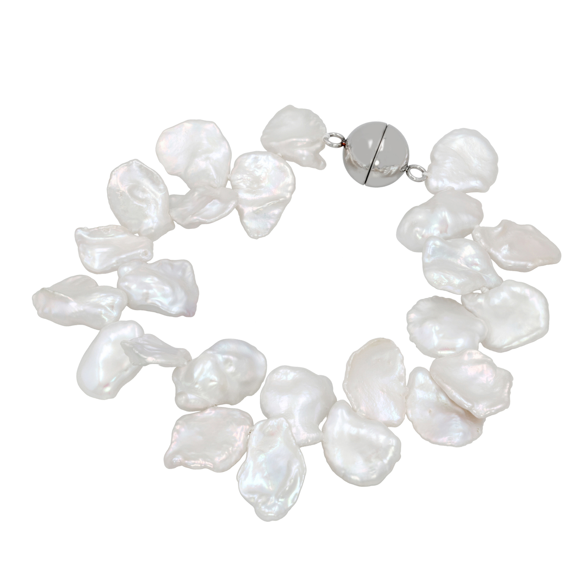 花びらのような形の淡水パールを使ったブレスレット。独特なフォルムが放つ艶やかさをいかした高級感あるデザインで、留め具にはマグネットを使用しています。フォーマルにもカジュアルにも合わせやすく、装いに上品なアクセントを添えます