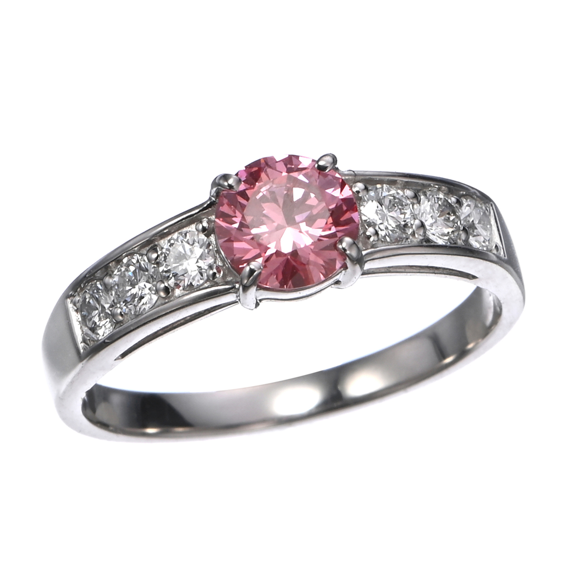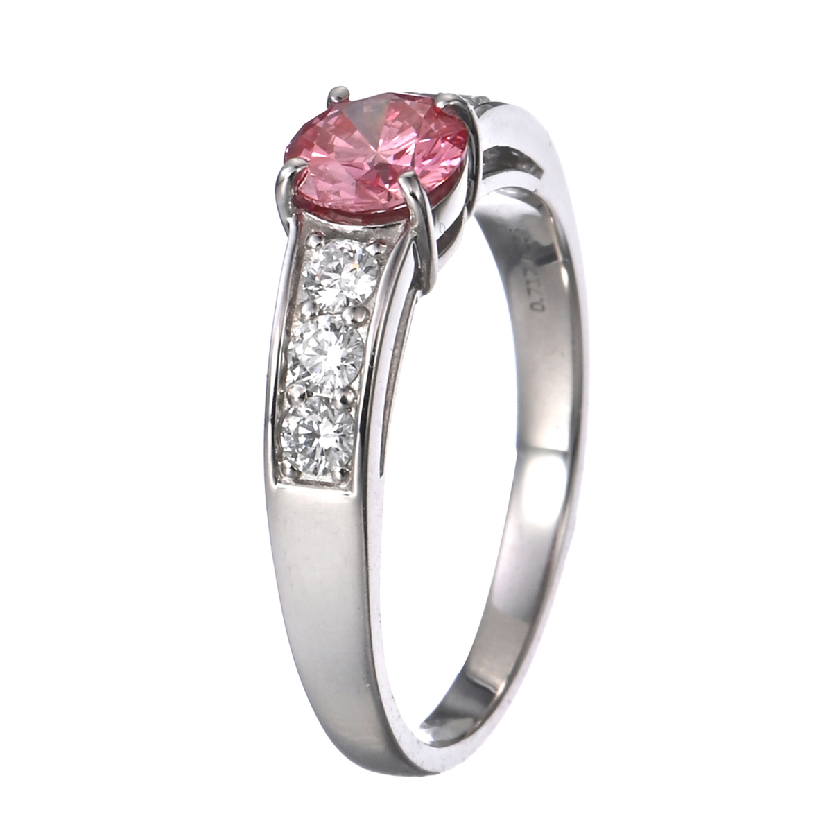 素材:[合成ピンクダイヤモンド] ラウンドブリリアントカット 爪留め 1石 0.70ctUP (カラー:FANCY VIVID PINK/FANCY VIVID PURPLISH PINK/FANCY INTENSE PINK/FANCY INTENSE PURPLISH PINKのいずれか/クラリティ:SI UP) [ダイヤモンド] ラウンドブリリアントカット 爪留め 6石 合計0.30ctUP (カラー:D/クラリティ:VS UP/カット:GOOD UP) 最大幅(約) 5.4mm 最小幅(約) 2.0mm 総重量(約) 4.5g [地金] プラチナ950 [付属品] 鑑定書 ■サイズ直し対象外 ■素材の大きさ・形・色合い、製品のサイズは1点1点多少異なります 【日本製】