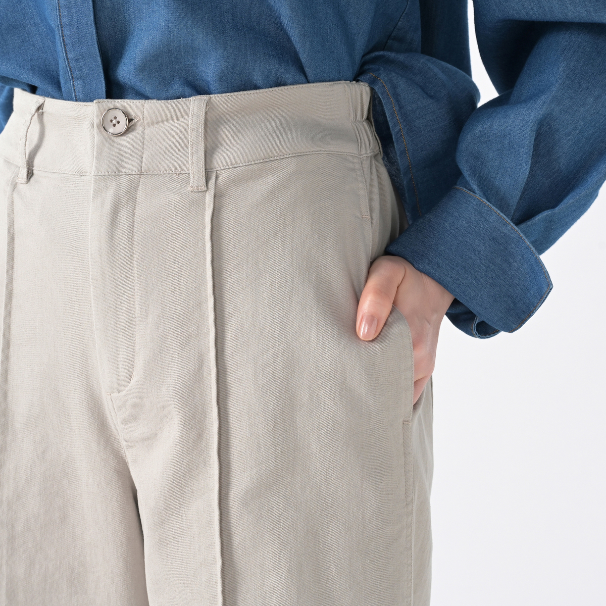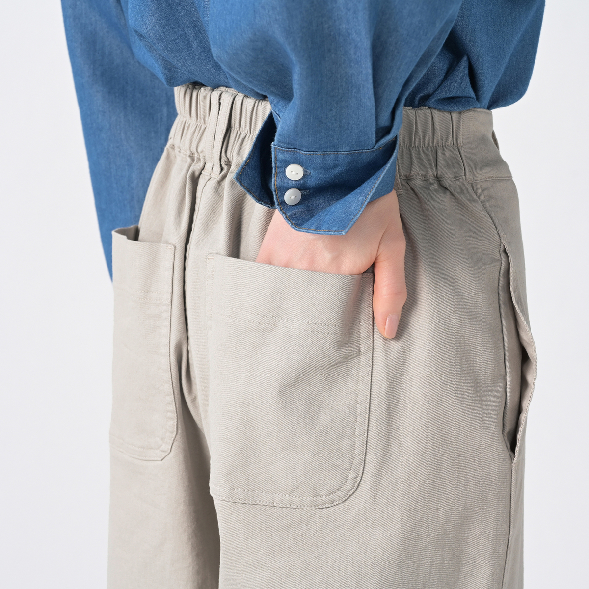 綿とポリエステルを混紡させた糸に、ポリウレタンを引き揃えた布帛素材を使用。綿の肌当たりの良さとポリエステルの発色の良さと軽やかさに、ストレッチ性のある穿き心地の良い生地感です