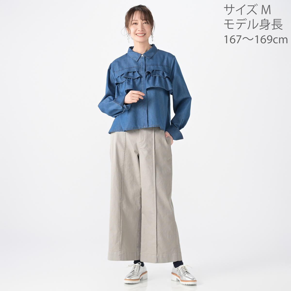 前身頃中心にピンタックシームを入れたワイドパンツ。ピンタックシームを入れることで縦長のIライン効果を演出してくれます。ウエストの後ろ身頃はギャザー入りゴム仕様になった穿き心地です