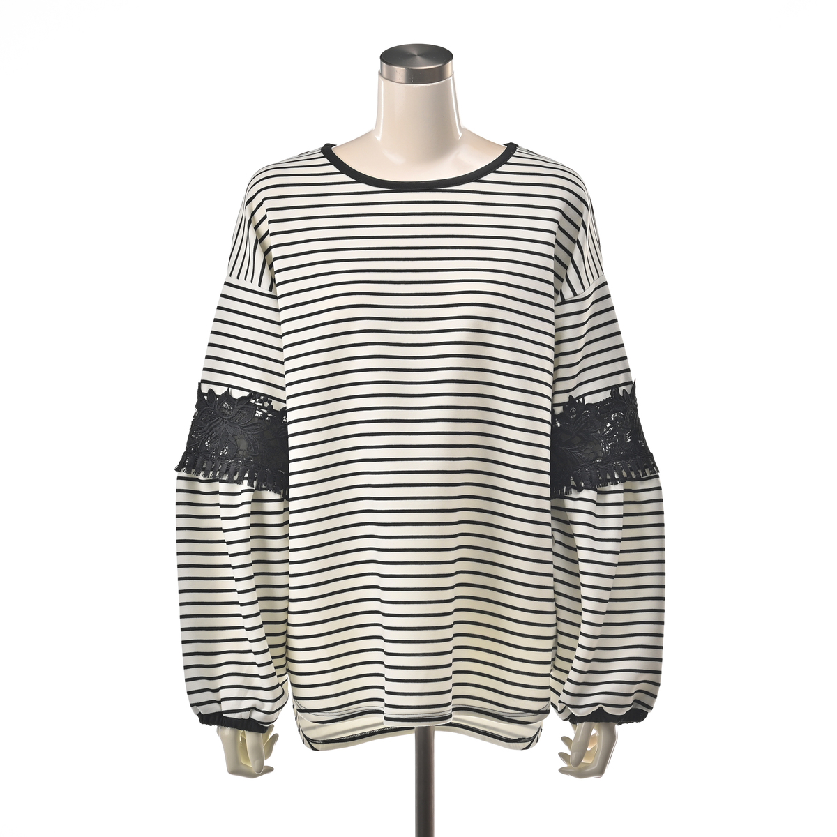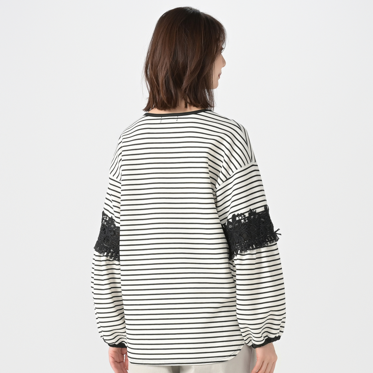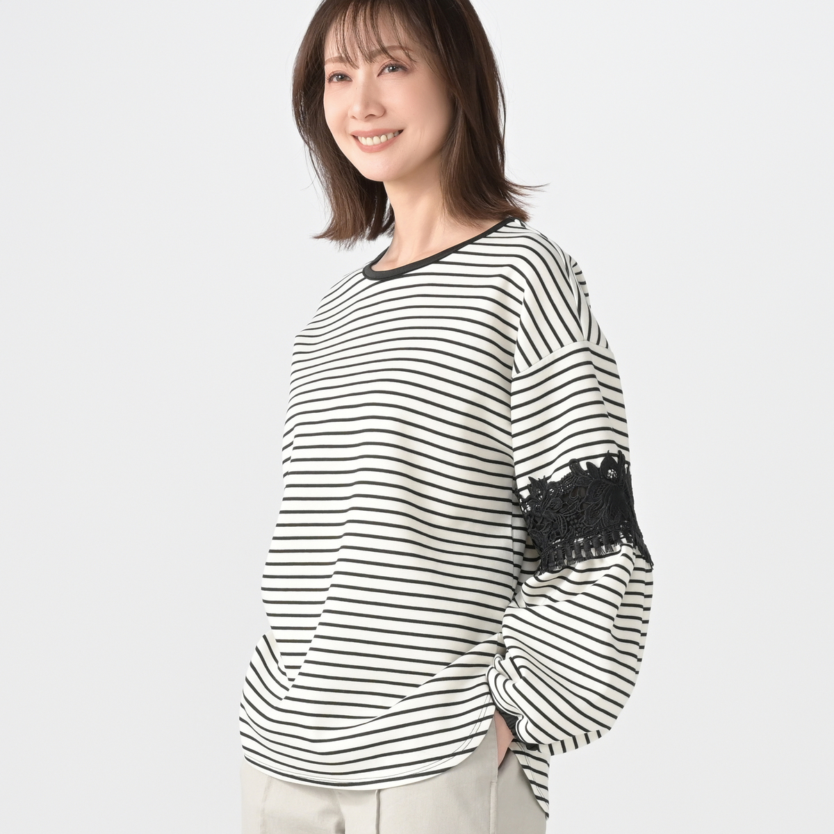 [商品寸法(ヌード)cm] サイズ バスト 着丈 S: 98(72〜80) 68 M: 104(79〜87) 68 L: 110(86〜94) 69 LL: 116(93〜101) 69 3L: 124(100〜108) 69 サイズ 裄丈 S: 74.5 M: 75 L: 76.5 LL: 77 3L: 77.5 [素材] <オフ・ブルー> 本体:ポリエステル93% ポリウレタン7% レース・フリンジ:ポリエステル100% レース裏:ポリエステル100% 衿・袖口:ポリエステル100% <ボーダー> 本体:ポリエステル71% レーヨン23% ポリウレタン6% レース・フリンジ:ポリエステル100% レース裏:ポリエステル100% 衿・袖口:ポリエステル100% [お手入れ] 洗濯機洗い可 [注意事項] ※商品寸法の誤差は多少発生します。ご了承下さい ※洗濯の際には必ずネットを使用して下さい ※洗濯後はすぐに脱水し、形を整えて干して下さい。長時間水につけたままにしないで下さい ※洗濯・クリーニングの際、色落ちすることがありますので他の物と分けて洗って下さい ※濃色製品は着用中の摩擦により色移りすることがあります。また、雨や汗等で濡れた状態で着用すると色移りすることがあります。その際はお早めに洗濯をして下さい ※直射日光や蛍光灯の影響で変色することがありますのでご了承下さい ※デリケートな素材を使用していますので、爪やアクセサリーなどの引っ掛かりによりキズがつきやすくなっております。縫目や生地を強く引っ張らないよう注意して下さい ※素材の特性上、着用や洗濯・クリーニング時の摩擦により毛羽立ち、毛玉が発生します。その際はお早めに毛玉取り器等で手入れをして下さい ※無蛍光洗剤使用 ※アイロンの際は、あて布をご使用下さい ※素材の特性上、肌ざわりがチクチクすることがあります。肌に異常を感じた場合はすぐに使用を中止して下さい 【中国製】