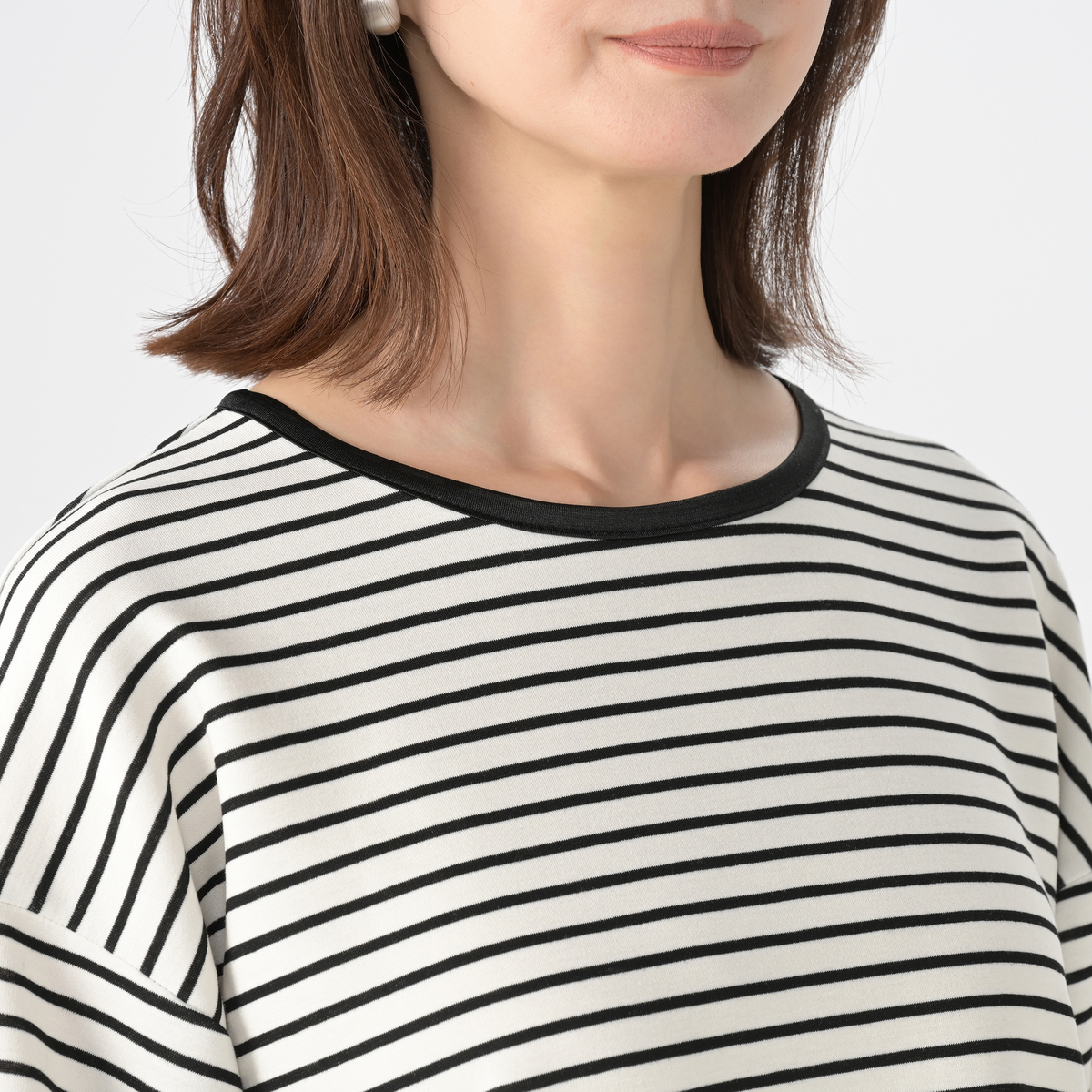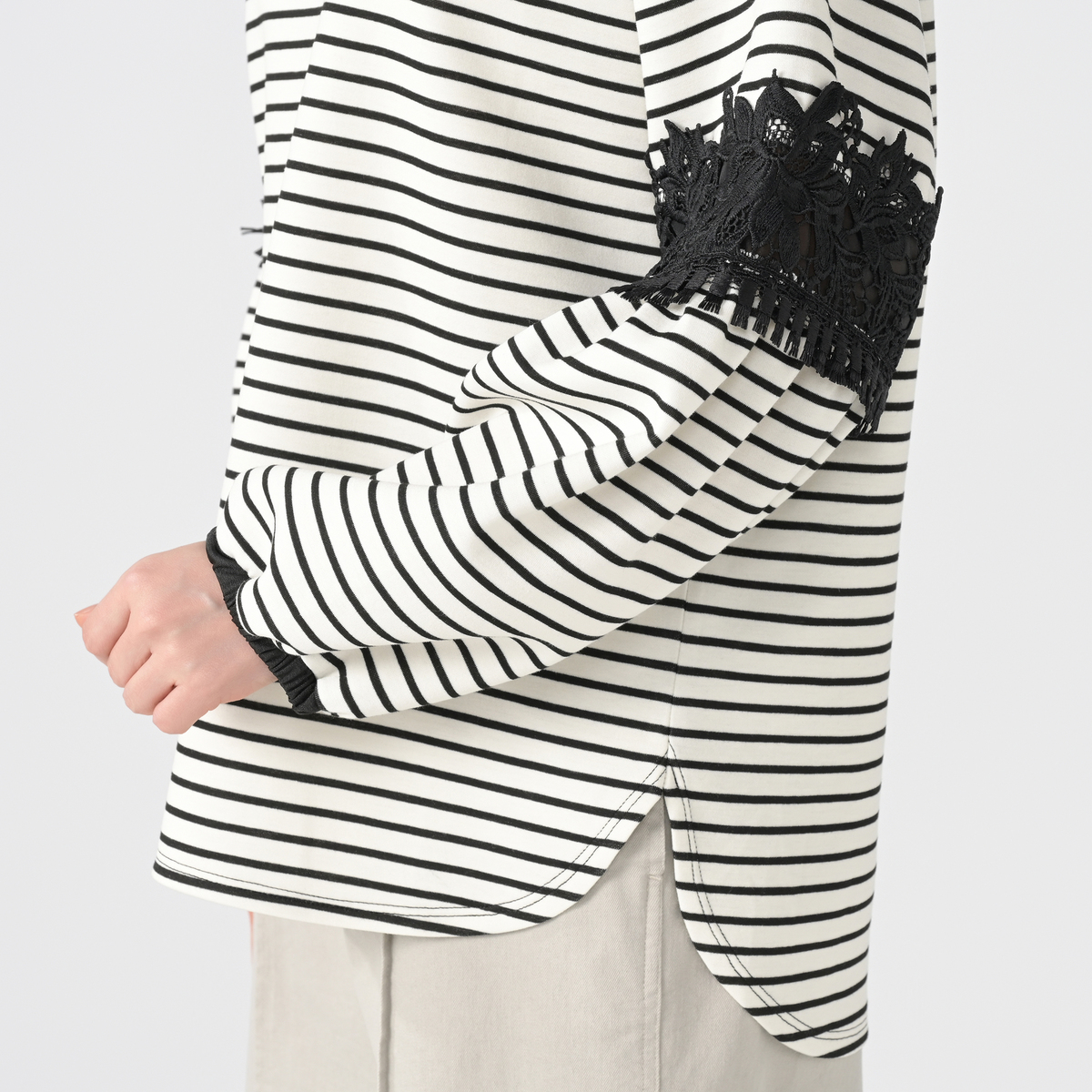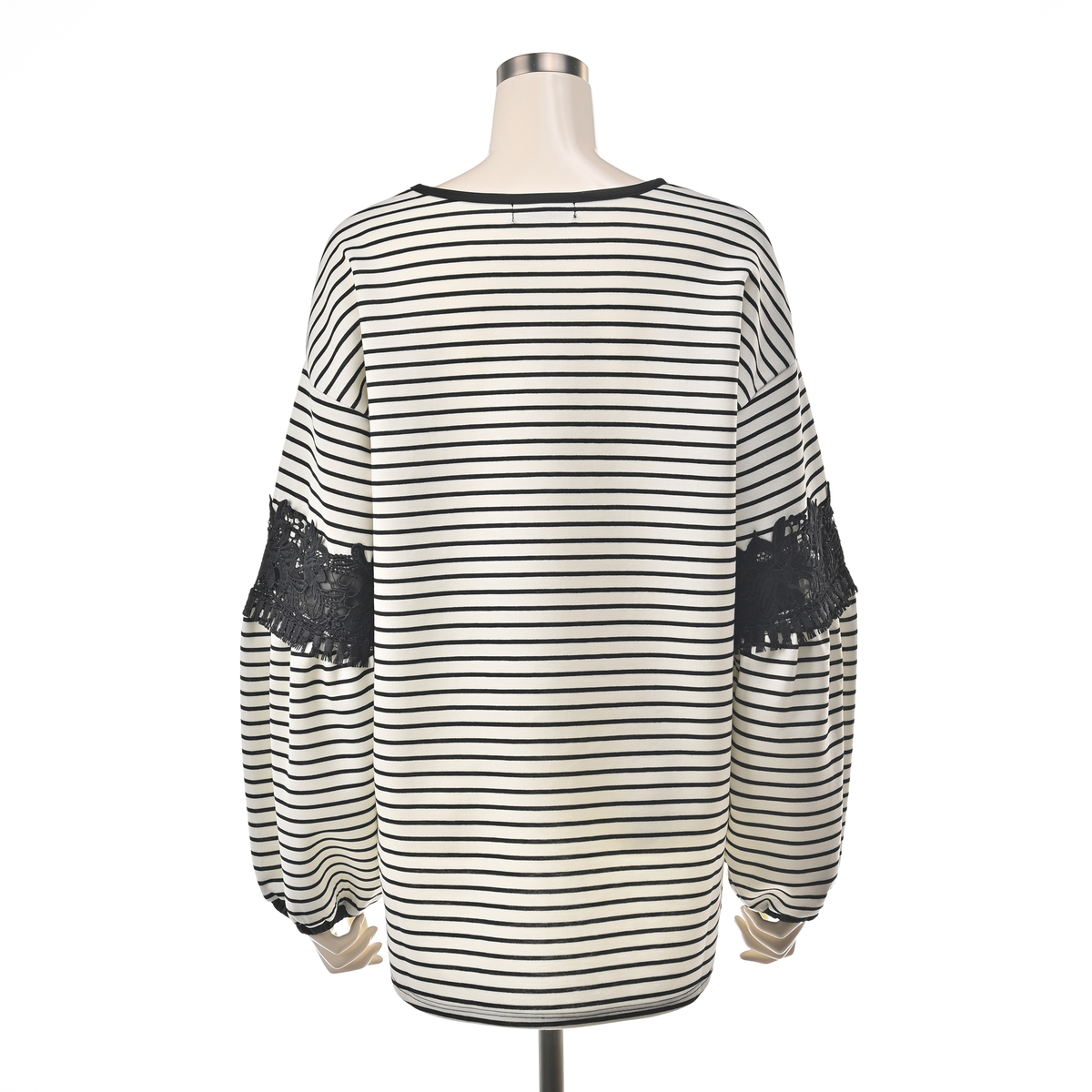 [商品寸法(ヌード)cm] サイズ バスト 着丈 S: 98(72〜80) 68 M: 104(79〜87) 68 L: 110(86〜94) 69 LL: 116(93〜101) 69 3L: 124(100〜108) 69 サイズ 裄丈 S: 74.5 M: 75 L: 76.5 LL: 77 3L: 77.5 [素材] <オフ・ブルー> 本体:ポリエステル93% ポリウレタン7% レース・フリンジ:ポリエステル100% レース裏:ポリエステル100% 衿・袖口:ポリエステル100% <ボーダー> 本体:ポリエステル71% レーヨン23% ポリウレタン6% レース・フリンジ:ポリエステル100% レース裏:ポリエステル100% 衿・袖口:ポリエステル100% [お手入れ] 洗濯機洗い可 [注意事項] ※商品寸法の誤差は多少発生します。ご了承下さい ※洗濯の際には必ずネットを使用して下さい ※洗濯後はすぐに脱水し、形を整えて干して下さい。長時間水につけたままにしないで下さい ※洗濯・クリーニングの際、色落ちすることがありますので他の物と分けて洗って下さい ※濃色製品は着用中の摩擦により色移りすることがあります。また、雨や汗等で濡れた状態で着用すると色移りすることがあります。その際はお早めに洗濯をして下さい ※直射日光や蛍光灯の影響で変色することがありますのでご了承下さい ※デリケートな素材を使用していますので、爪やアクセサリーなどの引っ掛かりによりキズがつきやすくなっております。縫目や生地を強く引っ張らないよう注意して下さい ※素材の特性上、着用や洗濯・クリーニング時の摩擦により毛羽立ち、毛玉が発生します。その際はお早めに毛玉取り器等で手入れをして下さい ※無蛍光洗剤使用 ※アイロンの際は、あて布をご使用下さい ※素材の特性上、肌ざわりがチクチクすることがあります。肌に異常を感じた場合はすぐに使用を中止して下さい 【中国製】