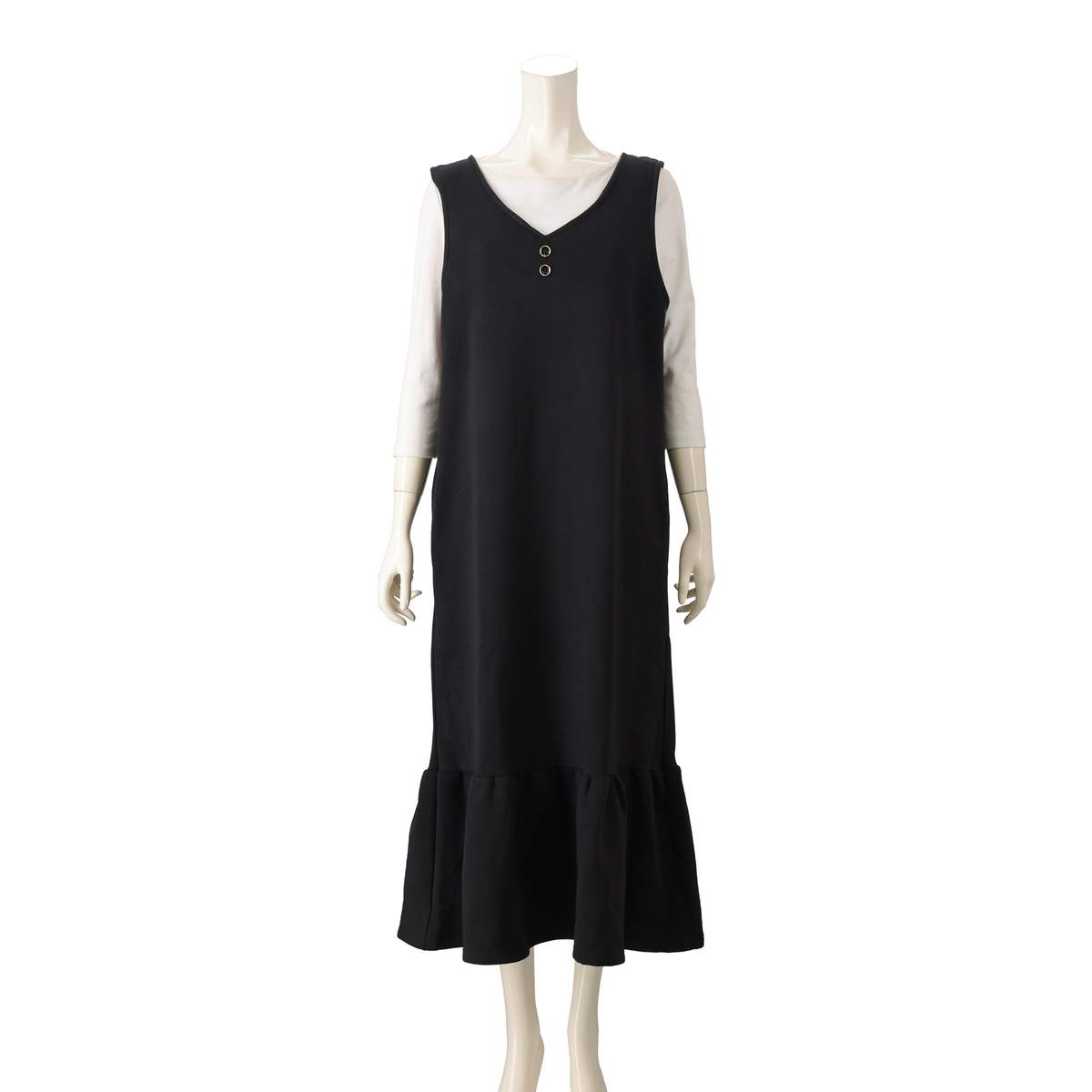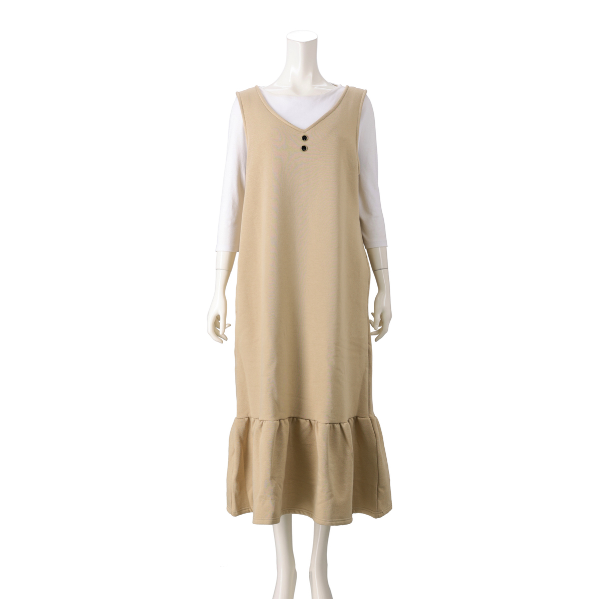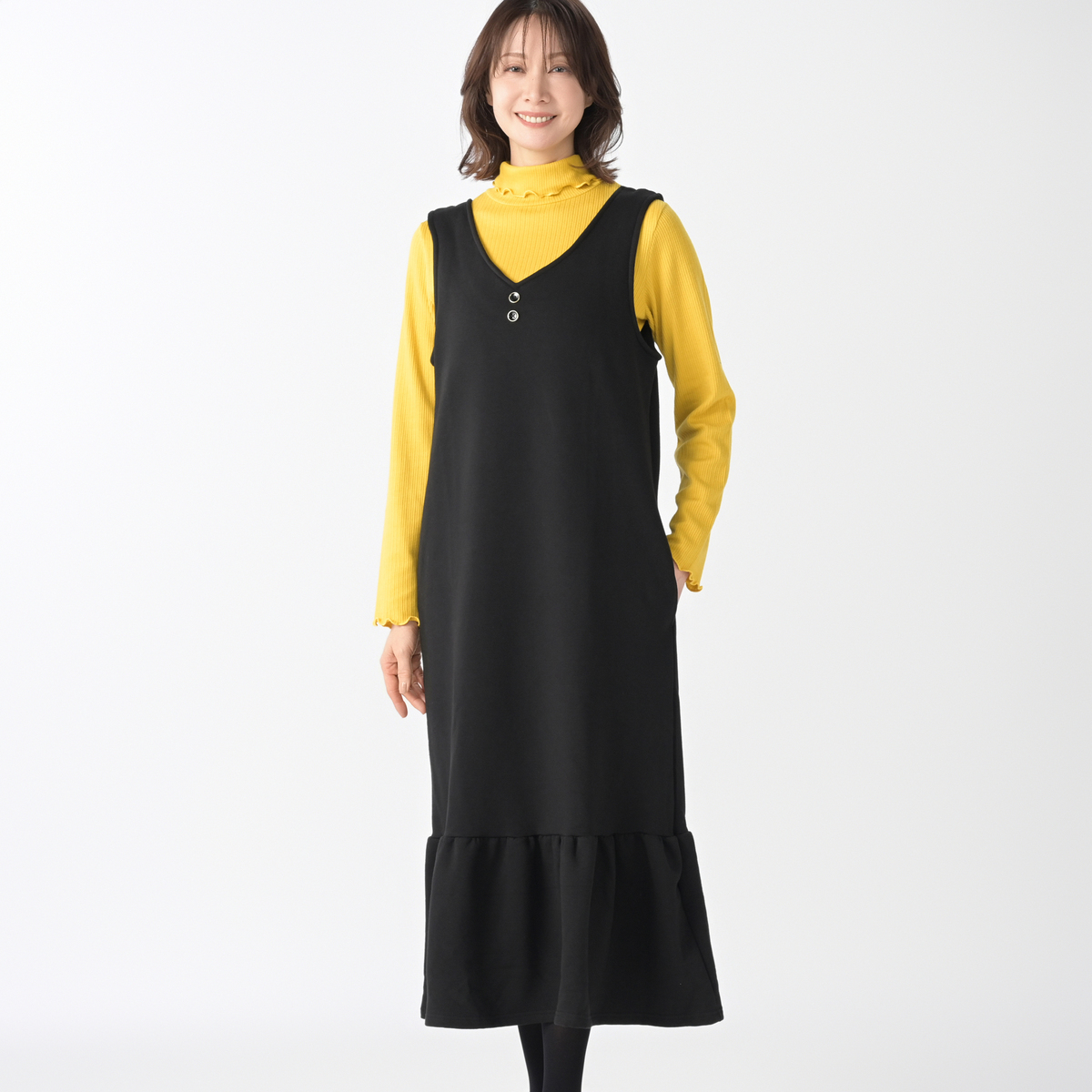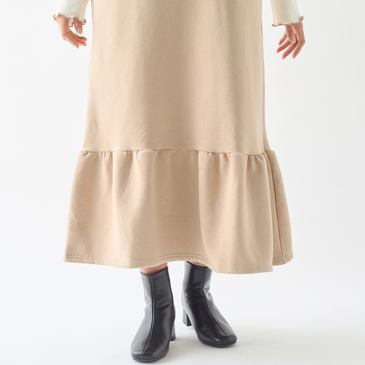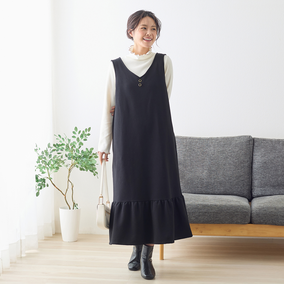 裾にあしらった大きめのフリルギャザーが、シンプルながらも華やかな印象を演出するジャンパースカート。お手持ちのトップスと合わせるだけで、おしゃれなルームウェアコーディネートが完成します