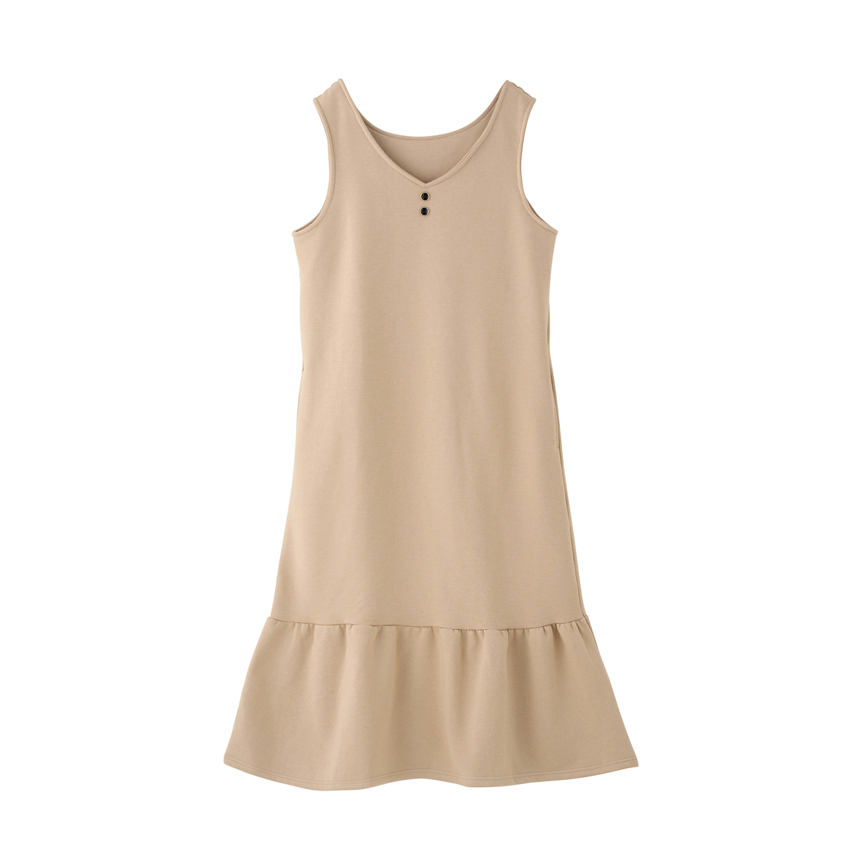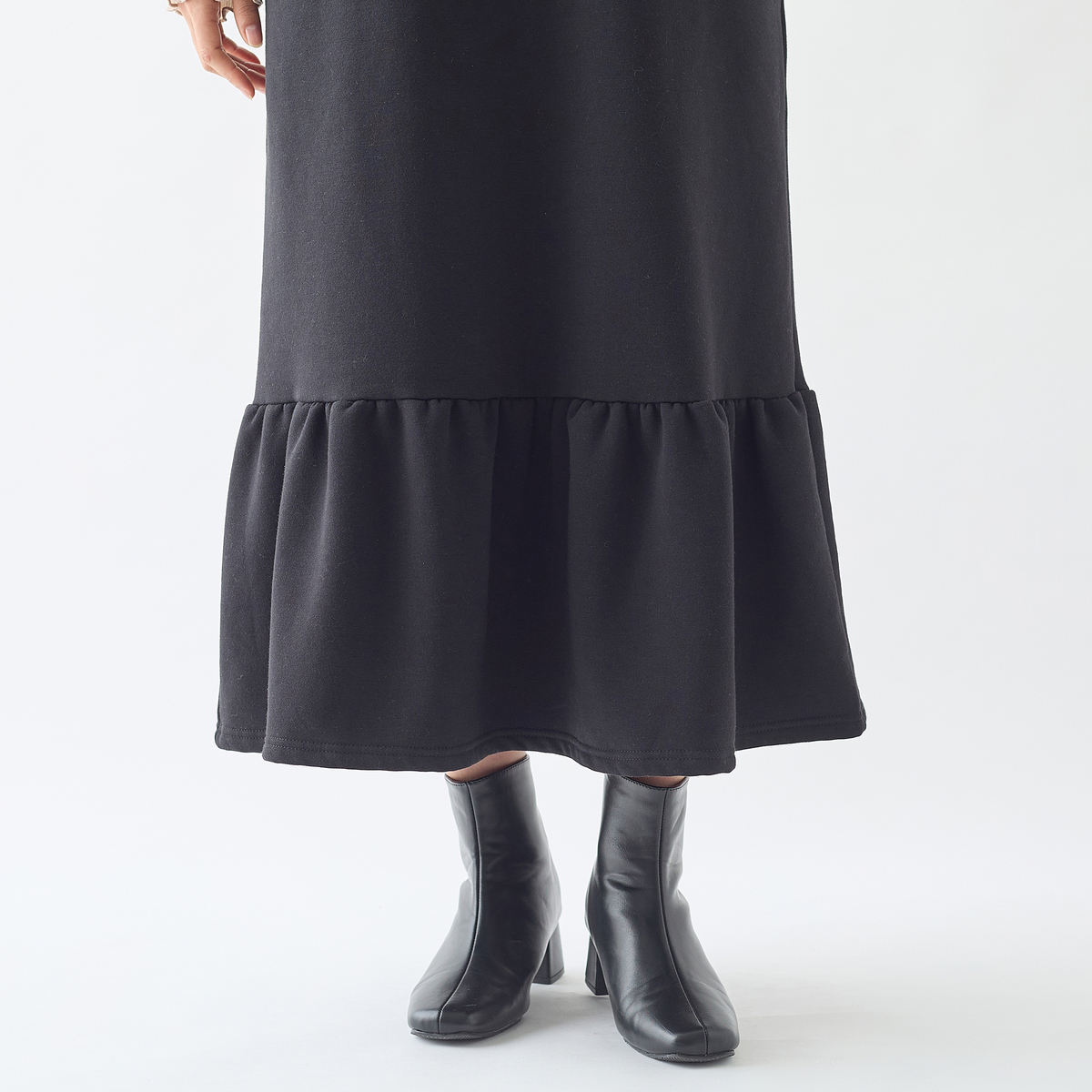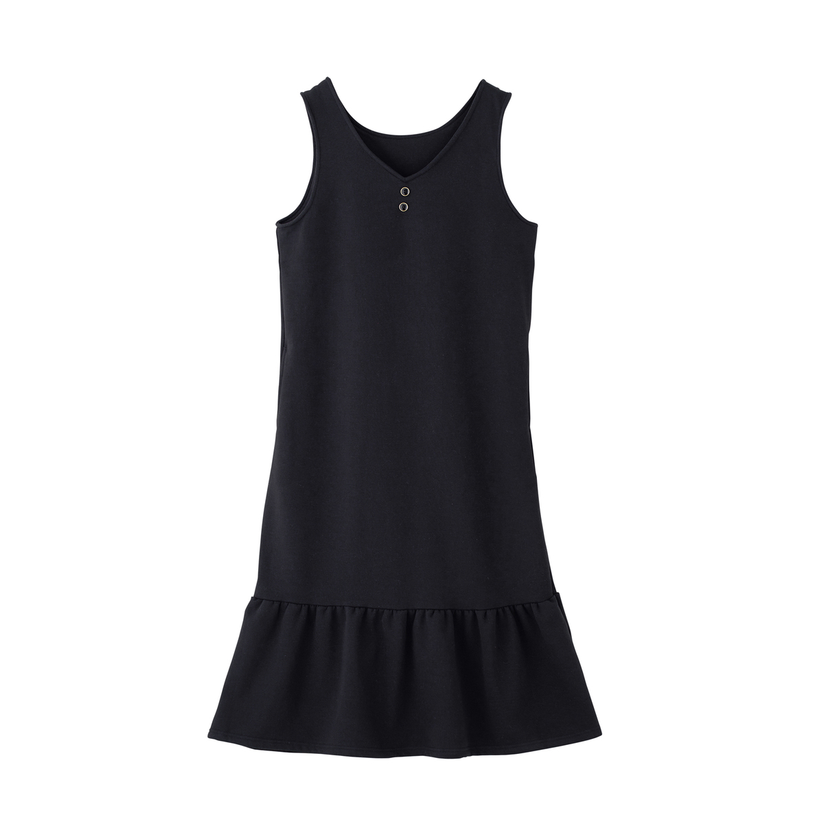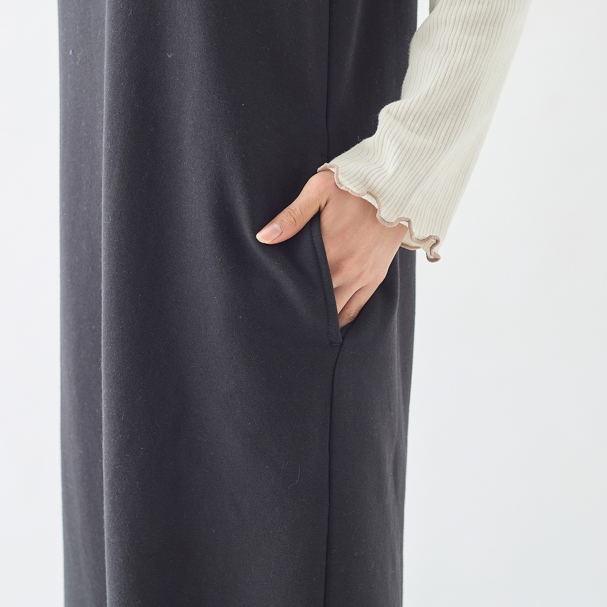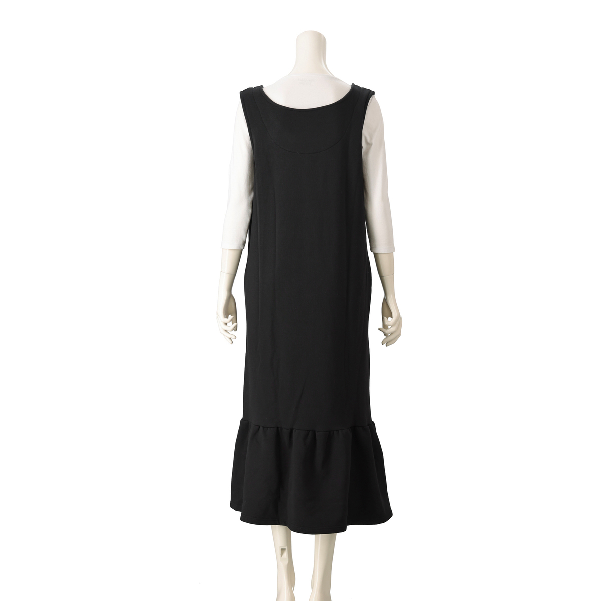 裾にあしらった大きめのフリルギャザーが、シンプルながらも華やかな印象を演出するジャンパースカート。お手持ちのトップスと合わせるだけで、おしゃれなルームウェアコーディネートが完成します
