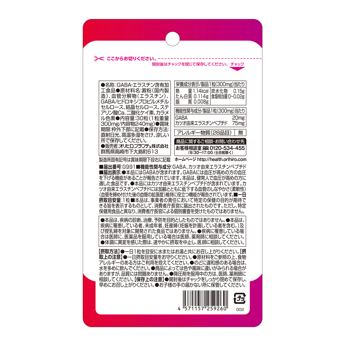 [アレルギー物質特定原材料8品目] なし [内容量] 30粒 [目安量] 1日1粒 [お召し上がり方] 1日1粒を目安に水またはお湯と共にお召し上がりください 機能性表示食品 ※機能性関与成分/製品 1粒(300mg)当たり GABA 20mg カツオ由来エラスチンペプチド75mg [届出番号]G991 [届出表示] 本品には GABA が含まれます。GABA には血圧が高めの方の血圧を下げる機能があることが報告されています。 本品は、健常人で血圧が高めの方に適した食品です。 本品にはカツオ由来エラスチンペプチドが含まれています。カツオ由来エラスチンペプチドには加齢とともに低下する血管のしなやかさ(柔軟性)(血管を締め付けた後の血管の拡張度)維持に役立つ機能が報告されています。 [保存方法] ・直射日光、高温多湿をさけ、涼しい所で保存してください ・お子様の手の届かない所に保管してください [注意事項] ※本品は、疾病の診断、治療、予防を目的としたものではありません ※本品は、疾病に罹患している者、未成年者、妊産婦(妊娠を計画している者を含む)及び授乳婦を対象に開発された食品ではありません ※疾病に罹患している場合は医師に、医薬品を服用している場合は医師、薬剤師に相談してください ※降圧剤を服用中の方は、医師、薬剤師に相談してください ※本品は、事業者の責任において特定の保健の目的が期待できる旨を表示するものとして、消費者庁長官に届出されたものです。ただし、特定保健用食品と異なり、消費者庁長官による個別審査を受けたものではありません ※一日摂取目安量をお守りください ※原材料をご参照の上、食物アレルギーのある方はご利用を控えてください ※のどに違和感のある場合は、水を多めに飲んでください ※商品によっては色や風味に違いがみられる場合がありますが、品質には問題ありません ※開封後はチャックをしっかり閉めて保存し、早めにお召し上がりください ※体調に異変を感じた際は、速やかに摂取を中止し、医師に相談してください [原料原産地] 澱粉(国内製造) [原産国] 日本 [原材料] 澱粉(国内製造)、血管分解物(エラスチン)、GABA/ヒドロキシプロピルメチルセルロース、結晶セルロース、ステアリン酸 Ca、二酸化ケイ素、カラメル色素