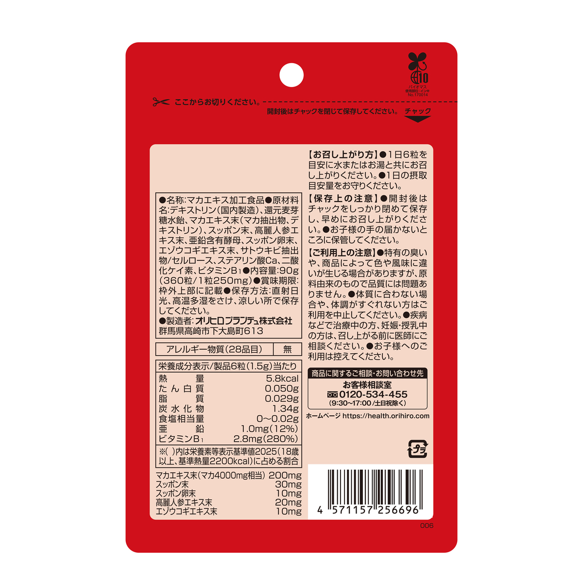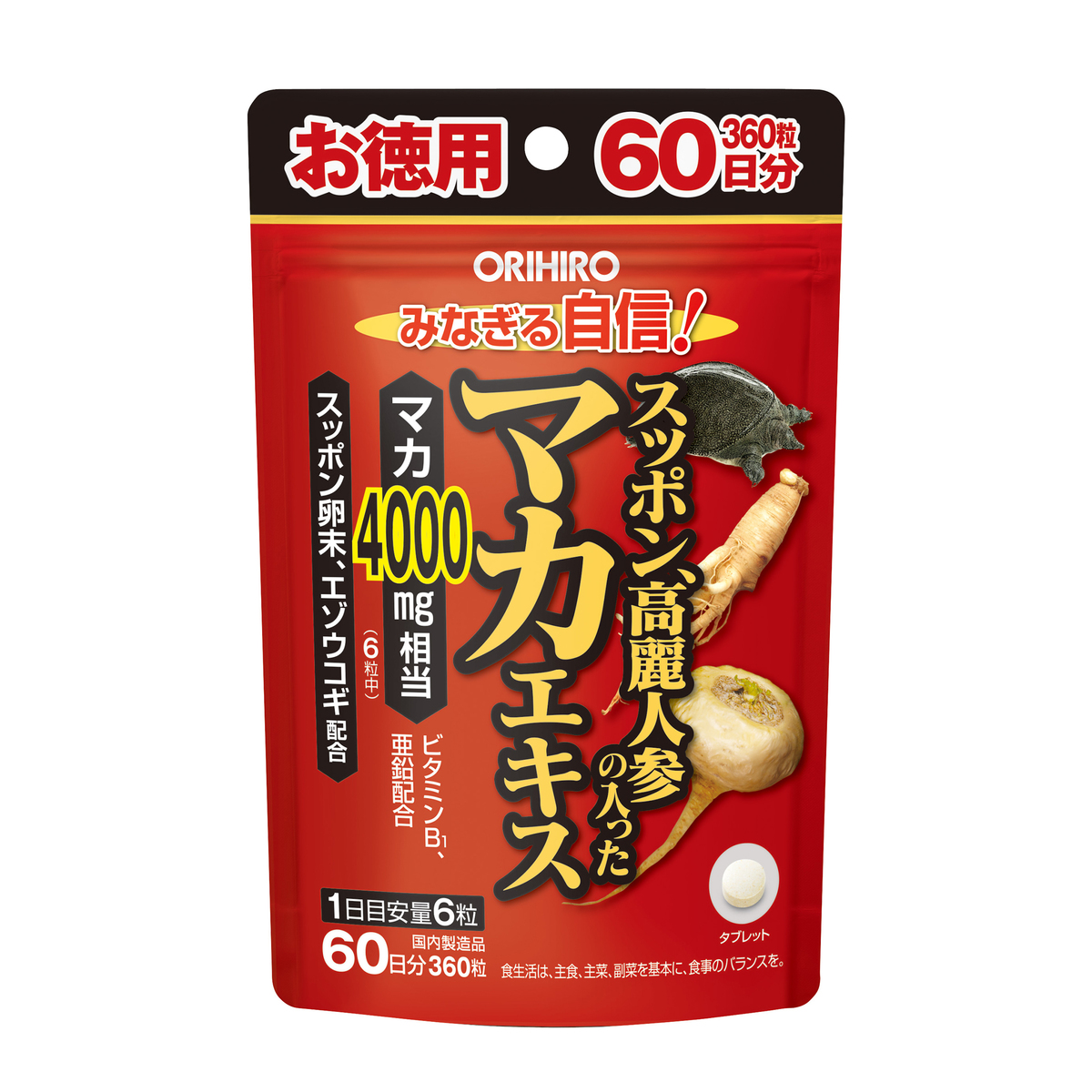 [アレルギー物質特定原材料8品目] なし [内容量] 360粒 [目安量] 1日6粒 [お召し上がり方] 1日6粒を目安に水またはお湯と共にお召し上がりください [保存方法] 直射日光、高温多湿をさけ、涼しい所で保存してください [注意事項] ※疾病などで治療中の方、妊娠・授乳中の方は、召し上がる前に医師にご相談ください ※1日の摂取目安量をお守りください ※直射日光、高温多湿をさけ、涼しい所で保存してください ※開封後はチャックをしっかり閉めて保存し、早めにお召し上がりください ※お子様の手の届かないところに保管してください ※特有の臭いや、商品によって色や風味に違いが生じる場合がありますが、原料由来のもので品質には問題ありません ※体質に合わない場合や、体調がすぐれない方はご利用を中止してください ※疾病などで治療中の方、妊娠・授乳中の方は、召し上がる前に医師にご相談ください ※お子様へのご利用は控えてください ※食生活は、主食、主菜、副菜を基本に、食事のバランスを [原料原産地] デキストリン(国内製造) [原産国] 日本 [原材料] デキストリン(国内製造)、還元麦芽糖水飴、マカエキス末(マカ抽出物、デキストリン)、スッポン末、高麗人参エキス末、亜鉛含有酵母、スッポン卵末、エゾウコギエキス末、サトウキビ抽出物/セルロース、ステアリン酸Ca、二酸化ケイ素、ビタミン B1