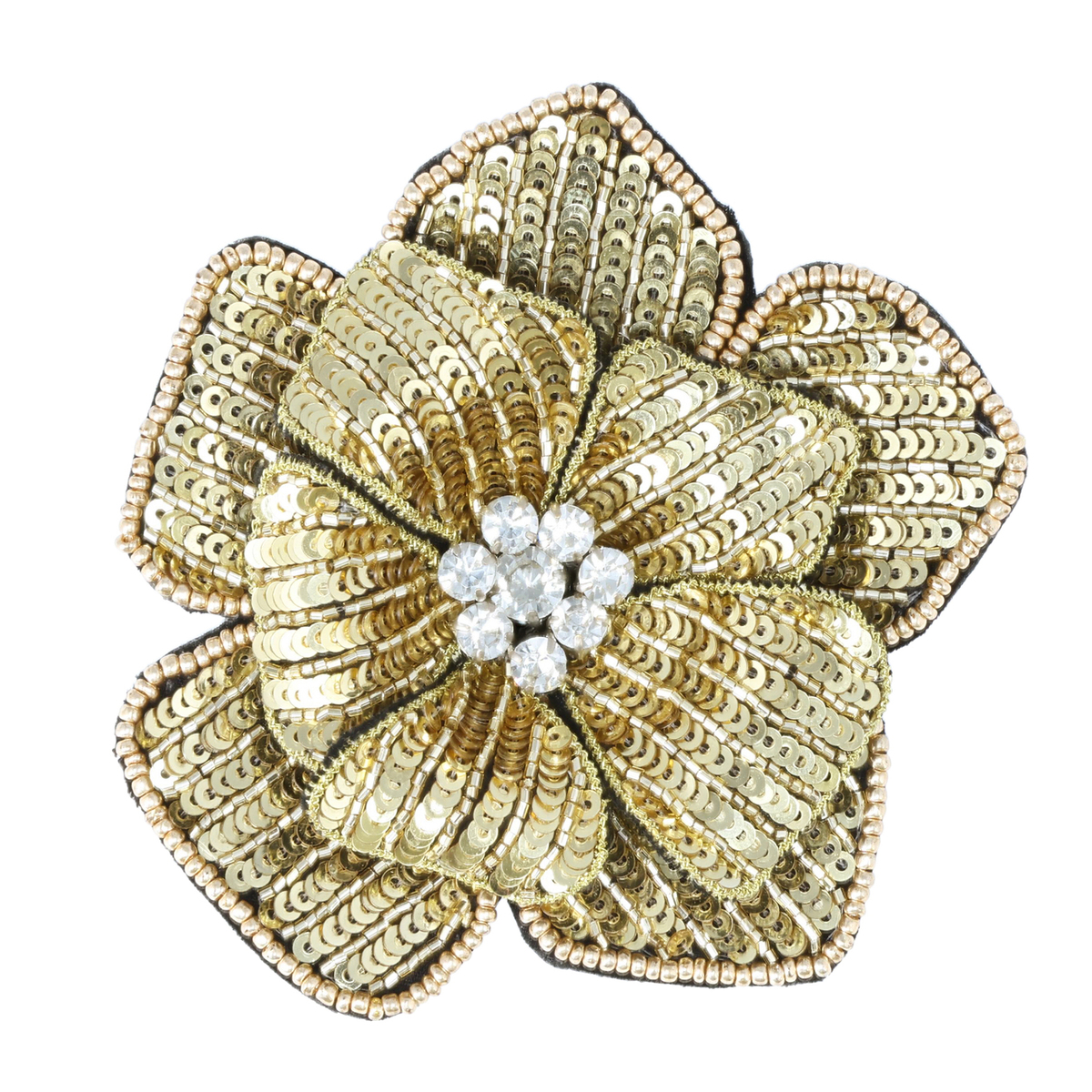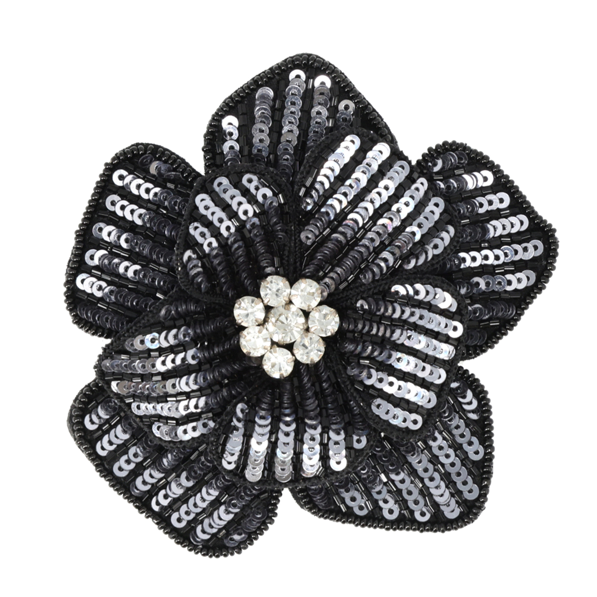 花モチーフにスパンコールを散りばめたマグネットブローチ。中央のカットガラスが煌めきを添え、視線を集めます。衣類に穴を開けずに装着でき、ジャケットやバッグ、帽子などに簡単に取り付け可能。使わないときはインテリアとして飾っても楽しめます