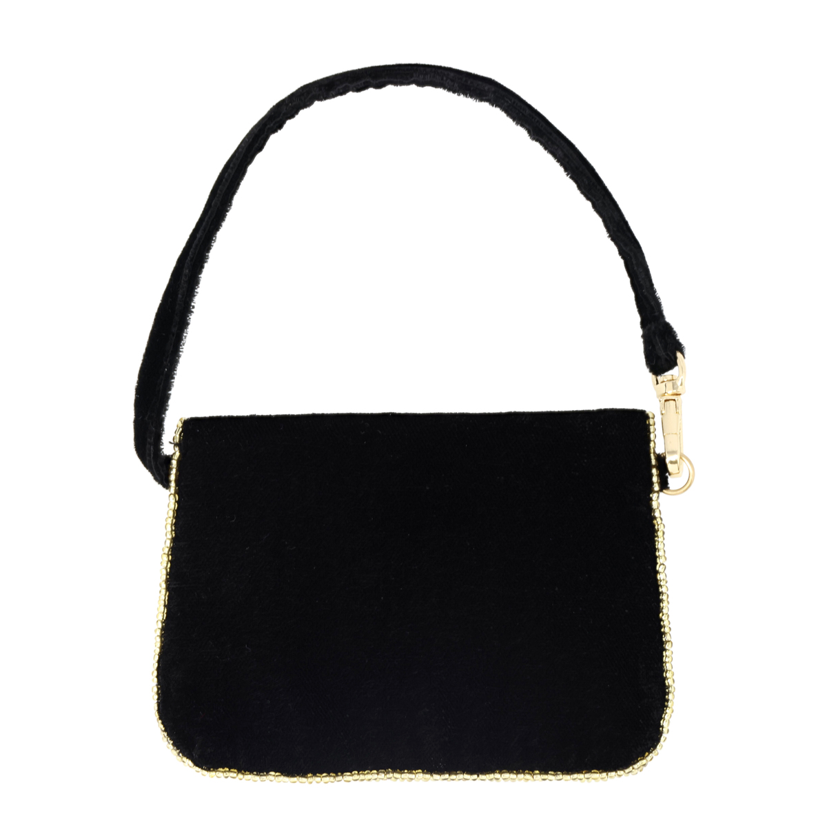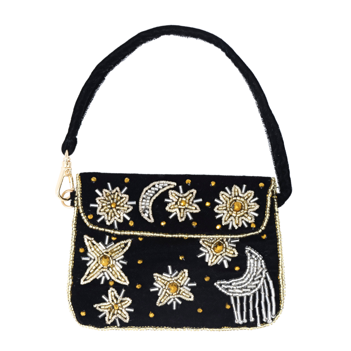 ブラックベルベット調素材のバッグチャーム。ゴールドカラーとシルバーカラーのビーズで繊細に描かれた星や三日月が、幻想的な輝きを放ちます