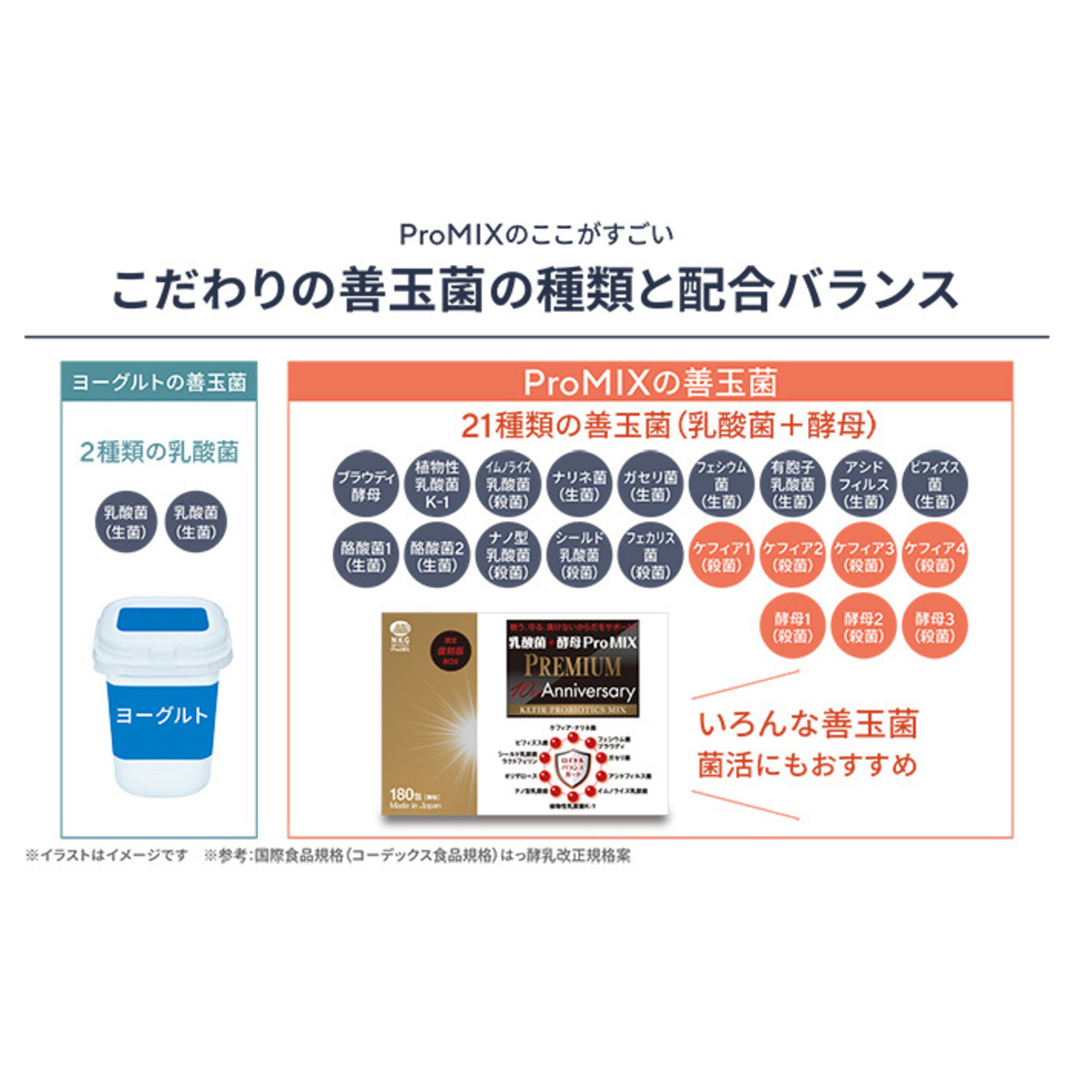 厳選した成分をこだわりの種類とバランスで配合した「乳酸菌+酵母ProMIX」。10周年記念バージョンでお届けします