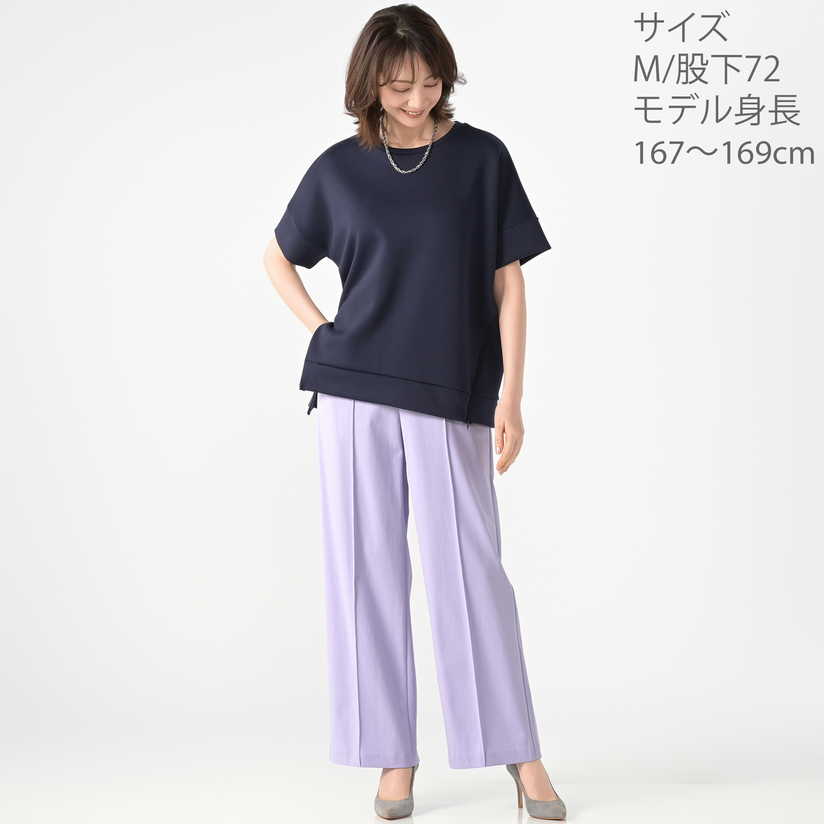 縦のラインを強調した極細ピンタック入りで、細見え、脚長見せ効果が期待。素材は見た目や触感にも立体感がある鹿の子組織。またポリウレタン糸にはライクラ(R)を使用。360度全方向にしっかり伸縮するので快適な穿き心地を実現させます