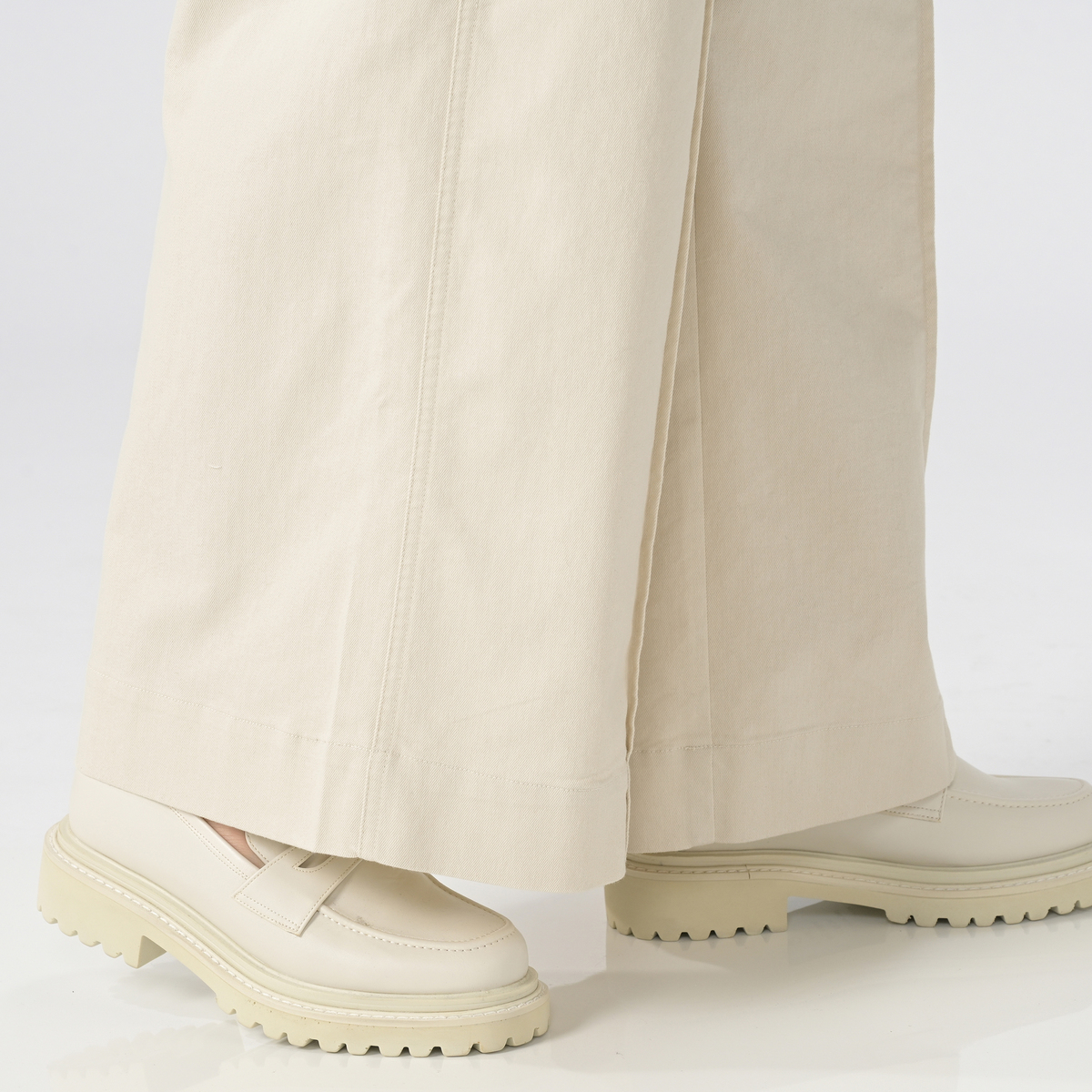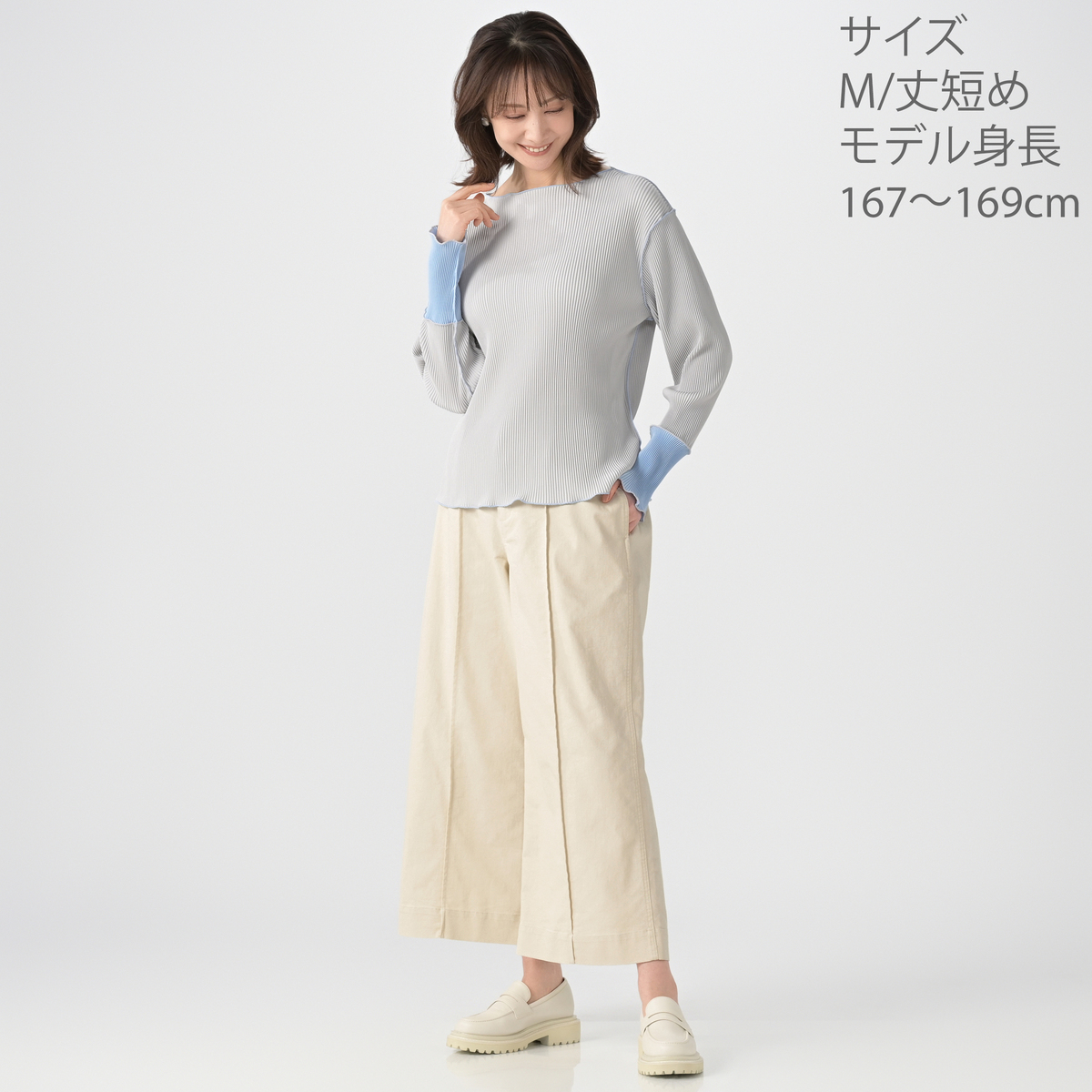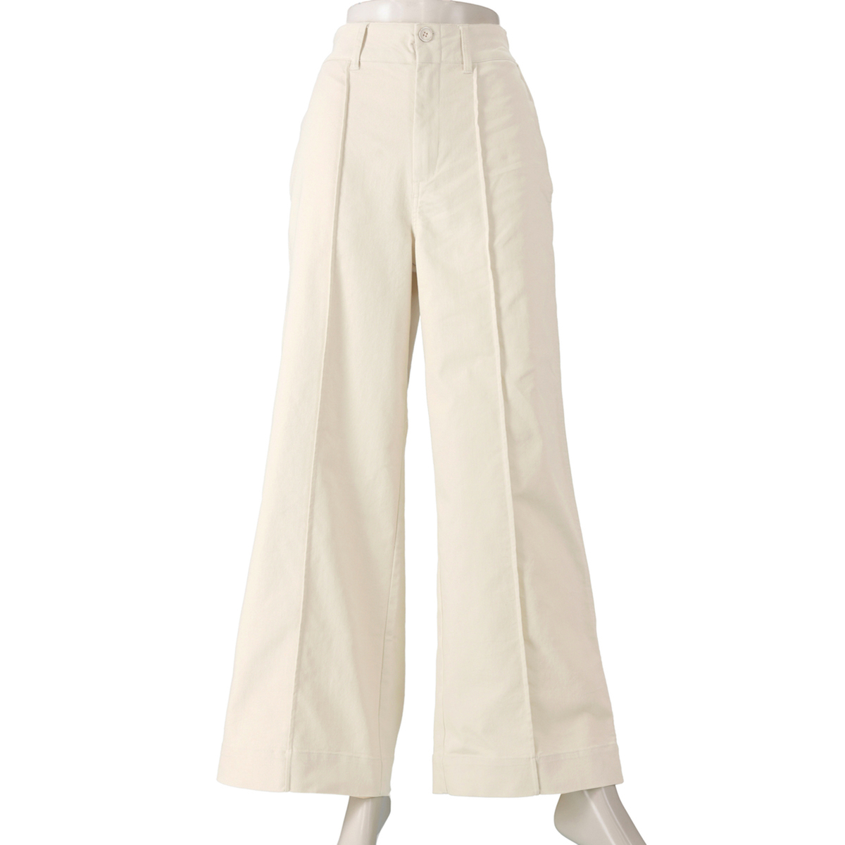 前身頃中心にピンタックシームを施したワイドパンツ。Iラインが際立ち、きれいめな印象に仕上げました