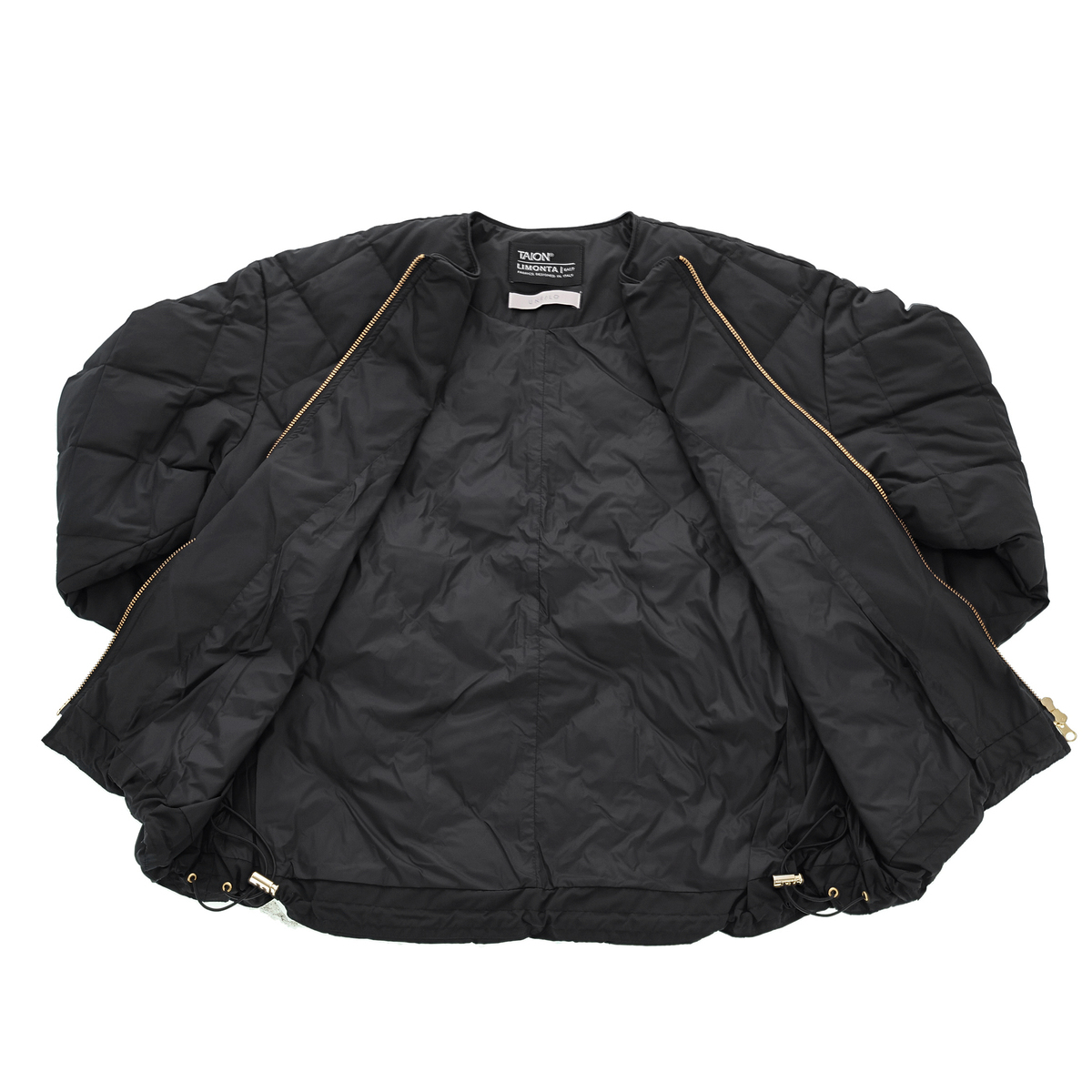 ゴールドファスナーがシンプルなデザインに華やかさを添えます。裾のスピンドルでシルエットを調整でき、絞ると立体感のある着こなしになります