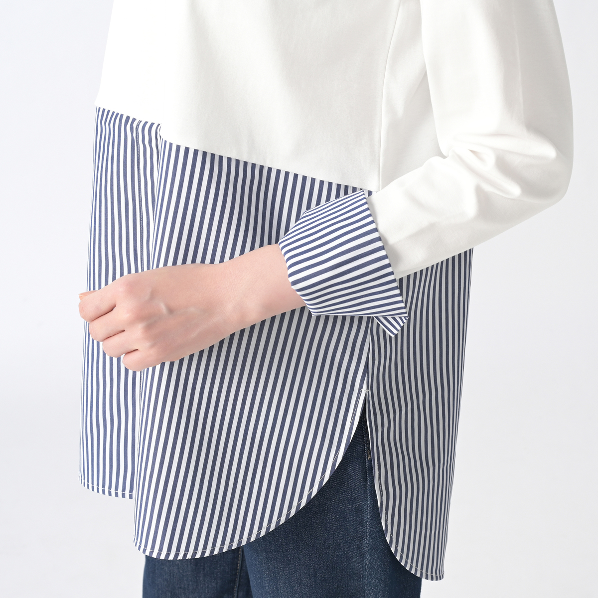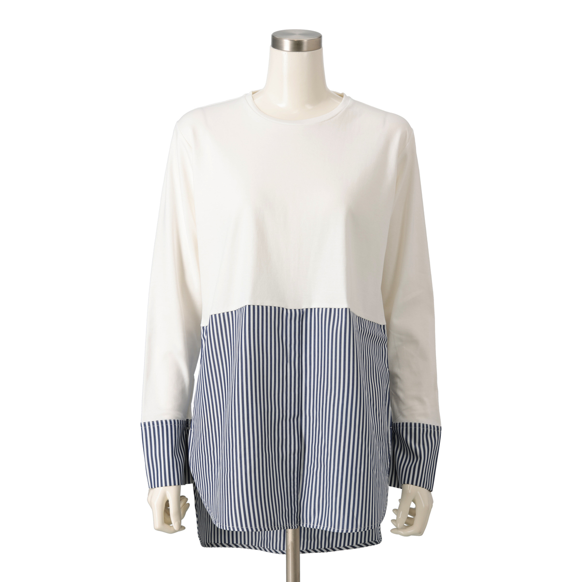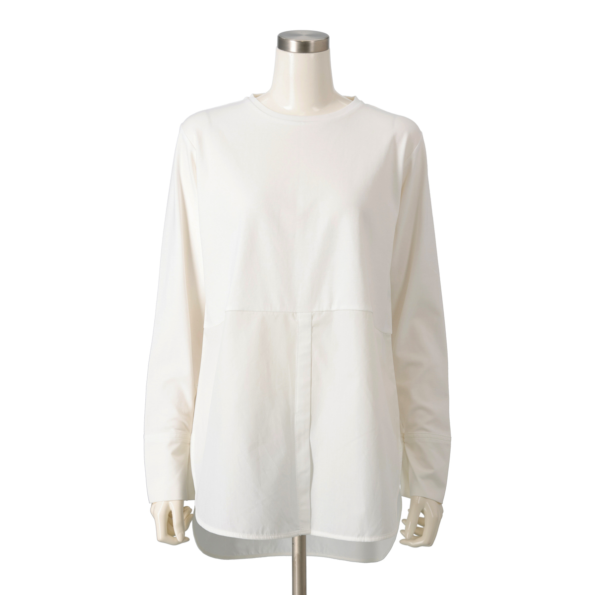 レイヤードスタイルを格上げするカットソー。ロンTにカフスとシャツの裾をドッキングし、スウェットやニットにインするだけでこなれ感のあるシャツ見えが叶います。柔らかな着心地で重ねても快適、前後差のある丈が腰回りを自然にカバーします