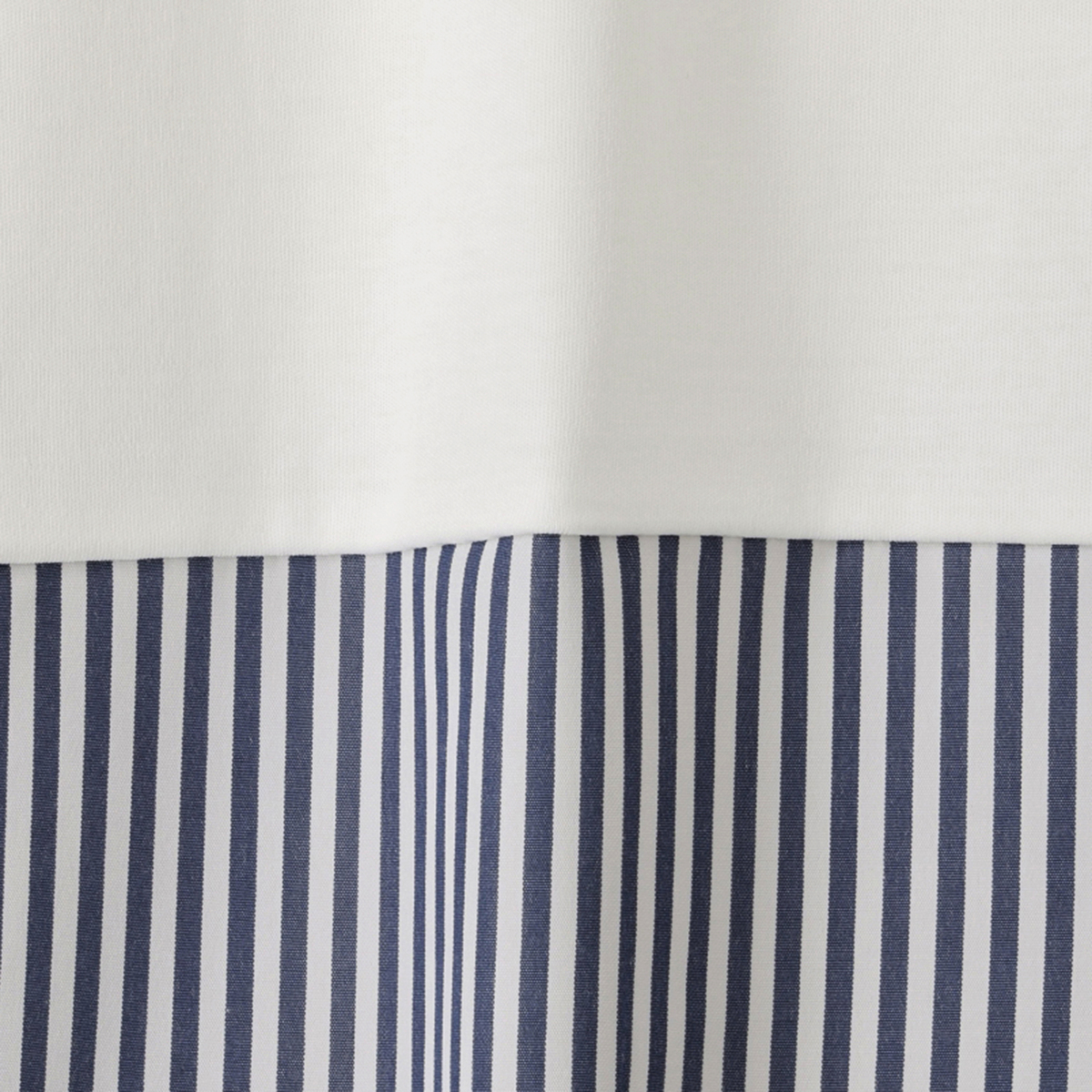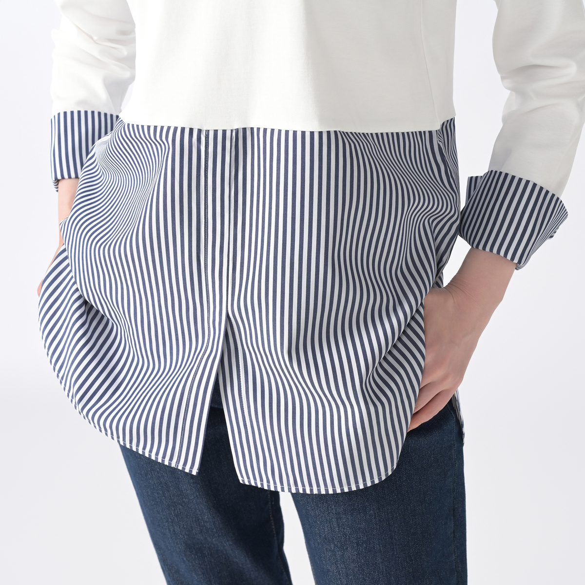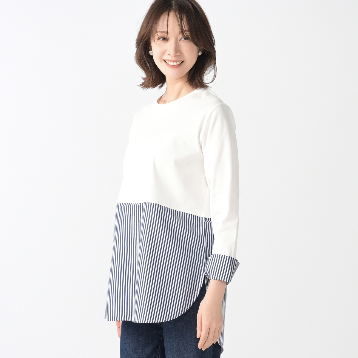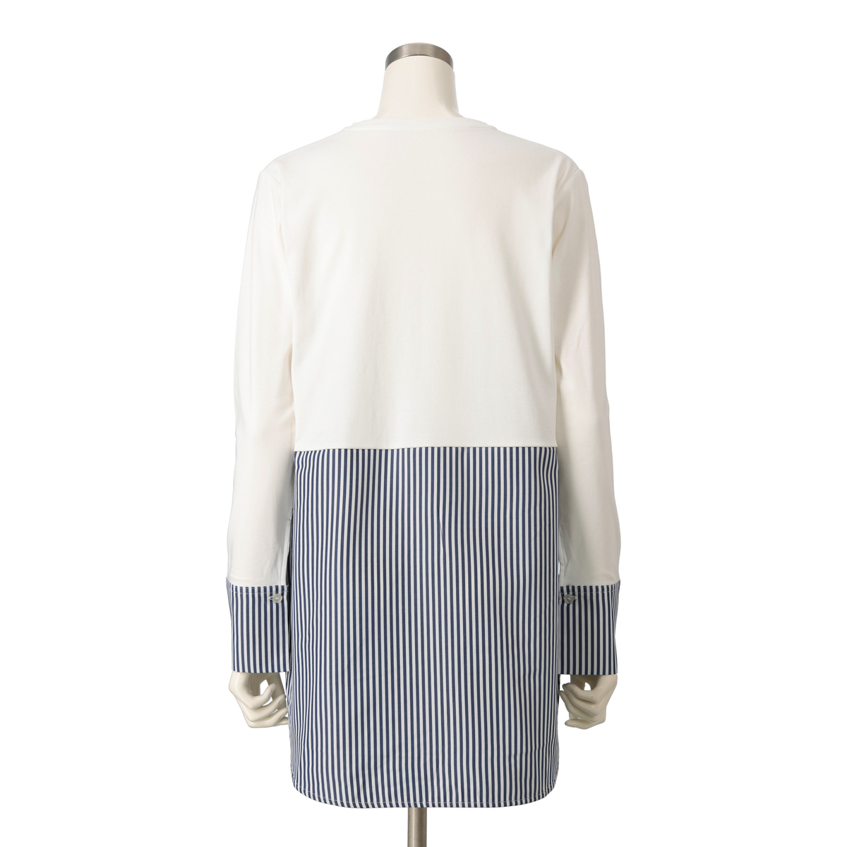 レイヤードスタイルを格上げするカットソー。ロンTにカフスとシャツの裾をドッキングし、スウェットやニットにインするだけでこなれ感のあるシャツ見えが叶います。柔らかな着心地で重ねても快適、前後差のある丈が腰回りを自然にカバーします