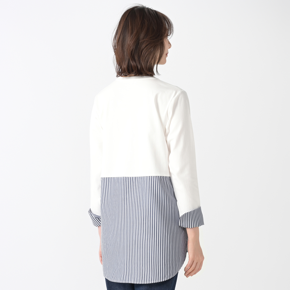 [商品寸法(ヌード)cm] サイズ バスト 着丈 S: 90(77〜81) 74 M: 94(81〜85) 78 L: 98(85〜89) 79 XL: 102(89〜93) 80 サイズ 肩幅 袖丈 S: 35 56.5 M: 37 58.5 L: 39 59 XL: 41 59.5 [素材] <ホワイト> 本体:綿100% 別布:ポリエステル69%、レーヨン31% <ストライプ> 本体:綿100% 別布:ポリエステル88%、レーヨン12% [お手入れ] 洗濯機洗い可 [注意事項] ※商品寸法の誤差は多少発生します。ご了承下さい ※ネット使用 ※淡色のものは無蛍光洗剤を使用 ※よくすすぎ、絞りの後すぐに干すこと ※濃色の物は、着用による摩擦で色落ちすることがありますので、組み合わせの衣服にご注意ください。また、淡色の物とは別にお洗いください 【ベトナム製】