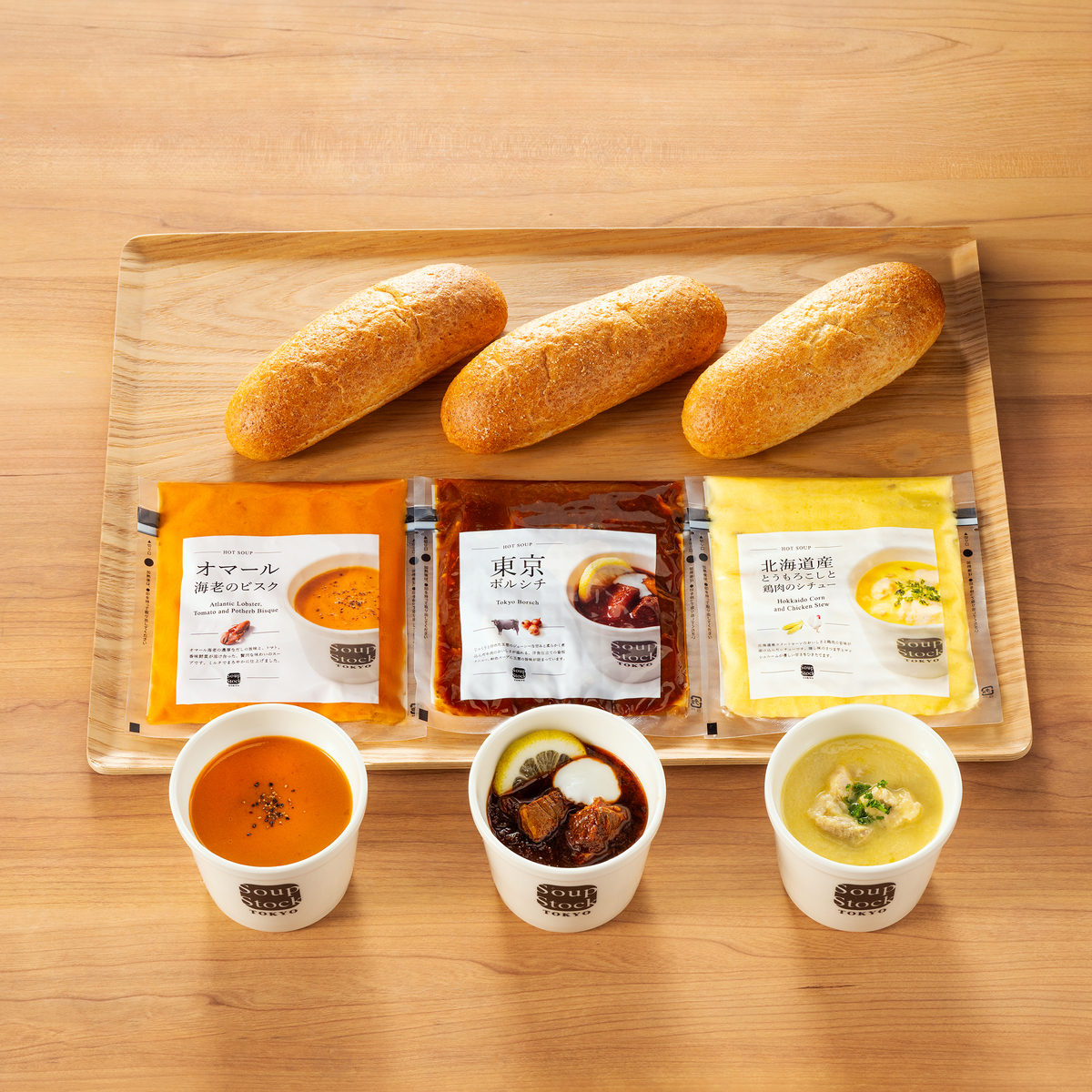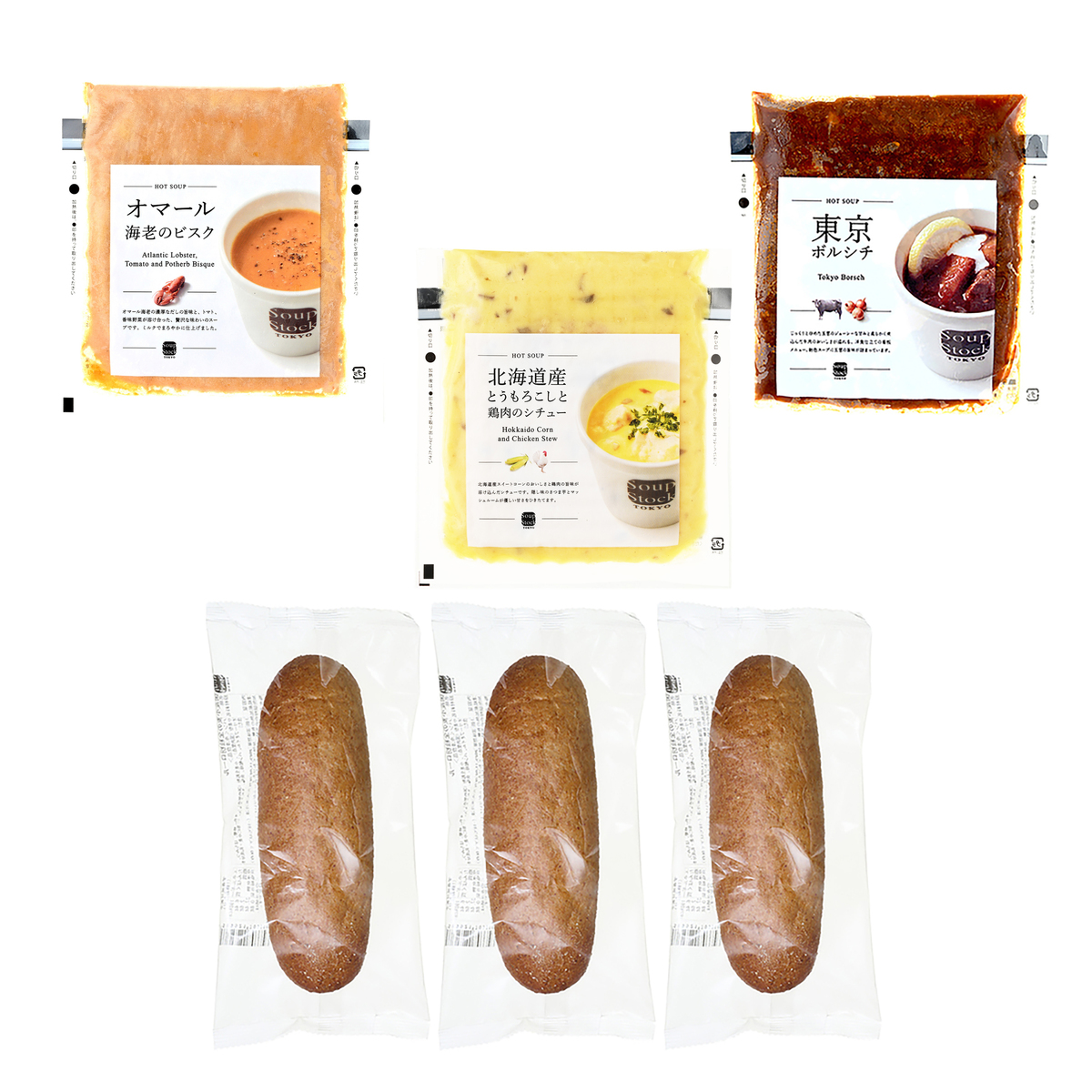 [アレルギー物質特定原材料8品目] 小麦、乳、えび、かに <オマール海老のビスク・全粒粉ロール> ※はちみつを使用しておりますので1歳未満のお子さまには与えないでください。 [商品内容] ・オマール海老のビスク ・東京ボルシチ ・北海道産とうもろこしと鶏肉のシチュー 各180g ・国産小麦の全粒粉ロール×3個 [賞味期限] 出荷時点で賞味期限まで以下の日数がある商品をお届けします スープ:180日 全粒粉ロール:120日 [保存方法] <スープ> 開封前:冷凍(ー18℃以下)で保存してください 開封後:開封後はすぐにお召し上がりください <国産小麦の全粒粉ロール> 開封前:冷凍(ー18℃以下)で保存してください 開封後:開封、解凍後は当日中にお召し上がりください [お召し上がり方] <スープ> 電子レンジで温める場合: ・凍ったまま開封せずに蒸気吹出口を上にしてお皿にのせ、電子レンジに入れ、500w 4分30秒、600w 4分を目安に加熱してください ・加熱中は、袋が膨らみますが、一定以上に膨らむと蒸気が吹き出し口から抜けてしぼみます ・加熱終了後はお皿に袋をのせたまま取り出し、蒸気吹き出し口を上にして、切り口部を開封してください 湯煎での加熱方法: ・凍ったまま開封をせずに袋ごと、沸騰したお湯の中で約5分間温めてください。鍋にフタはしないでください <国産小麦の全粒粉ロール> ・自然解凍でもお召し上がり頂けますが、30分〜90分自然解凍後、トースター等で2〜3分焼くとより美味しくお召し上がりいただけます ・お使いのトースター機種により時間は加減してください [原料原産地] オマール海老のビスク:オマール海老ブイヨン〔オマールエビヘッド、野菜(玉葱、人参、セロリ、にんにく、パセリ)、トマトペースト、ワイン、トマト・ピューレーづけ、ブランデー、オリーブ油、大豆油、酢漬けタラゴン、食塩、香辛料〕(国内製造) 東京ボルシチ:ソテー野菜〔野菜(玉葱、人参、セロリ、にんにく)、牛脂、菜種油〕(国内製造) シチュー:鶏肉(ブラジル) 全粒粉ロール:小麦粉(国内製造)、小麦全粒粉(国内製造) [原産国] 日本 [注意事項] <スープ> ※加熱しすぎると品質が劣化、分離する場合があります ※商品は冷凍室(ー18℃以下)で保存してください ※一度解凍したものを再凍結しないでください ※開封後はすぐにお召し上がりください ※開封時に袋のフチ手を切らないようにご注意ください <オマール海老のビスク> ※はちみつを使用しておりますので、1歳未満のお子様には与えないでください <国産小麦の全粒粉ロール> ※はちみつを使用しておりますので1歳未満のお子さまには与えないでください ※解凍後は当日中にお召し上がりください [原材料] 東京ボルシチ:ソテー野菜〔野菜(玉葱、人参、セロリ、にんにく)、牛脂、菜種油〕(国内製造)、牛肉、トマトペースト、ビーフエキス、チキンブイヨン、食塩、醤油、香辛料 / カラメル色素、(一部に小麦・牛肉・大豆・鶏肉を含む) 国産小麦の全粒粉ロール:小麦粉(国内製造)、小麦全粒粉(国内製造)、牛乳、砂糖、はちみつ、オリーブオイル、パン酵母、食塩、モルトエキス、(一部に小麦・乳成分を含む) オマール海老のビスク:野菜(玉葱、人参、セロリ、にんにく)、オマール海老ブイヨン〔オマールエビヘッド、野菜(玉葱、人参、セロリ、にんにく、パセリ)、トマトペースト、ワイン、トマト・ピューレーづけ、ブランデー、オリーブ油、大豆油、酢漬けタラゴン、食塩、香辛料〕(国内製造)、牛乳、クリーム、トマトペースト、ワイン、澱粉、ホタテブイヨン、バター、豚脂、カニブイヨン、食塩、はちみつ、ブランデー、香辛料、(一部に乳成分・えび・かに・大豆・豚肉を含む) 北海道産とうもろこしと鶏肉のシチュー:鶏肉(ブラジル)、牛乳、コーンペースト、クリーム、さつま芋、チキンブイヨン、ルー(小麦粉、パーム油)、マッシュルームソース、ソテーオニオン(玉葱、菜種油)、食塩、澱粉、香辛料、(一部に乳成分・小麦・えび・牛肉・大豆・鶏肉を含む)