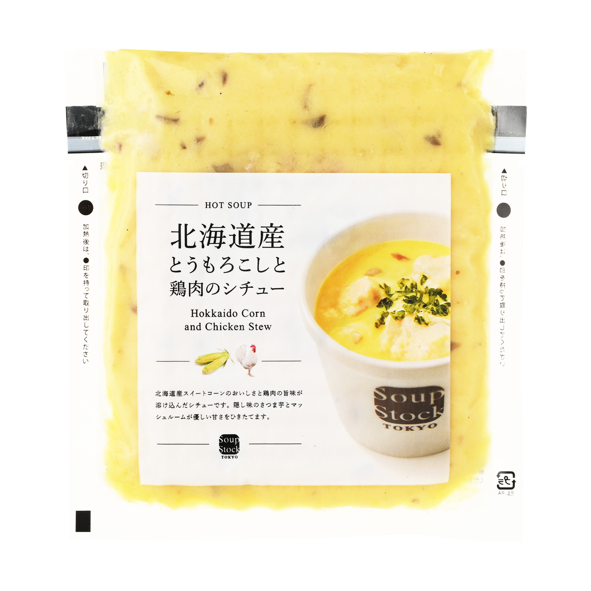 北海道産スイートコーンのおいしさと鶏肉の旨味が溶け込んだシチューです。隠し味のさつま芋とマッシュルームソースが優しい甘さをひきたてます
