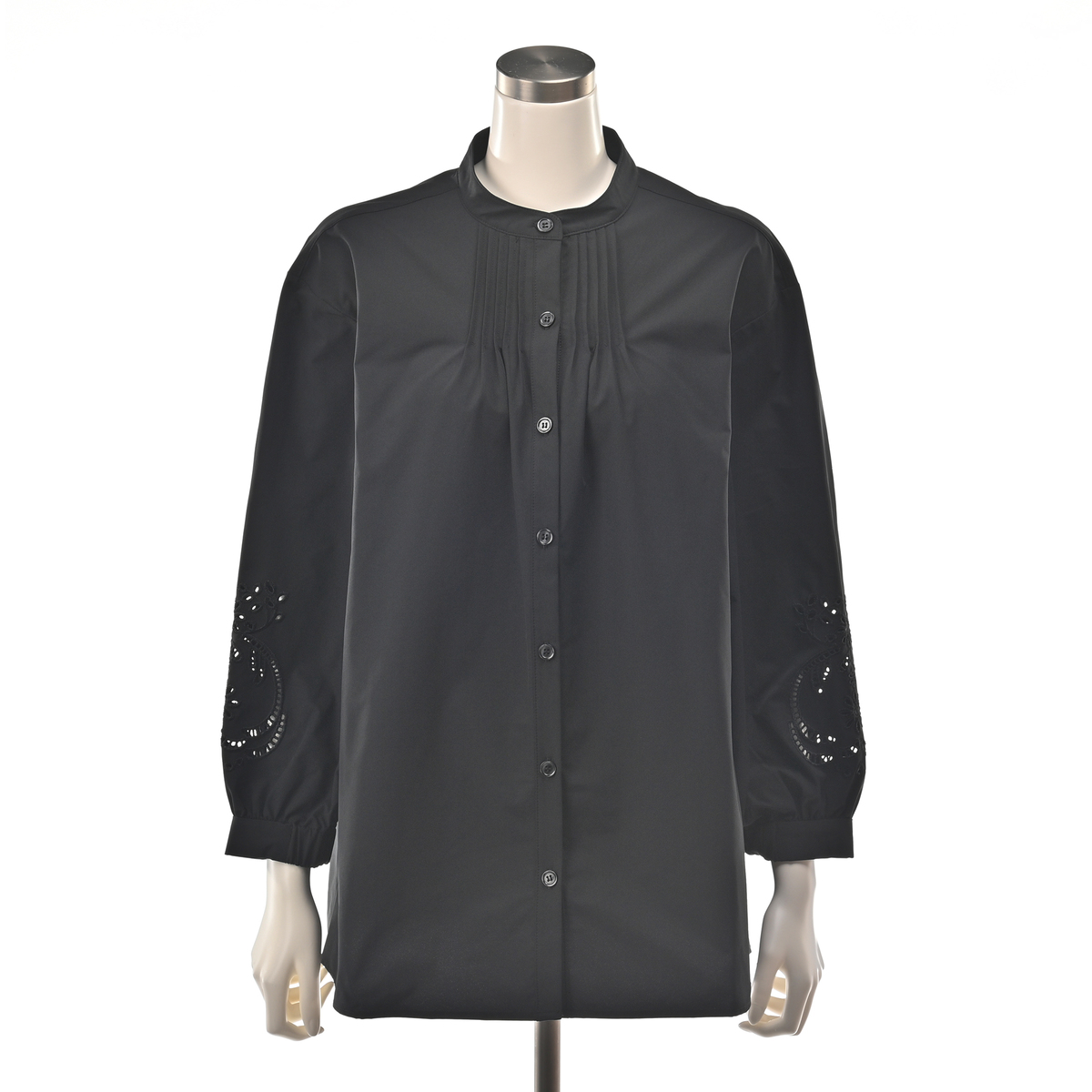 バンドカラータイプのシャツチュニック。前身頃に細かなピンタックを寄せエレガンスさを演出。袖口には華やかなカットワーク刺繍を施しています。袖口には少しギャザーが寄るようふんわりとしたフォルムにしたデザインです