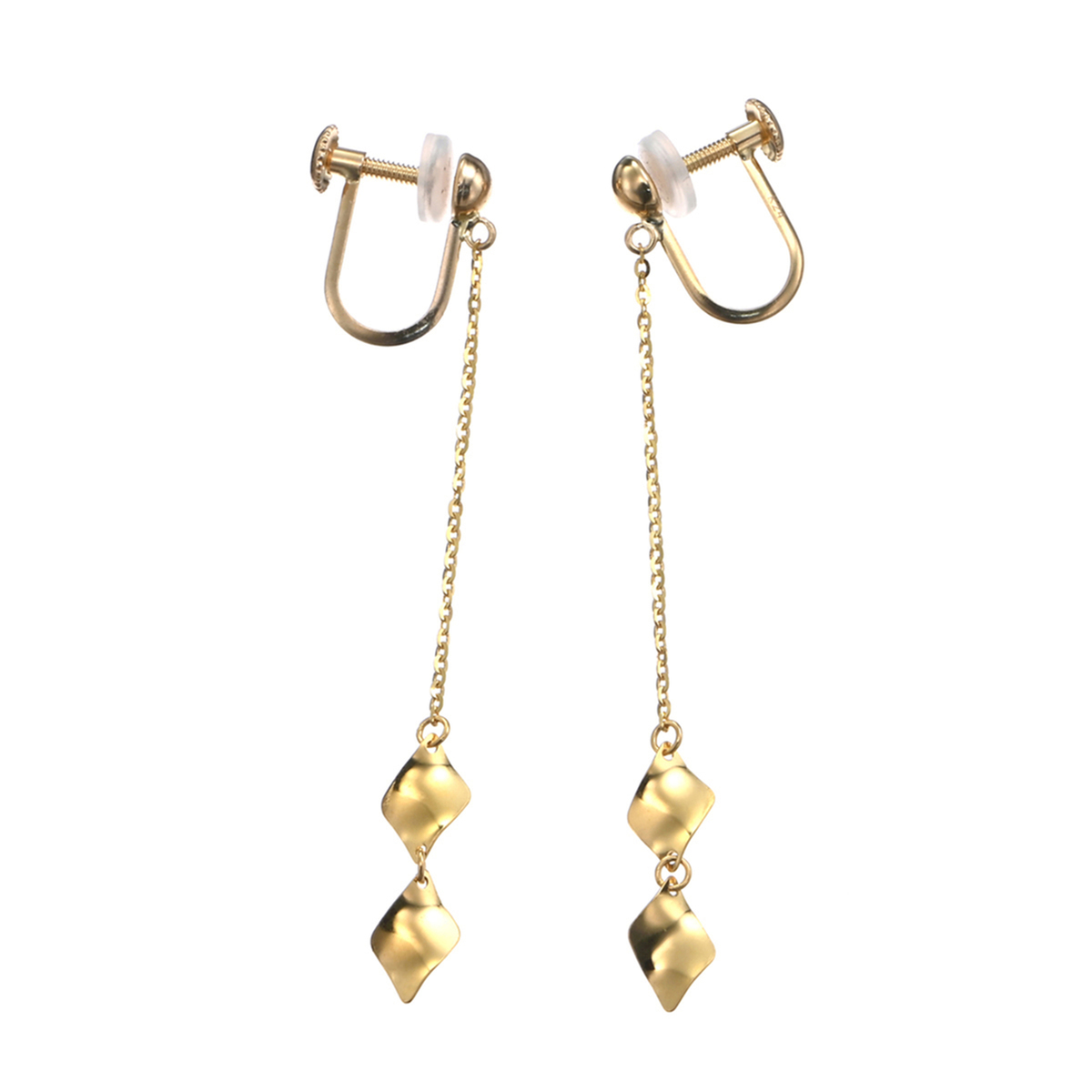 木の葉がひらひらと舞うような揺れ感と煌きが楽しめるイヤリングまたはピアス。丁寧に磨きを施し、ひねりを加えた純金のパーツを木の葉に見立てたデザインです