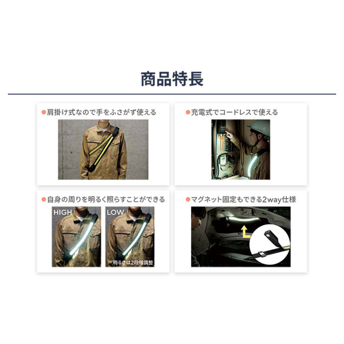 たすきのように身に着けることで、両手がフリーな状態で周囲を照らすことができる、たすき型ライト。マグネット付きなので、ベルトから取り外して好きな場所に取り付けて照らすことができます