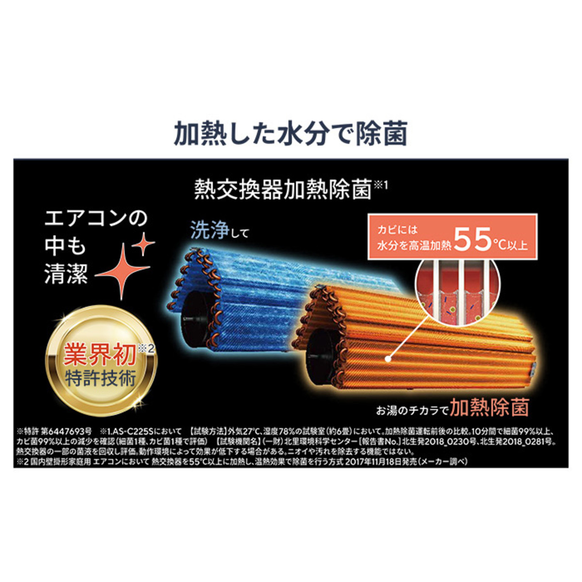 エアコン内部の熱交換器(アルミフィン)を、溜まった水ごと55℃以上に加熱して、素早く効果的に除菌する、熱交換器加熱除菌機能搭載。付着してしまったカビ菌や細菌にも効果を発揮します(*1)