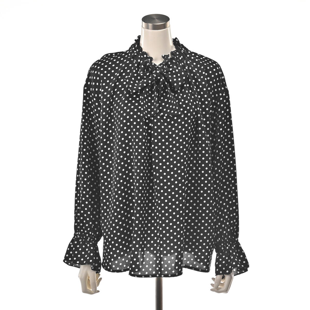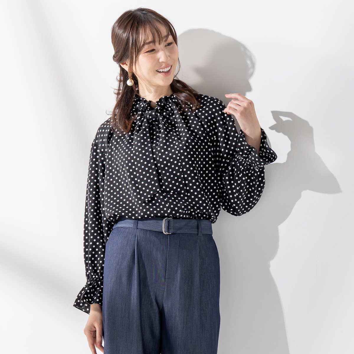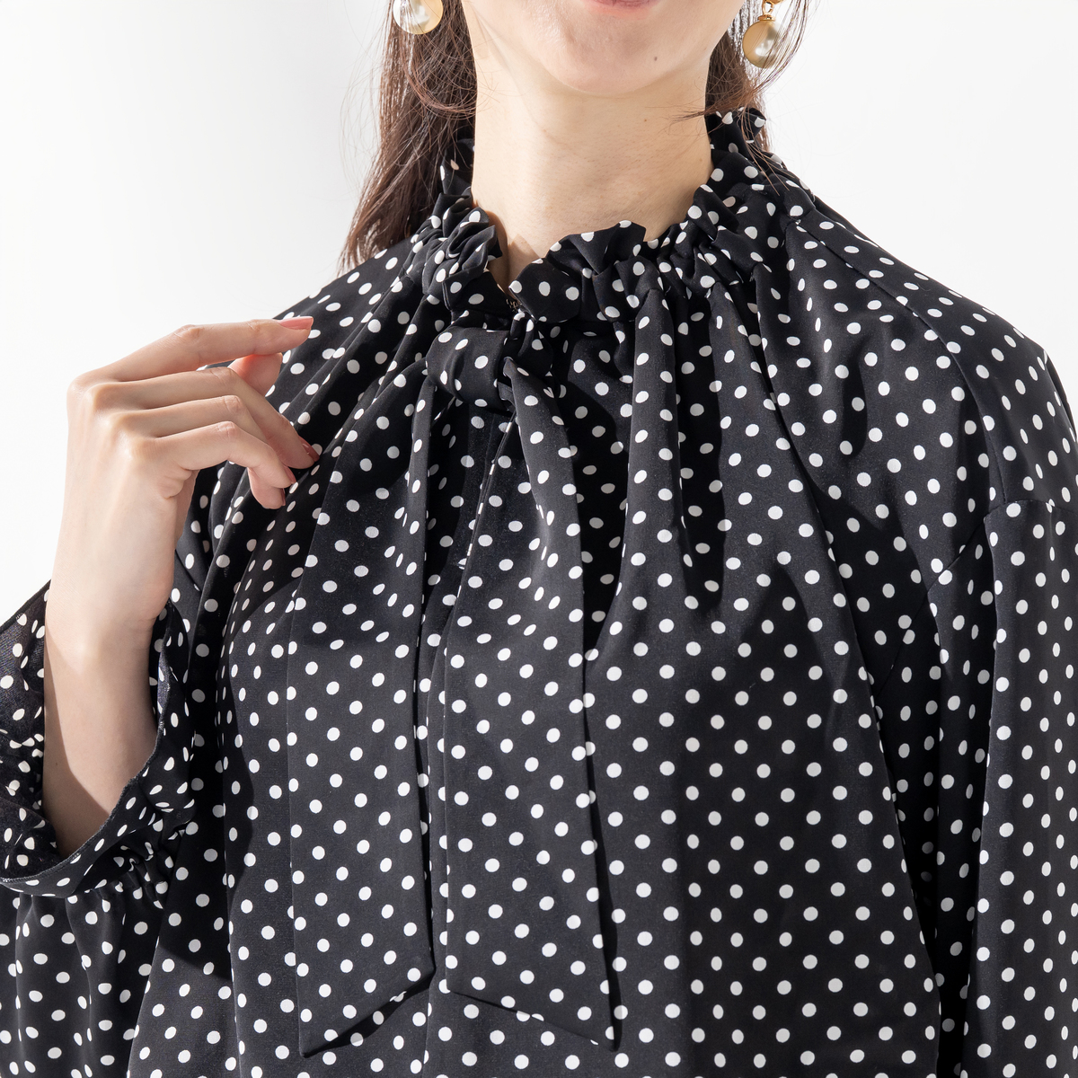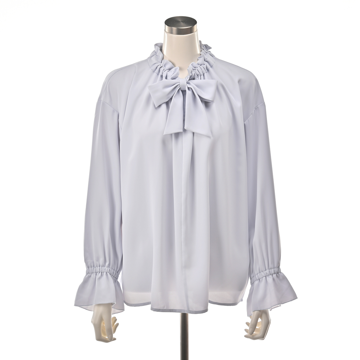 襟ぐりのフリルが顔まわりを明るく演出し、リボンは結んでも垂らしてもアレンジ自在。袖口のさりげないフリルが、大人の可愛らしさを引き立てます