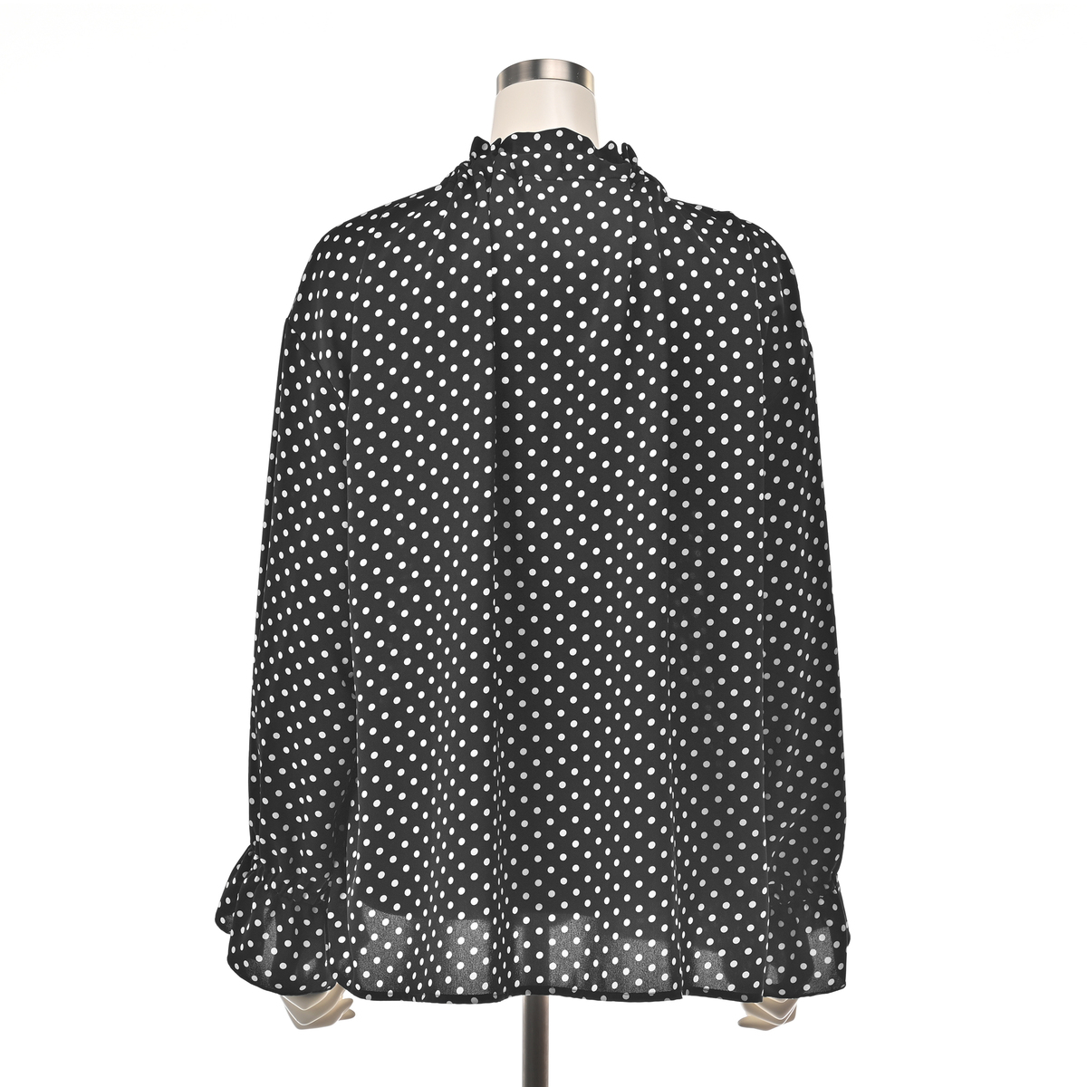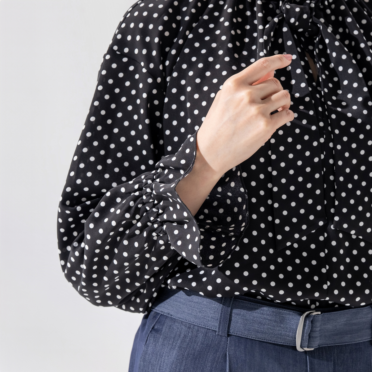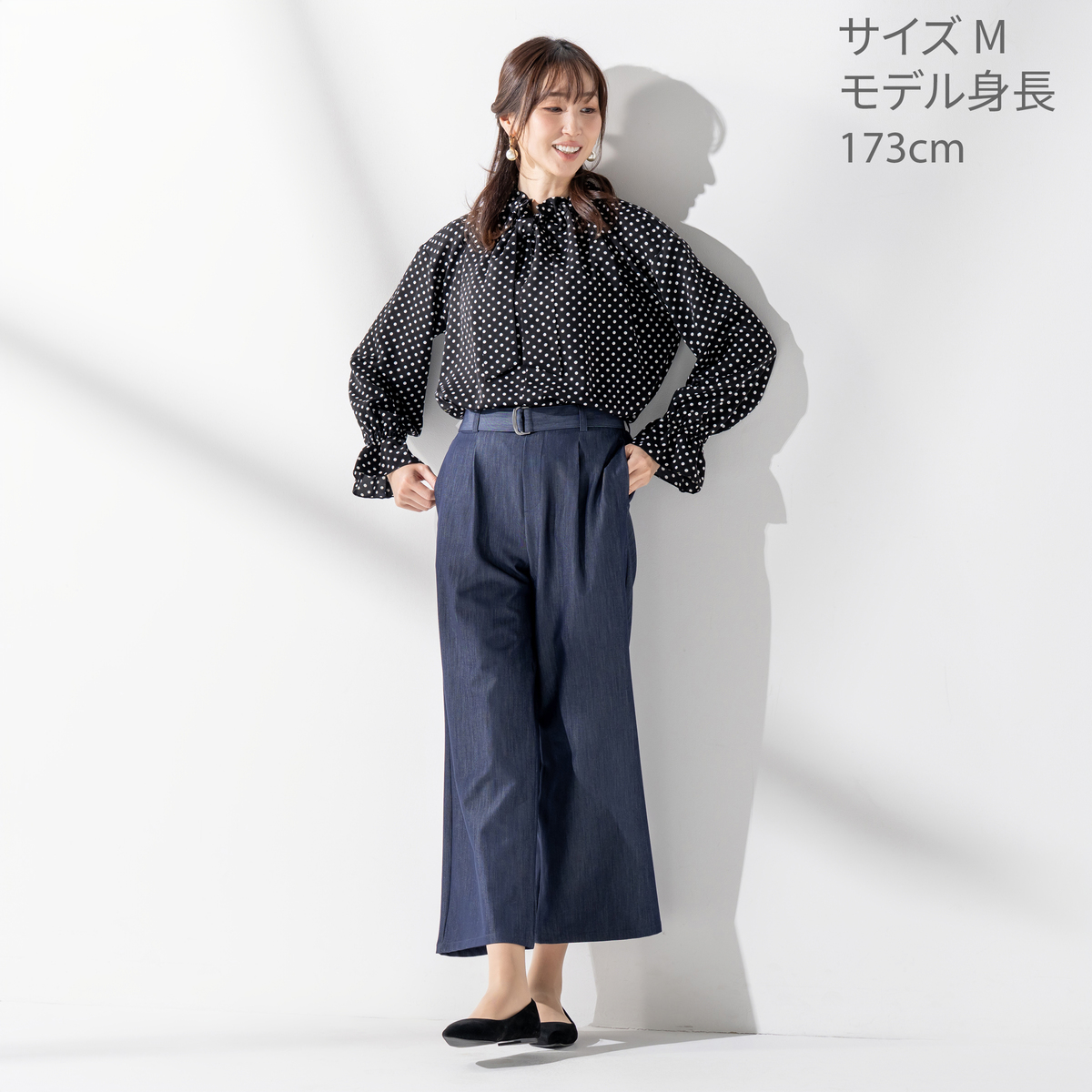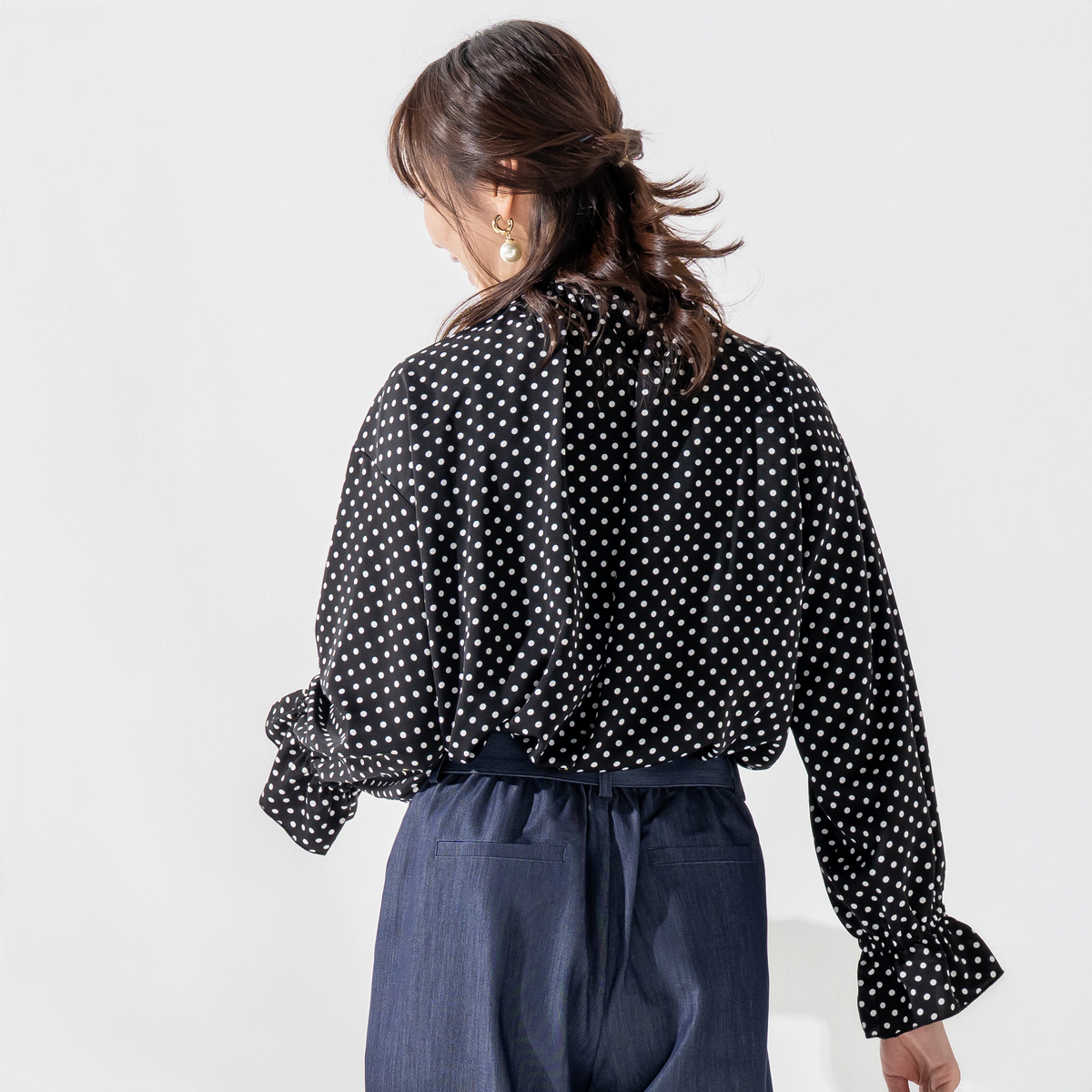 襟ぐりのフリルが顔まわりを明るく演出し、リボンは結んでも垂らしてもアレンジ自在。袖口のさりげないフリルが、大人の可愛らしさを引き立てます