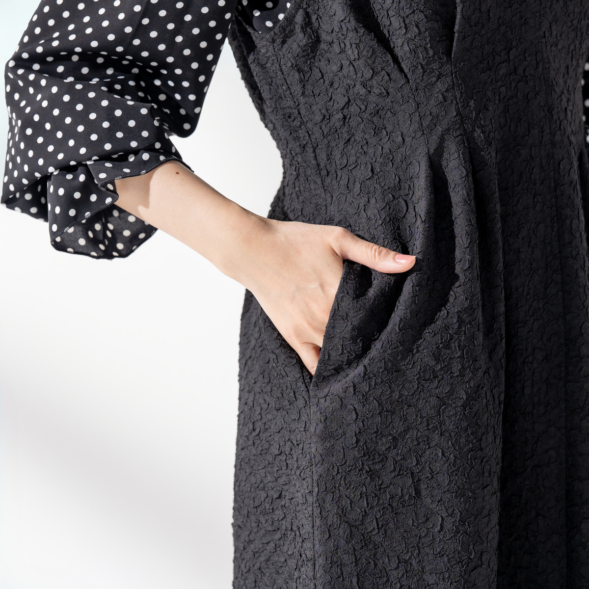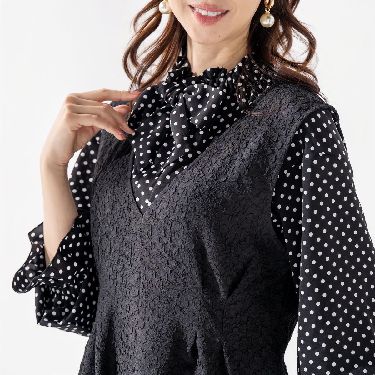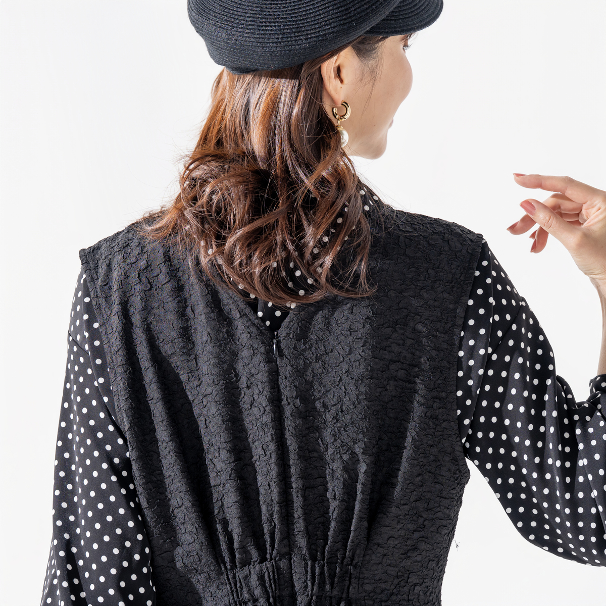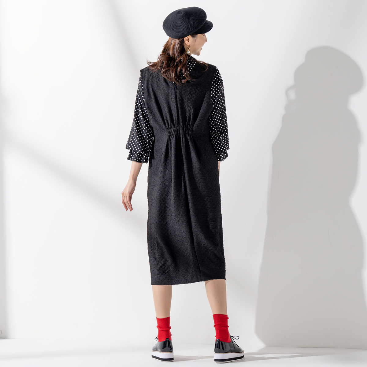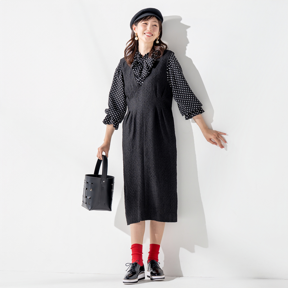 花びらのような柄が浮かぶジャカード素材のジャンスカ。ストレッチが効いた生地が身体の動きにやわらかく寄り添い、前のタックと後ろのギャザーがウエストを程よく整えて見せます。すっきりとした印象ながら窮屈さを感じにくく、毛玉になりにくい素材も日常にうれしいポイント。シンプルに合わせても質感が静かに引き立ち、装いに自然な奥行きを生む一着です