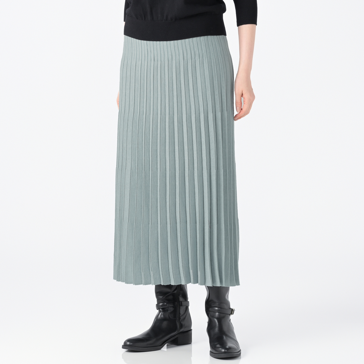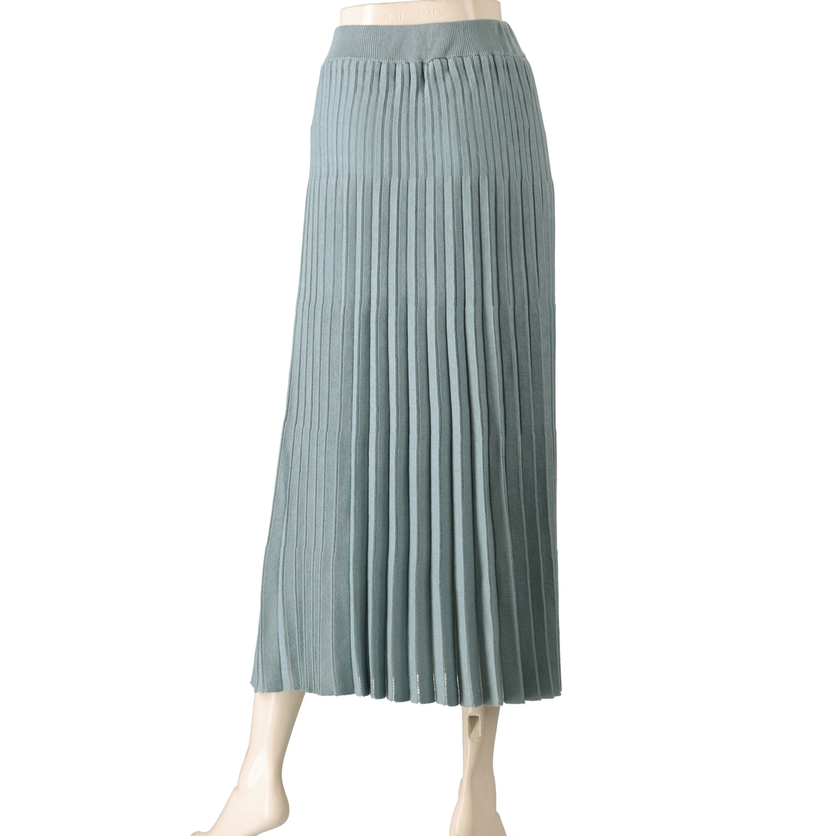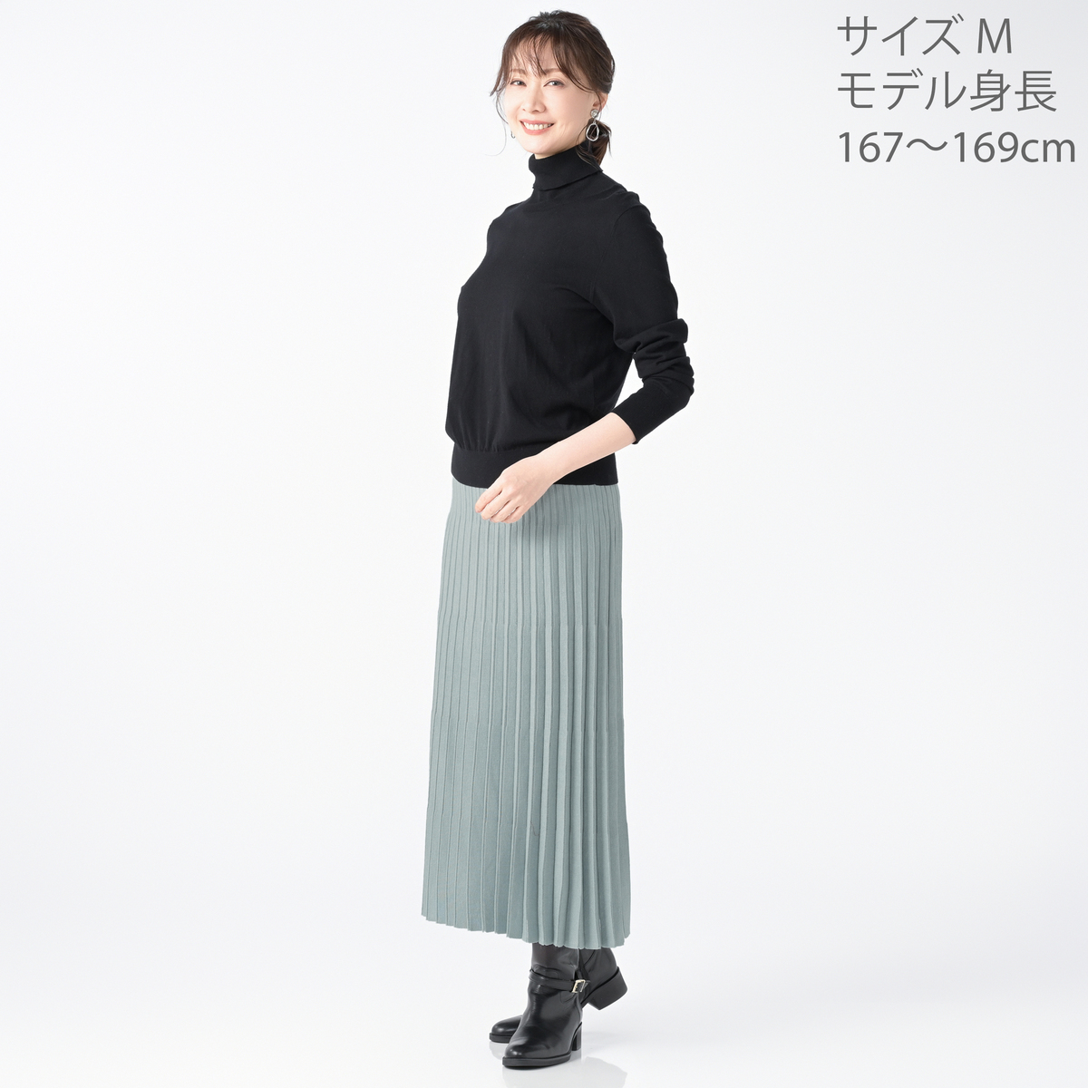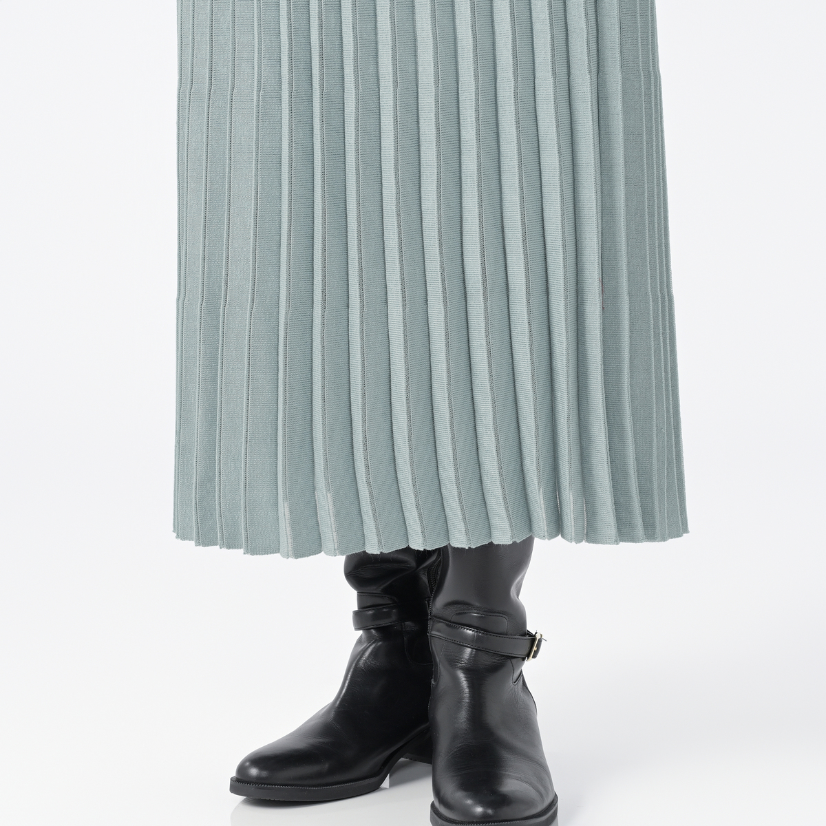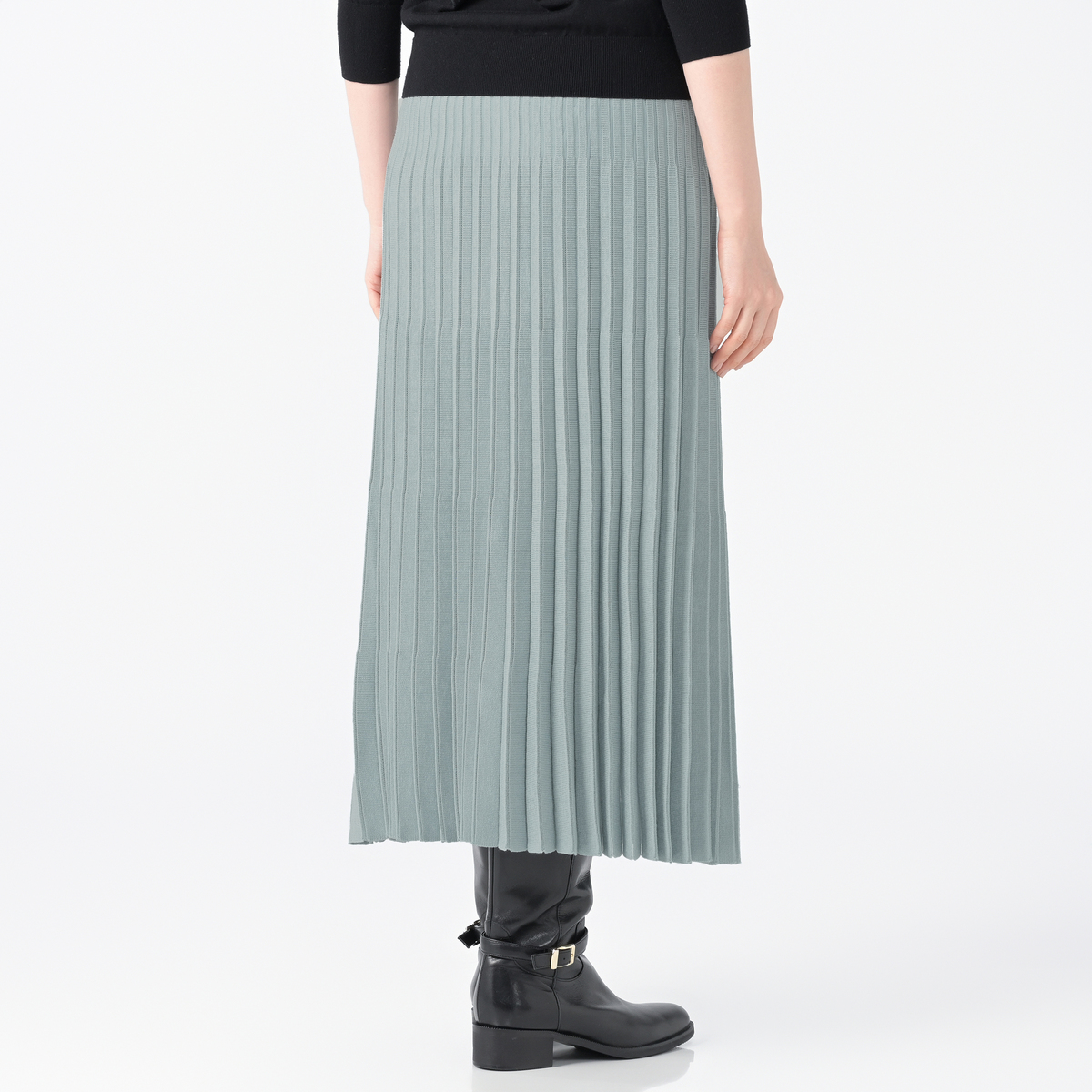 スタイルアップを叶えるプリーツと、秋冬に重宝するニット素材で柔らかな雰囲気を演出。ウエストは全体ゴム仕様で快適な穿き心地。プリーツは広がりすぎず、落ち着き感があり、すっきりとした印象でお召しいただけます
