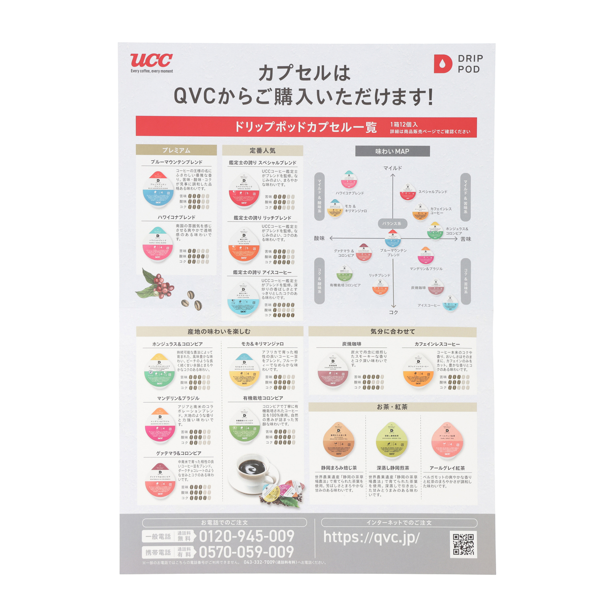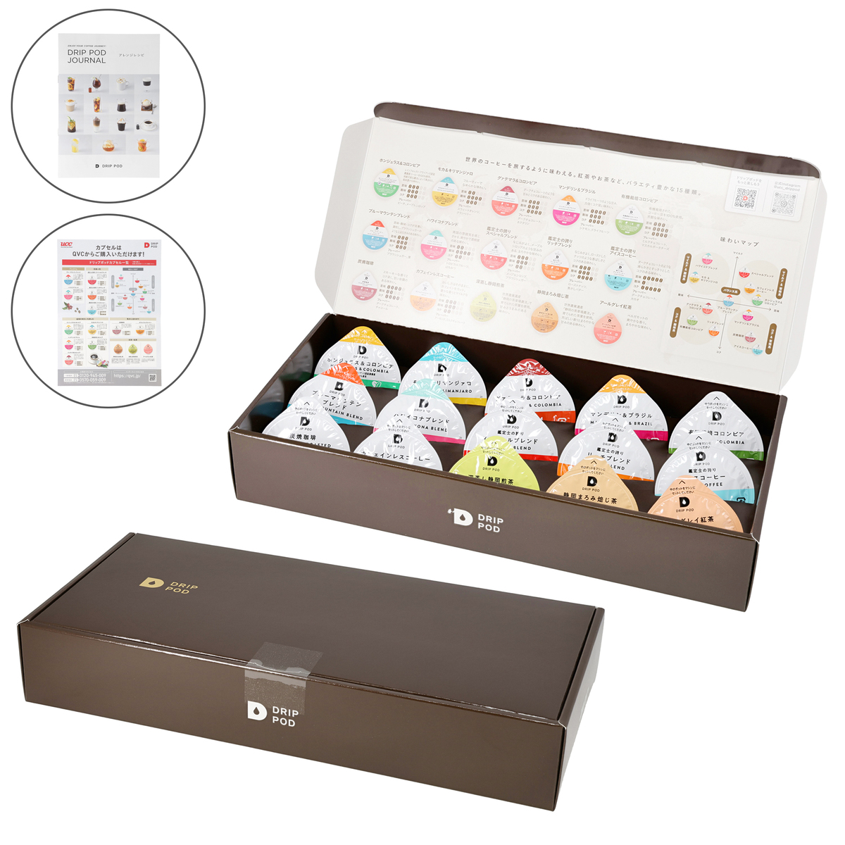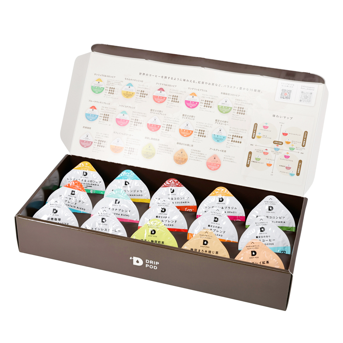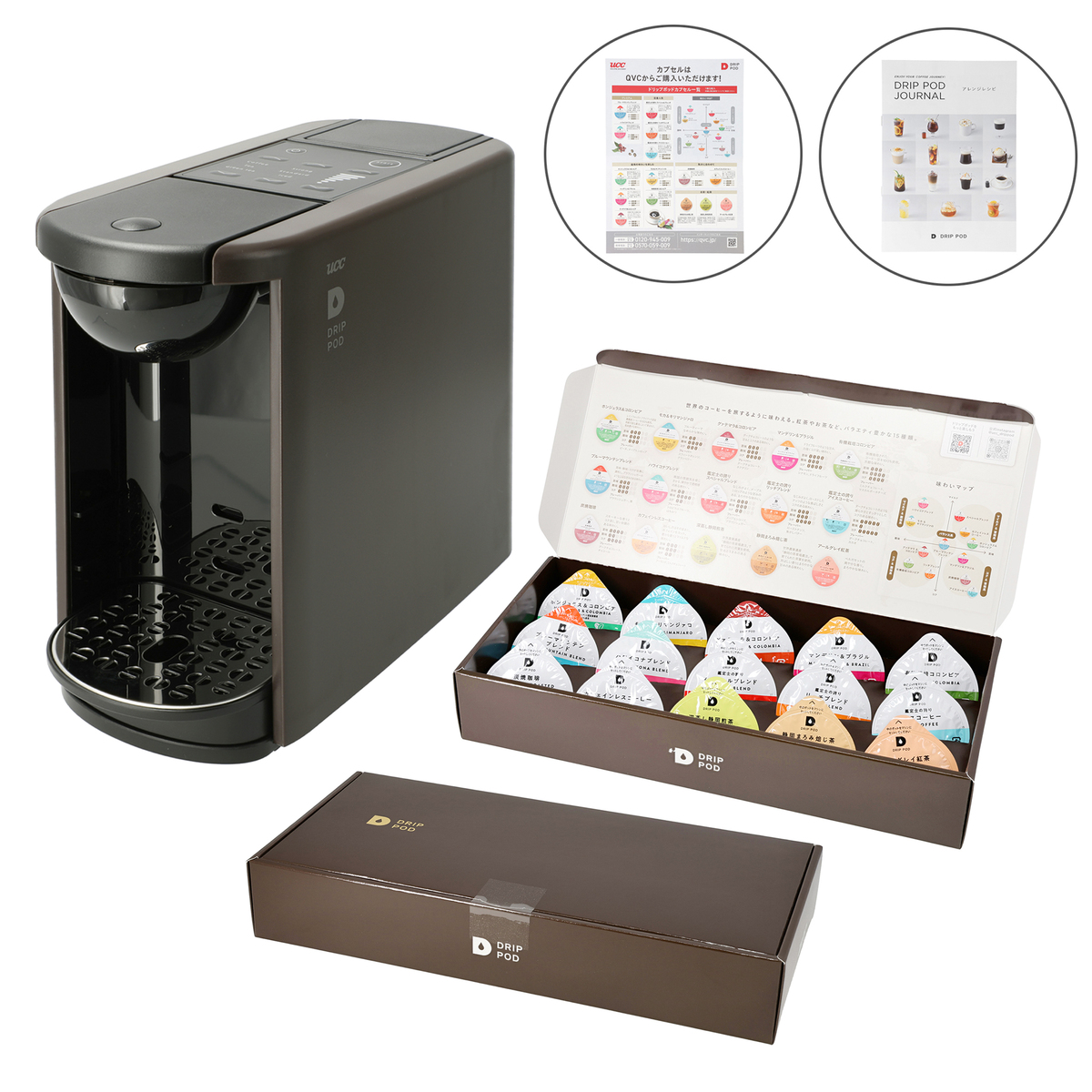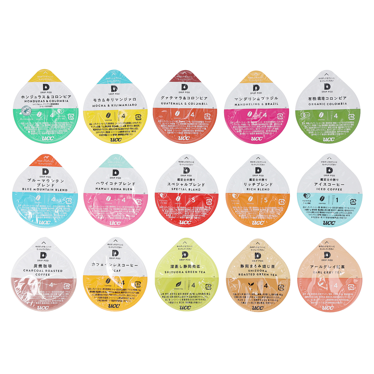 [アレルギー物質特定原材料8品目] なし [商品内容] ・カプセルお試しボックス15個入×2個 ・アレンジレシピ [1箱の内訳] ホンジュラス&コロンビア、モカ&キリンマンジァロ、グァテマラ&コロンビア、マンデリン&ブラジル、有機栽培コロンビア、ブルーマウンテンブレンド、ハワイコナブレンド、鑑定士の誇りスペシャルブレンド、鑑定士の誇りリッチブレンド、鑑定士の誇りアイスコーヒー、炭焼珈琲、カフェインレスコーヒー、深蒸し静岡煎茶、静岡まろみ焙じ茶、アールグレイ紅茶 ※この商品には専用の抽出マシンが必要となります [保存方法] 開封前:直射日光、高温多湿をさけてください 開封後:開封後はできるだけ早めにお召し上がりください [お召し上がり方] この商品には専用の抽出マシンが必要となります。それぞれのマシンの使用方法については、取扱説明書をご覧ください [注意事項] ※マシンの説明書に従って正しく安全にお使いください ※コーヒーを抽出する際、火傷にご注意下さい ※コーヒーから発生するガスや気温の影響で膨張する場合がありますが品質には問題ありません ※ポッド天面部に色のついた天はコーヒー粉が挟まったものです。安心してお召し上がり下さい [原産国] 日本 [セット内容] ・UCC ドリップポッド DP3 ・UCC ドリップポッド カプセル15種2個セット [お手入れ] ※使うたびにお手入れ フィルターホルダー・フィルター・フィルターふた ・薄めた台所用中性洗剤で洗浄する ・洗浄した後は、すすぎを十分に行って洗剤を完全に洗い流す ・水分を拭き取るか、十分に乾かす ※毎日のお手入れ ポッドホルダー ・ポッドホルダーを本体から取り外す ・薄めた台所用中性洗剤で洗浄する ・洗浄した後は、すすぎを十分に行って洗剤を完全に洗い流す ・水分を拭き取るか、十分に乾かす ※水タンク・水タンクふた ・薄めた台所用中性洗剤で洗浄する ・水タンクの内側を布などで拭かないでください。布の糸くずなどが本体内部に入り込み故障の原因になります ※ドリップトレー ・各部品を分解し、薄めた台所用中性洗剤で洗浄する ・金属トレーの穴や縁で怪我をしないように注意してください ※汚れるたび/週に一度のお手入れ ・本体内部のすすぎ ・抽出ヘッド内部(かたく絞ったふきんで拭く) ・本体(かたく絞ったふきんで拭く) [原材料] ■お試しボックス モカ&キリンマンジァロ:コーヒー豆(生豆生産国名:エチオピア、タンザニア) ■お試しボックス グァテマラ&コロンビア:コーヒー豆(生豆生産国名:グァテマラ、コロンビア) ■お試しボックス マンデリン&ブラジル:コーヒー豆(生豆生産国名:インドネシア、ブラジル) ■お試しボックス 炭焼珈琲:コーヒー豆(生豆生産国名:ブラジル、ベトナム) ■お試しボックス カフェインレスコーヒー:コーヒー豆(生豆生産国名:ブラジル) ■お試しボックス 有機栽培コロンビア:有機コーヒー豆(生豆生産国名:コロンビア) ■お試しボックス 鑑定士の誇りスペシャルブレンド:コーヒー豆(生豆生産国名:ブラジル、ベトナム) ■お試しボックス 鑑定士の誇りリッチブレンド:コーヒー豆(生豆生産国名:ブラジル、ホンジュラス) ■お試しボックス 鑑定士の誇りアイスコーヒー:コーヒー豆(生豆生産国名:ブラジル、ベトナム) ■お試しボックス 深蒸し静岡煎茶:緑茶(静岡県) ■お試しボックス アールグレイ紅茶:紅茶(インド)/香料 ■お試しボックス 静岡まろみ焙じ茶:緑茶(静岡県) ■お試しボックス ハワイコナブレンド:コーヒー豆(生豆生産国名:アメリカ合衆国、ブラジル他) ■お試しボックス ブルーマウンテンブレンド:コーヒー豆(生豆生産国名:ジャマイカ、ブラジル他) ■お試しボックス ホンジュラス&コロンビア:コーヒー豆(生豆生産国名:ホンジュラス、コロンビア)
