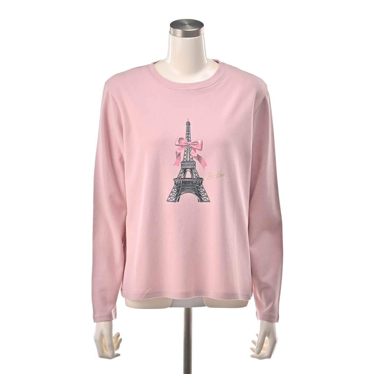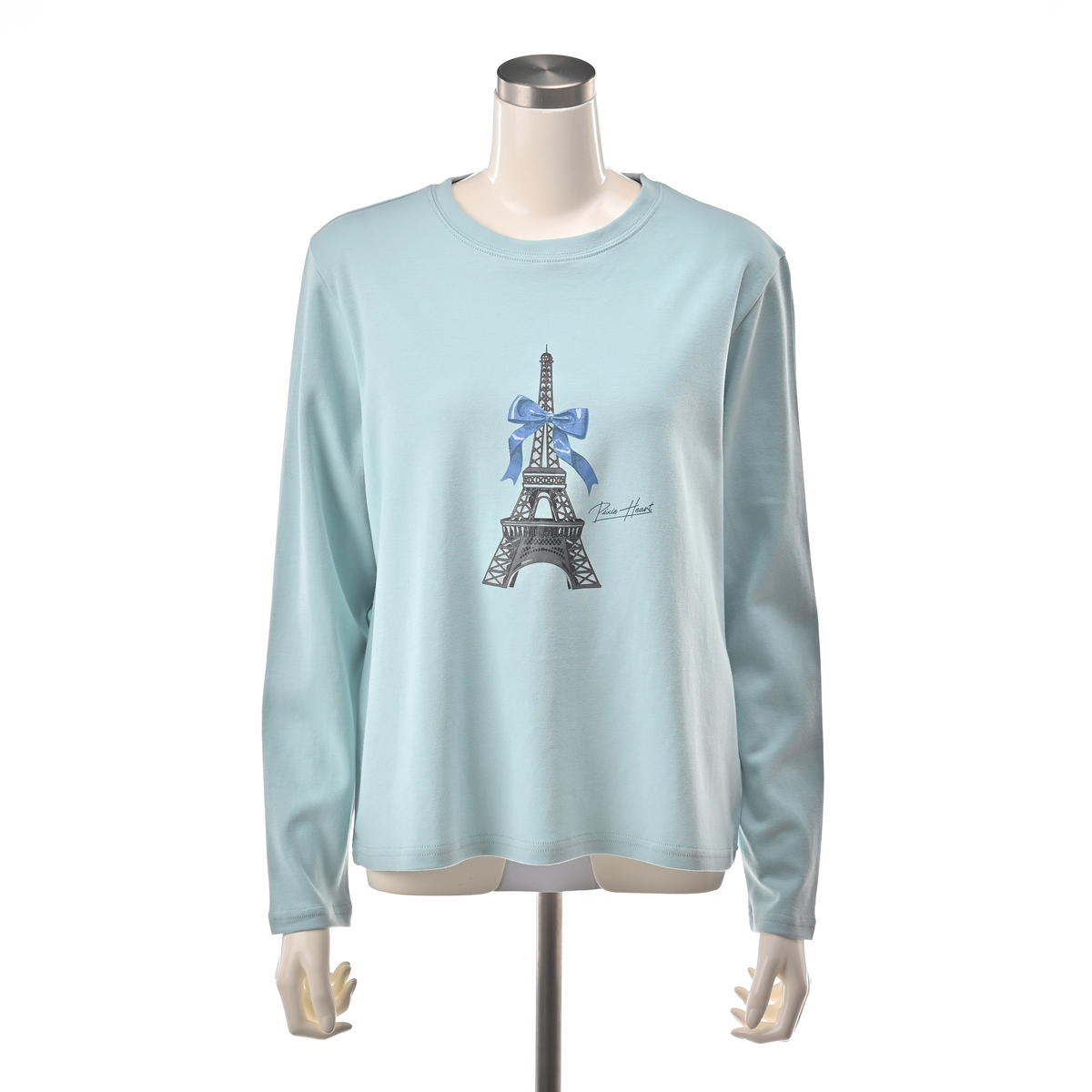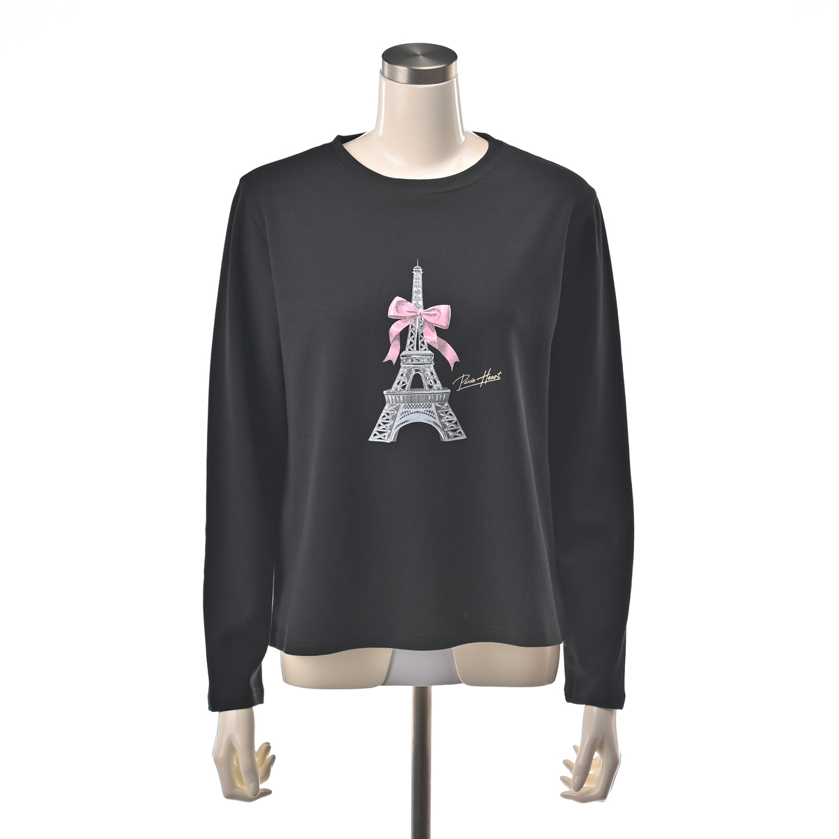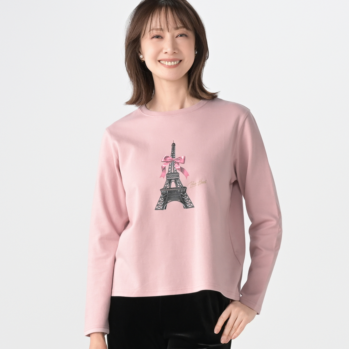 程よいゆとりのリラックスフィットで、身体のラインを拾いすぎないバランス。一枚でも重ね着でも扱いやすく、身幅や袖まわりの適度なゆとりが二の腕やお腹まわりをさりげなくカバー。エッフェル塔とリボンのモチーフが、着こなしにパリらしい洗練とフレンチシックな要素をプラスします