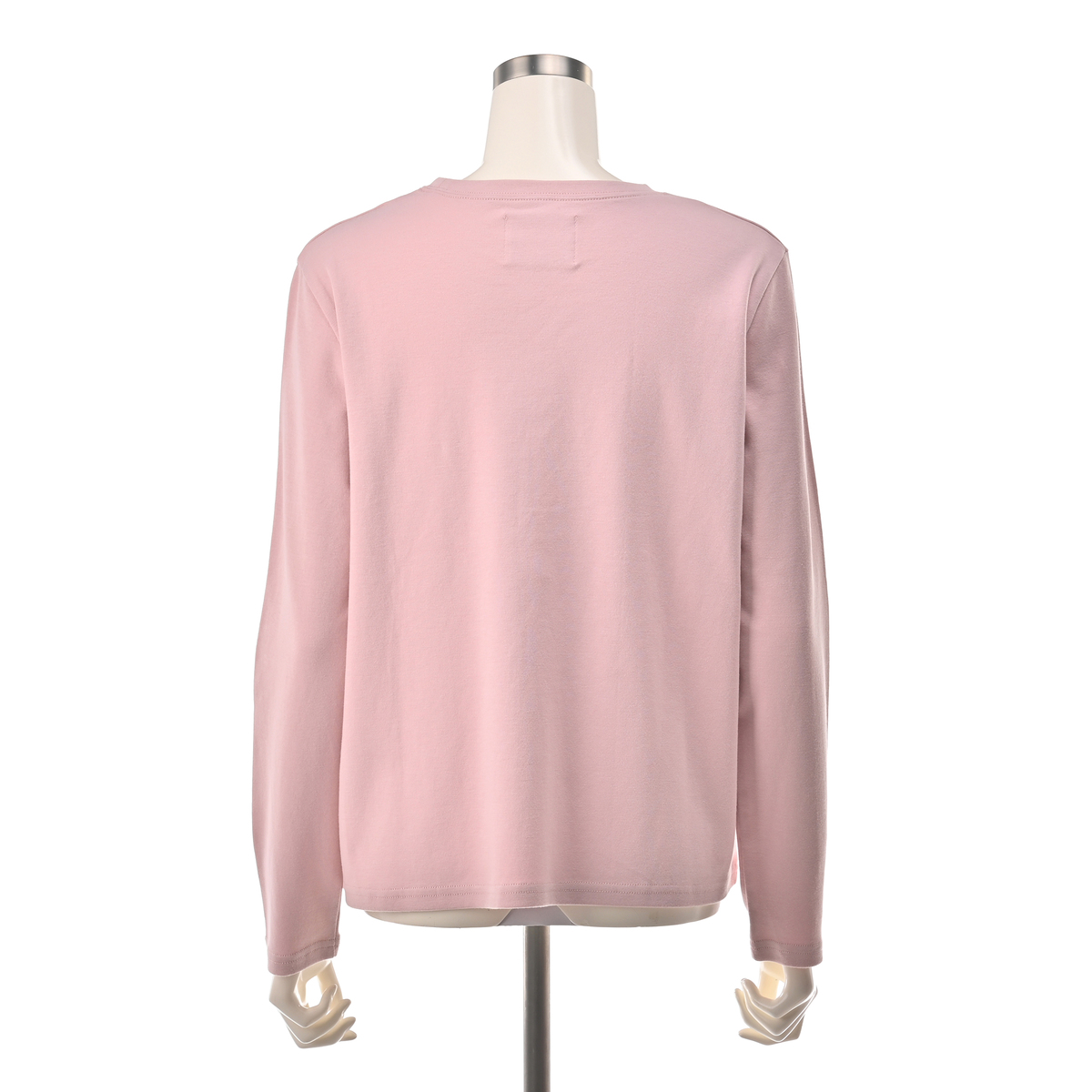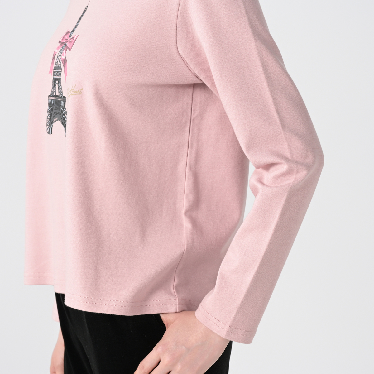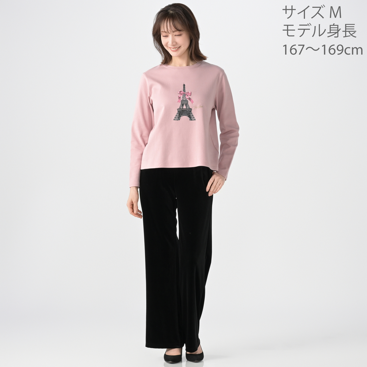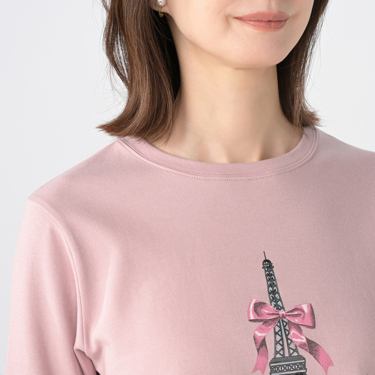 程よいゆとりのリラックスフィットで、身体のラインを拾いすぎないバランス。一枚でも重ね着でも扱いやすく、身幅や袖まわりの適度なゆとりが二の腕やお腹まわりをさりげなくカバー。エッフェル塔とリボンのモチーフが、着こなしにパリらしい洗練とフレンチシックな要素をプラスします