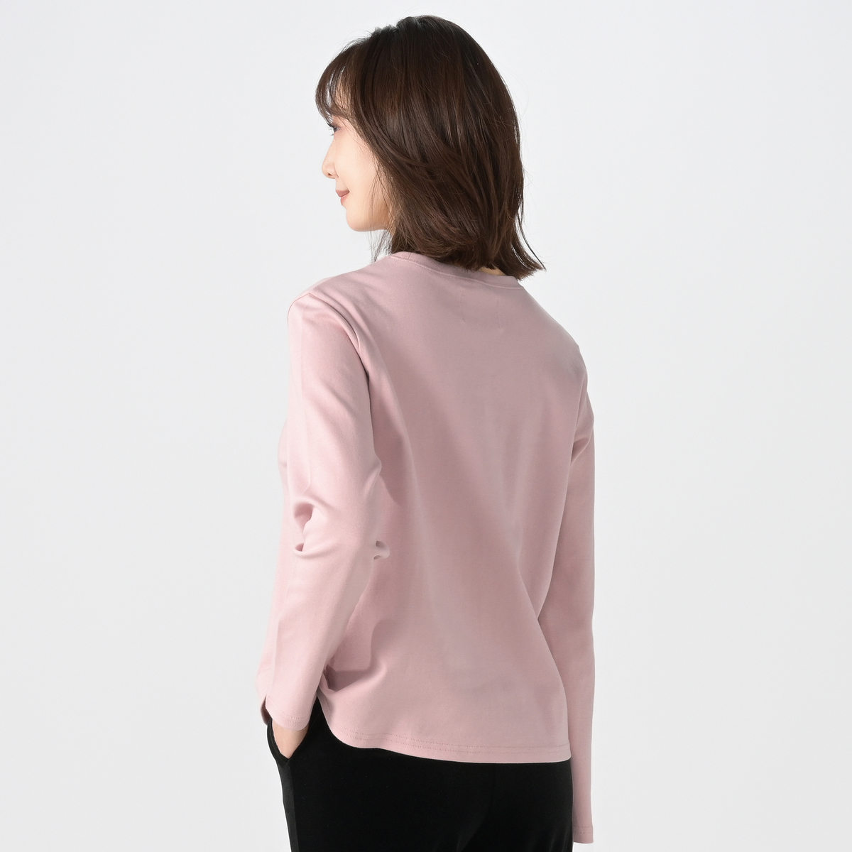 密度の高いダブルジャージーで編まれたプルオーバー。適度な伸縮性と厚みがあり、体のラインを拾いにくくきれいなシルエットを描きます。型崩れしにくい素材で、コットン100%の柔らかさにシルケット加工の光沢が映える仕上がりです