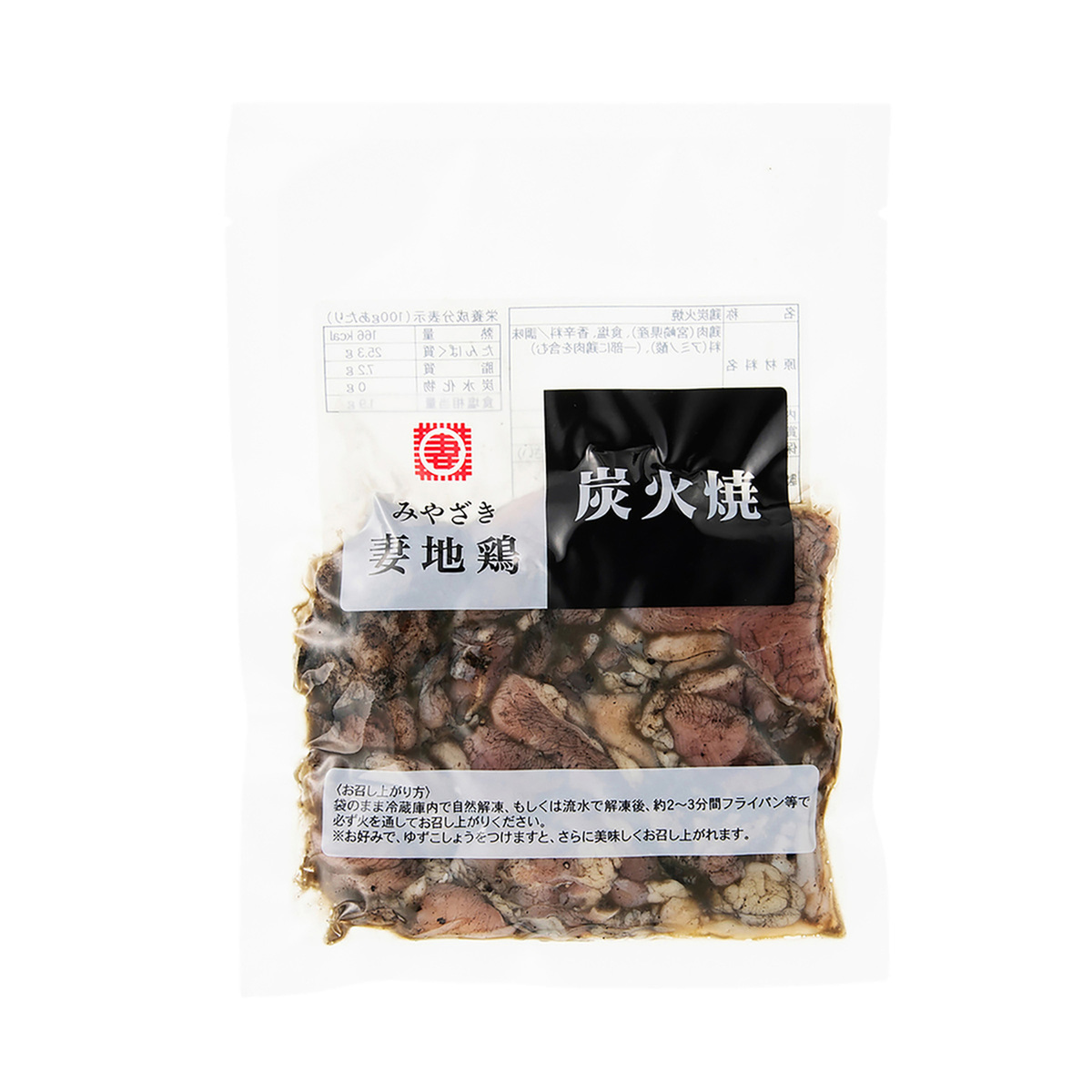 宮崎県西都市の大自然で育てた希少な地鶏「妻地鶏」。こだわりの快適な環境で飼育された「妻地鶏」を使った炭火焼です。炭火焼の味をそのままに、おいしさを追求し、半生のレア状態で真空パックにしました