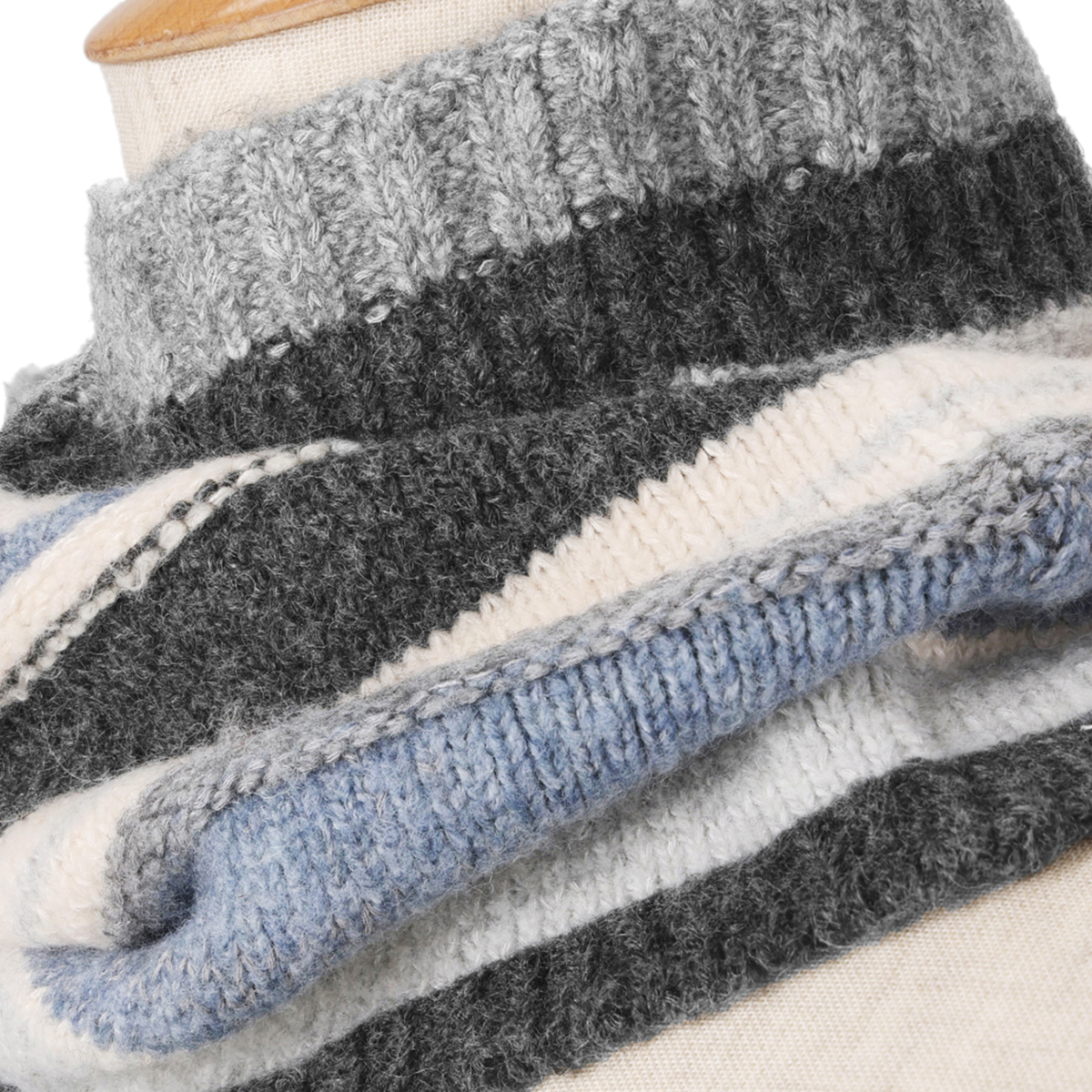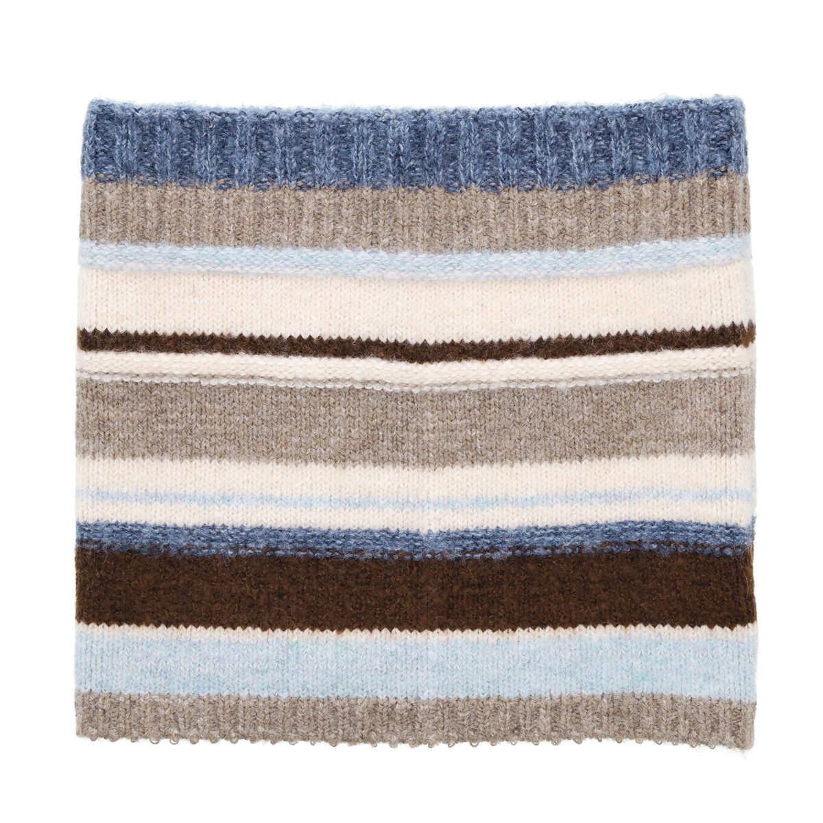 ボーダー調の柄にリブ編みや天竺編みを組合せたニットネックウォーマー。細番手の糸が生み出すなめらかな質感で、さっとかぶるだけでスタイリングが決まります