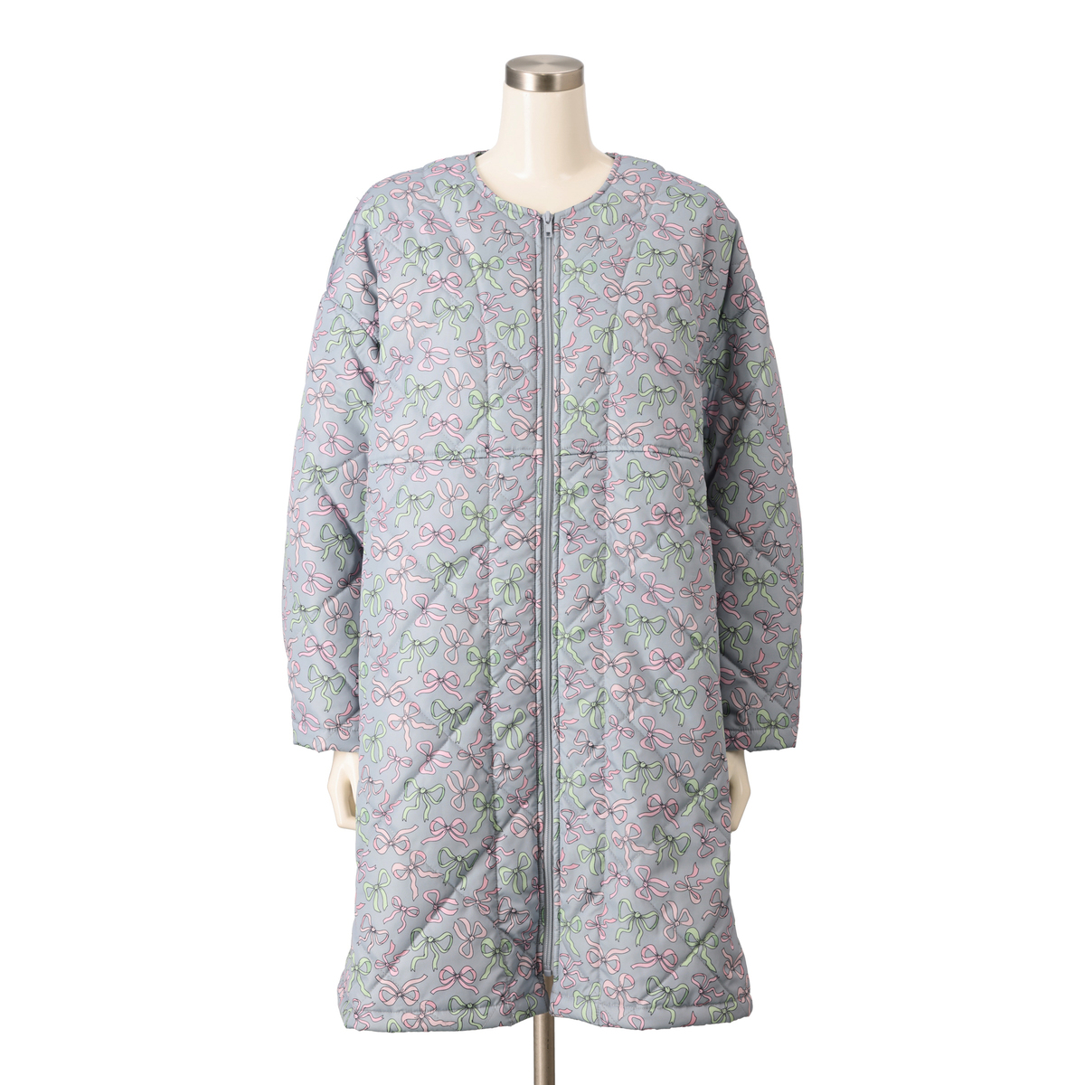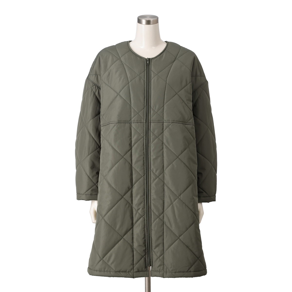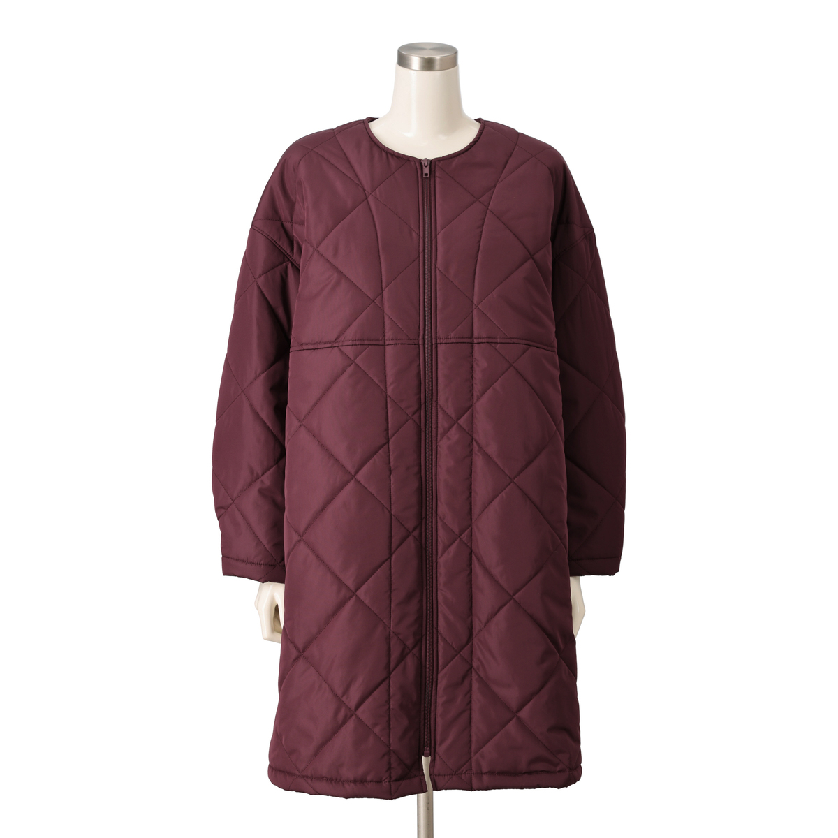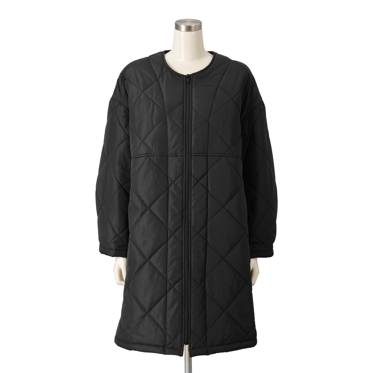 ノーカラーデザインのワンピース風コート。ジップアップの前開きデザインで、両脇には便利なポケット付きです