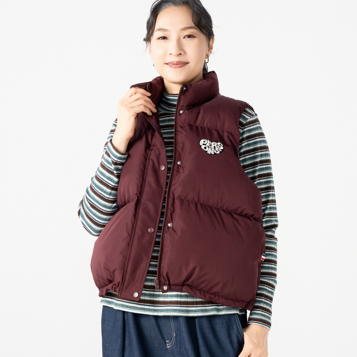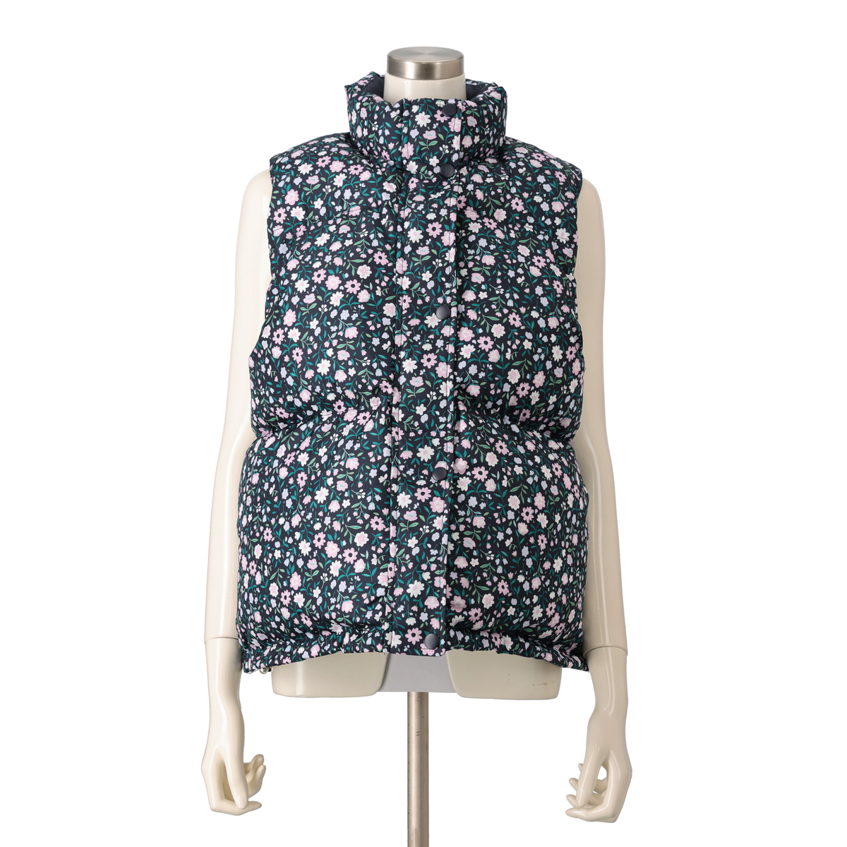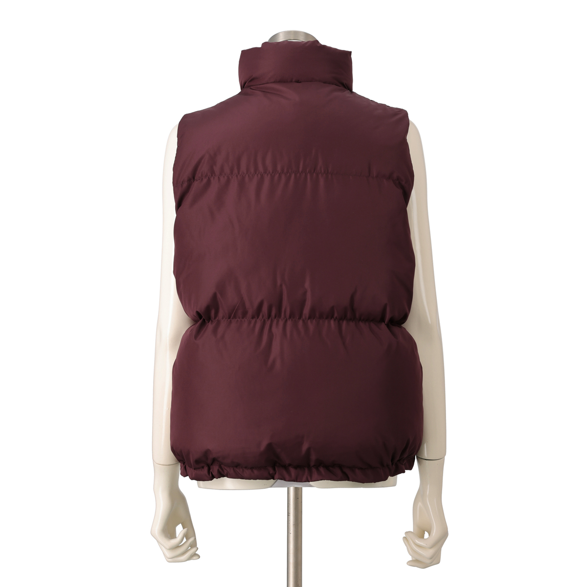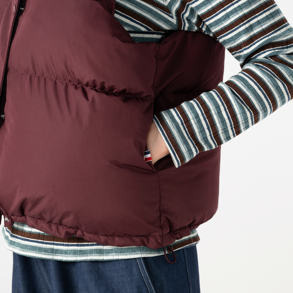 シルエットにこだわった前開きジップアップ中綿ベスト。ボクシーシルエット見えする様にパターンニングし、若々しい印象に。裾のドロストを絞るとバルーンシルエット風になり、可愛いらしい雰囲気にアレンジできます