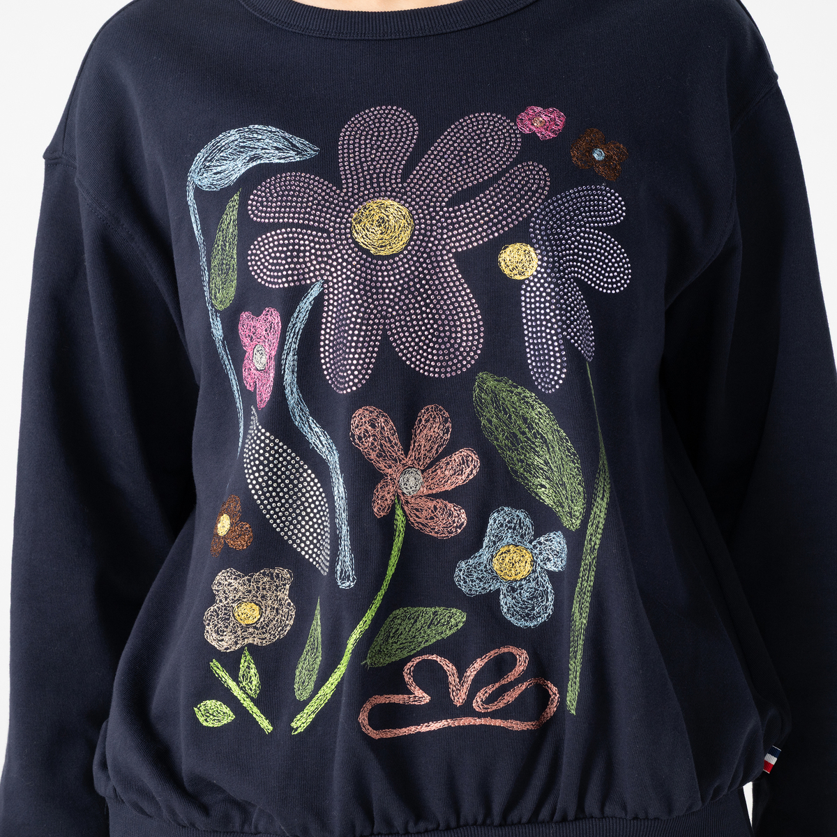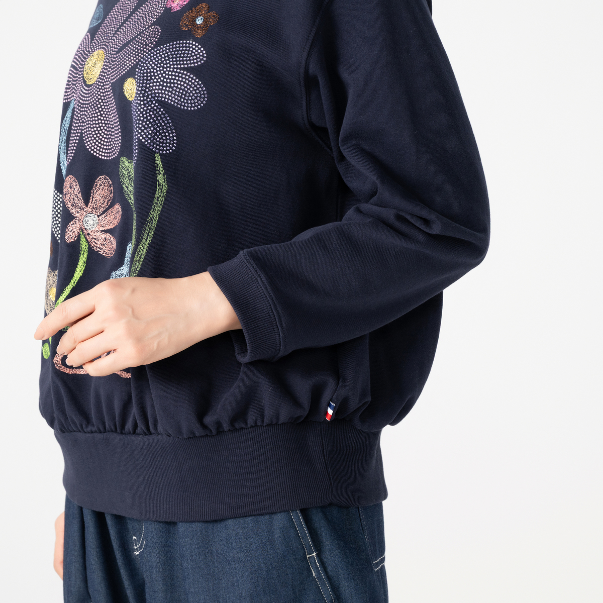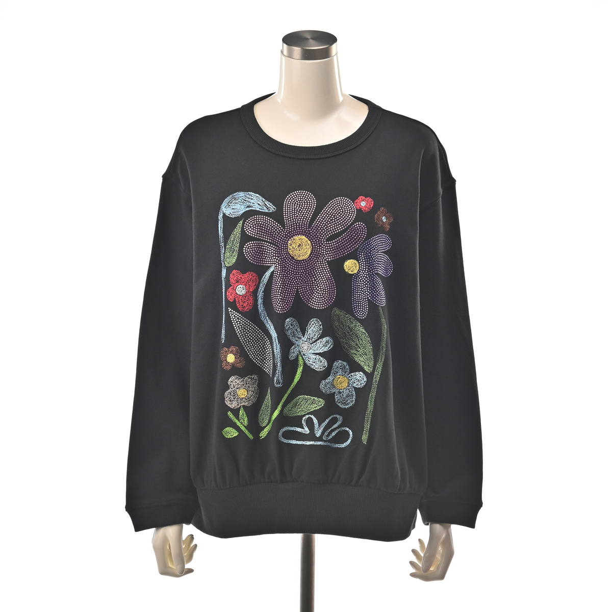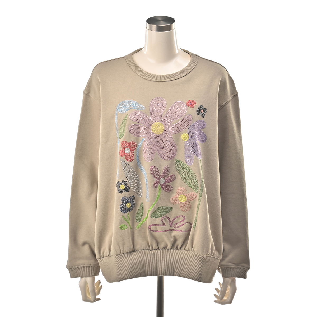 刺繍とラインストーンをあしらった華やかなスウェット。裏毛素材でゆったりした着心地ながら、デイリーコーデにゴージャス感を演出します