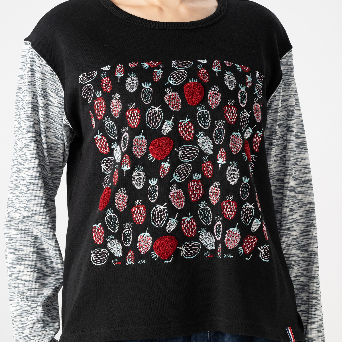 手の込んだ刺繍が目を惹くクルーネックスウェット。裏毛素材でゆったりした着心地が魅力です。両袖にはメランジ風ボーダーのリブ編みをあしらい、メリハリのあるデザインに。シンプルなコーディネートのアクセントになる一枚です