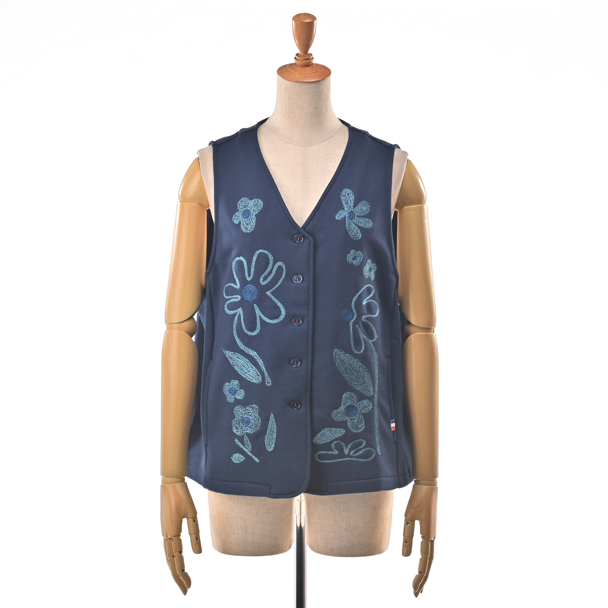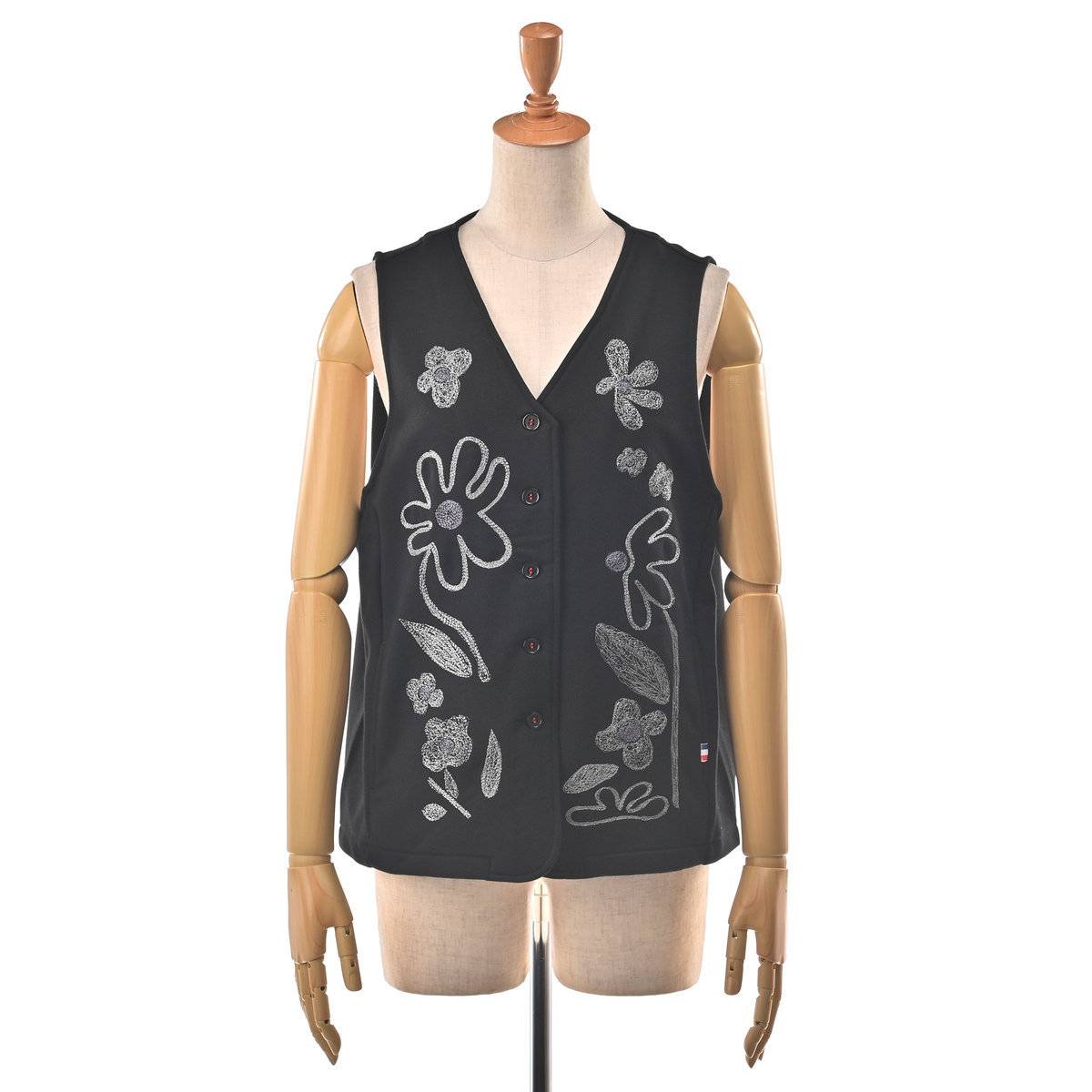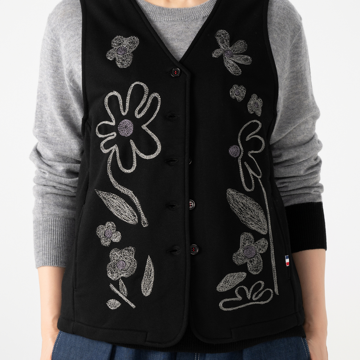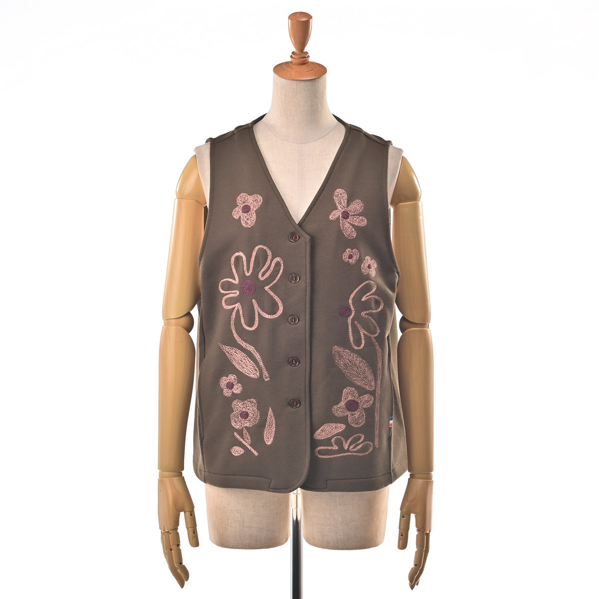 花の刺繍が目を引くカットソー素材のジレです。軽やかな着心地で重ね着を楽しめ、長袖Tシャツやハイネックに加えるだけで装いに華やぎをプラス。シックな色調の刺繍がコーディネートを品よく仕上げます
