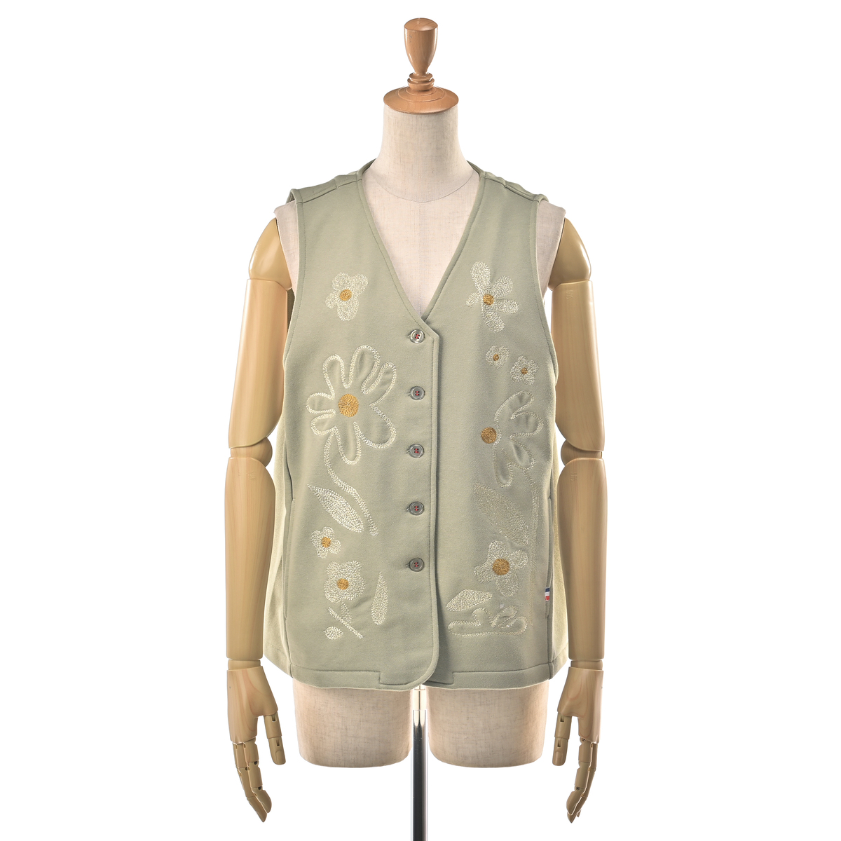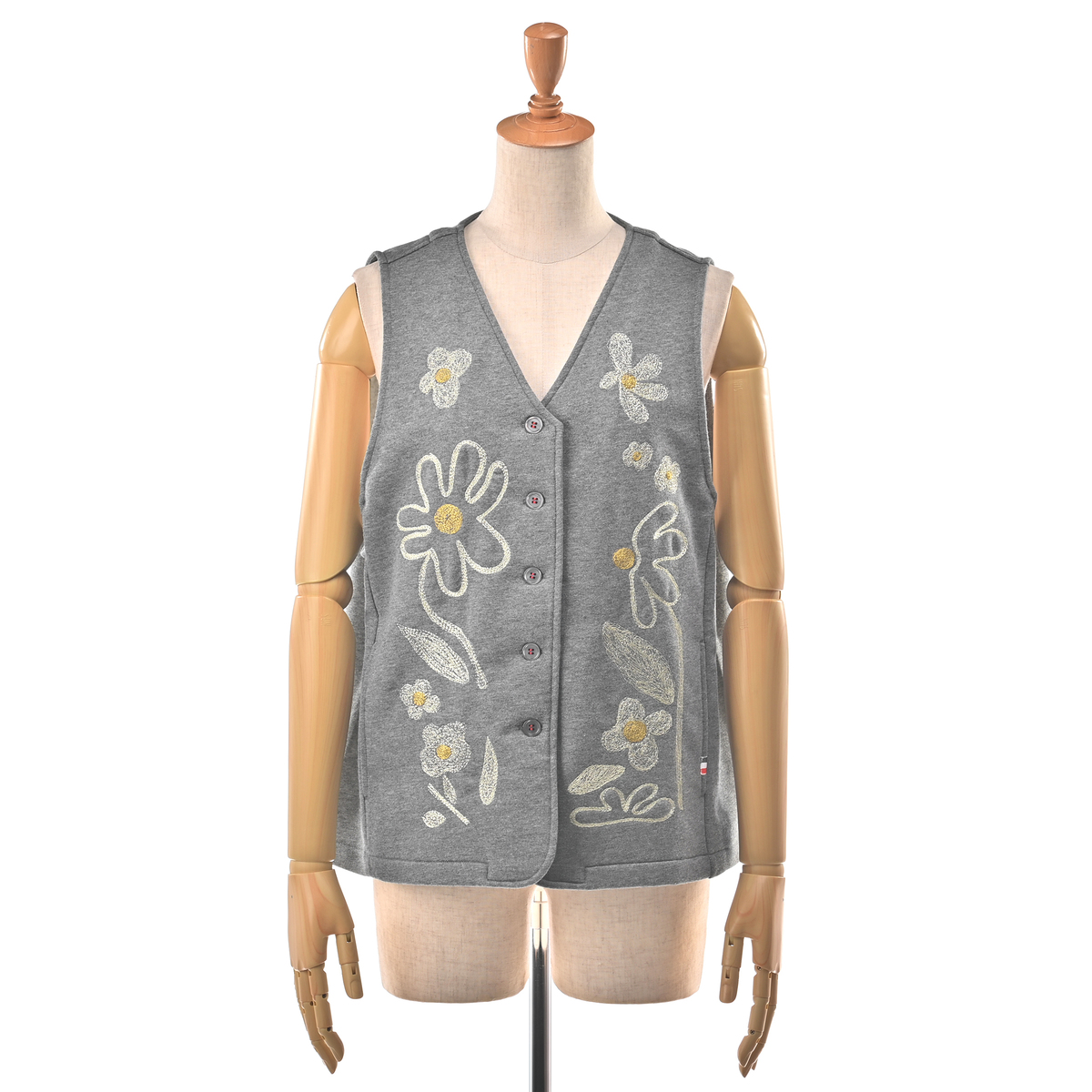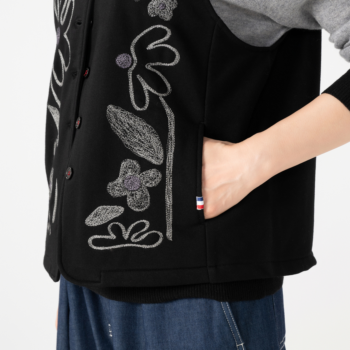 花の刺繍が目を引くカットソー素材のジレです。軽やかな着心地で重ね着を楽しめ、長袖Tシャツやハイネックに加えるだけで装いに華やぎをプラス。シックな色調の刺繍がコーディネートを品よく仕上げます