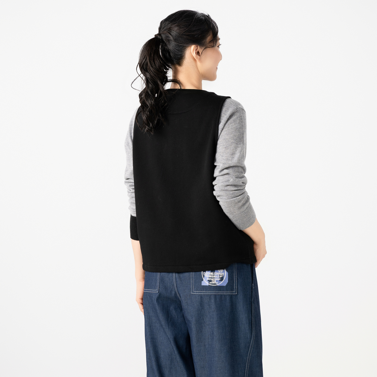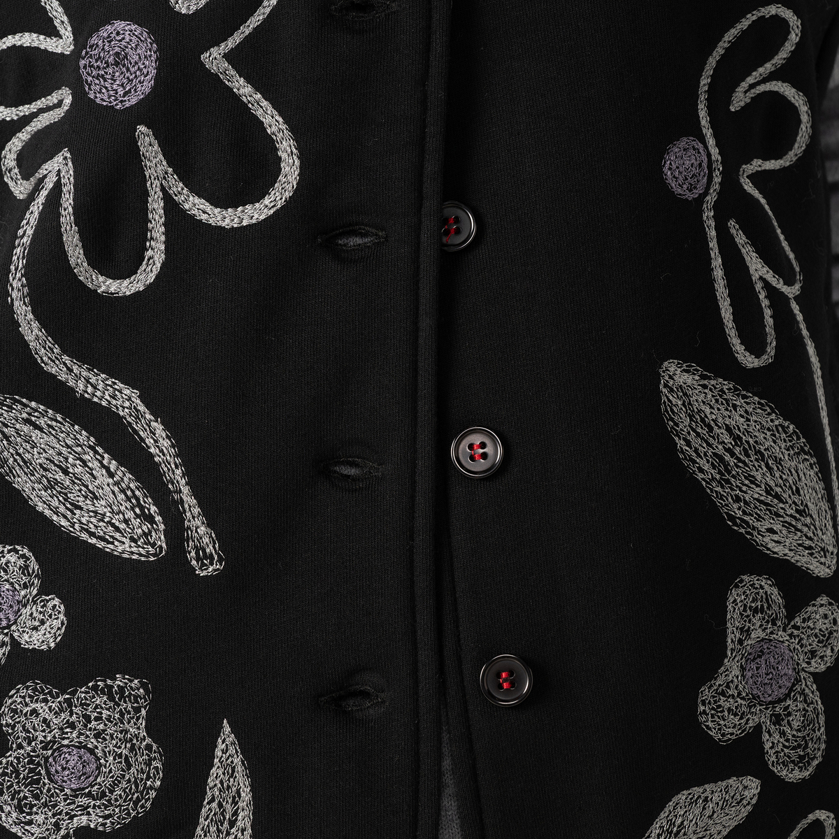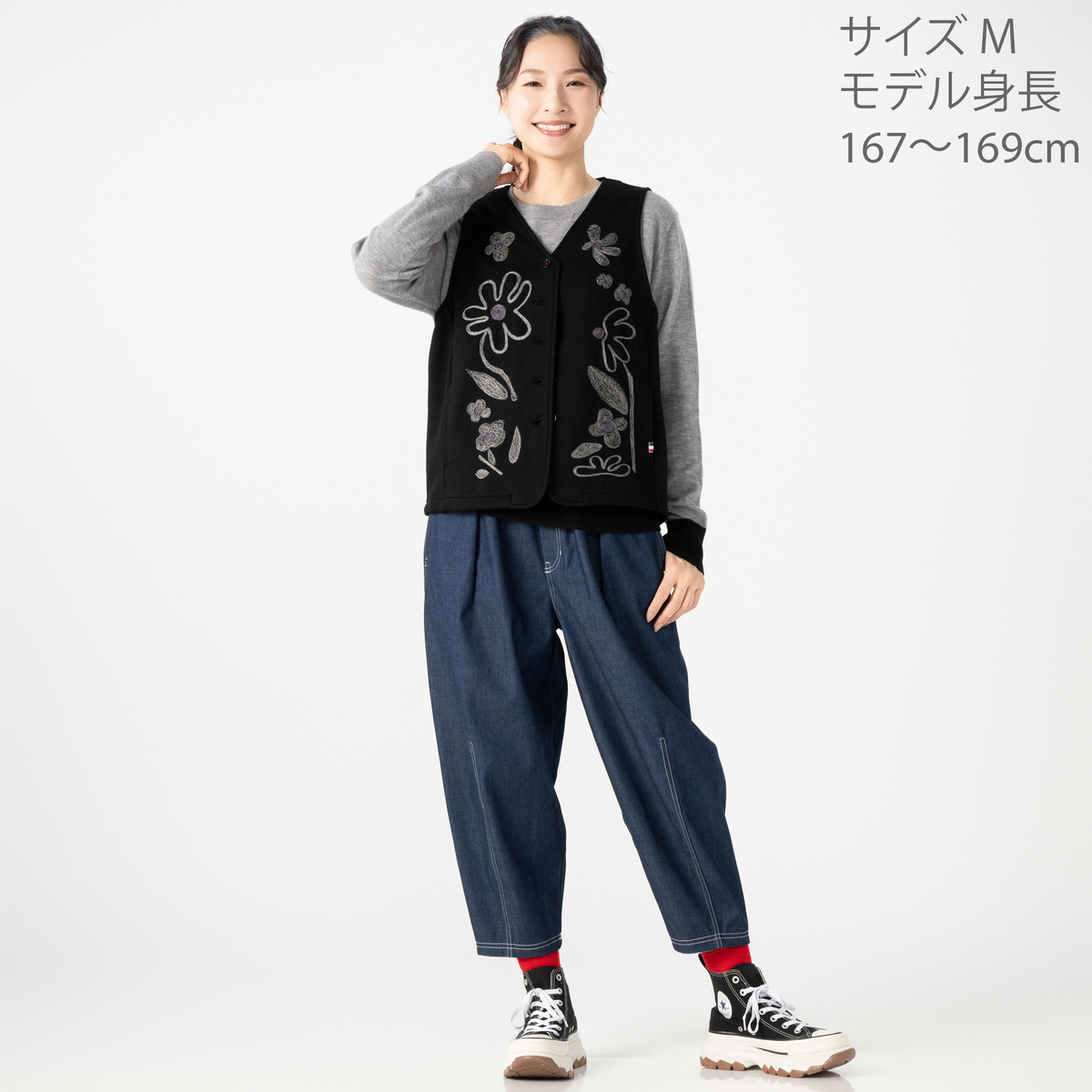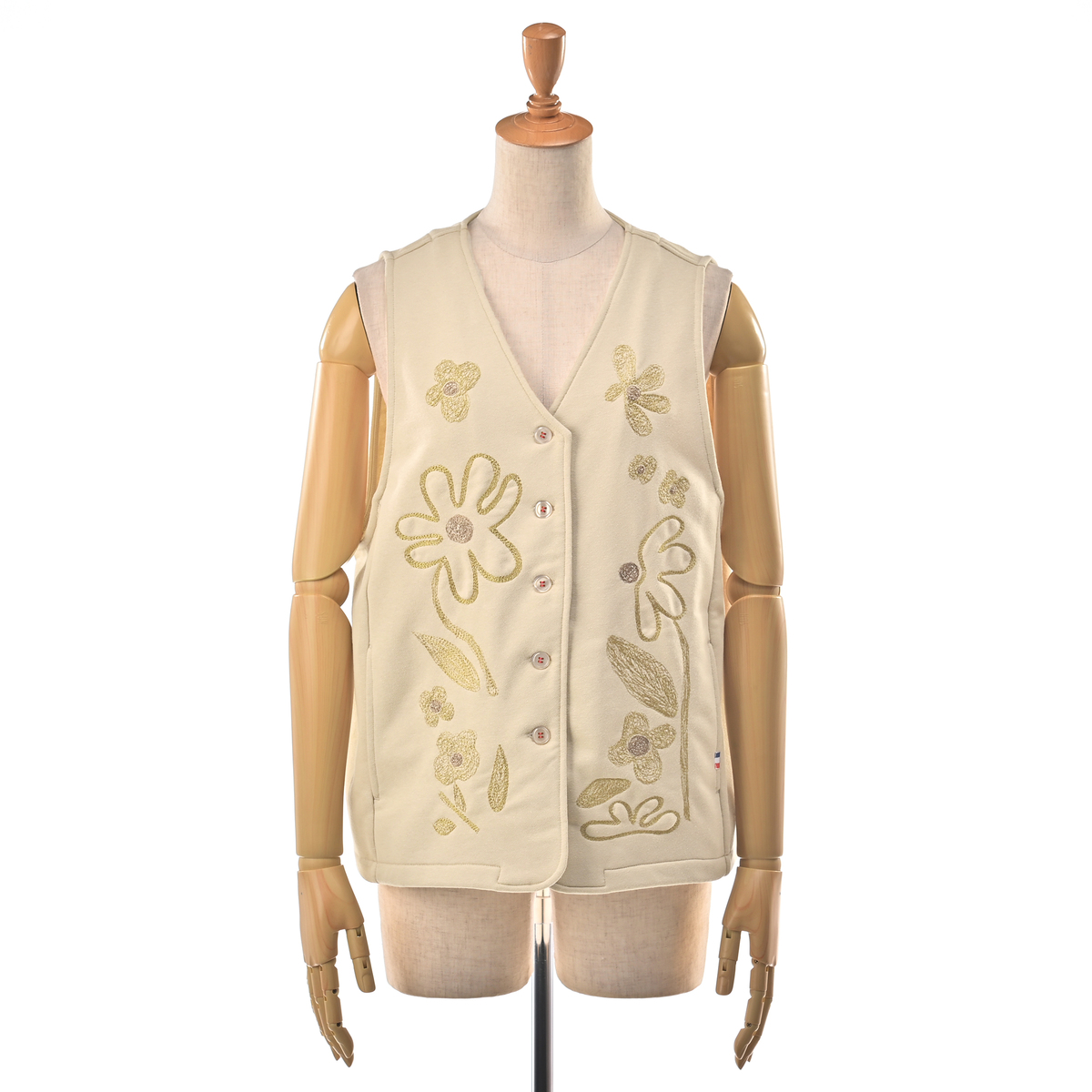 花の刺繍が目を引くカットソー素材のジレです。軽やかな着心地で重ね着を楽しめ、長袖Tシャツやハイネックに加えるだけで装いに華やぎをプラス。シックな色調の刺繍がコーディネートを品よく仕上げます