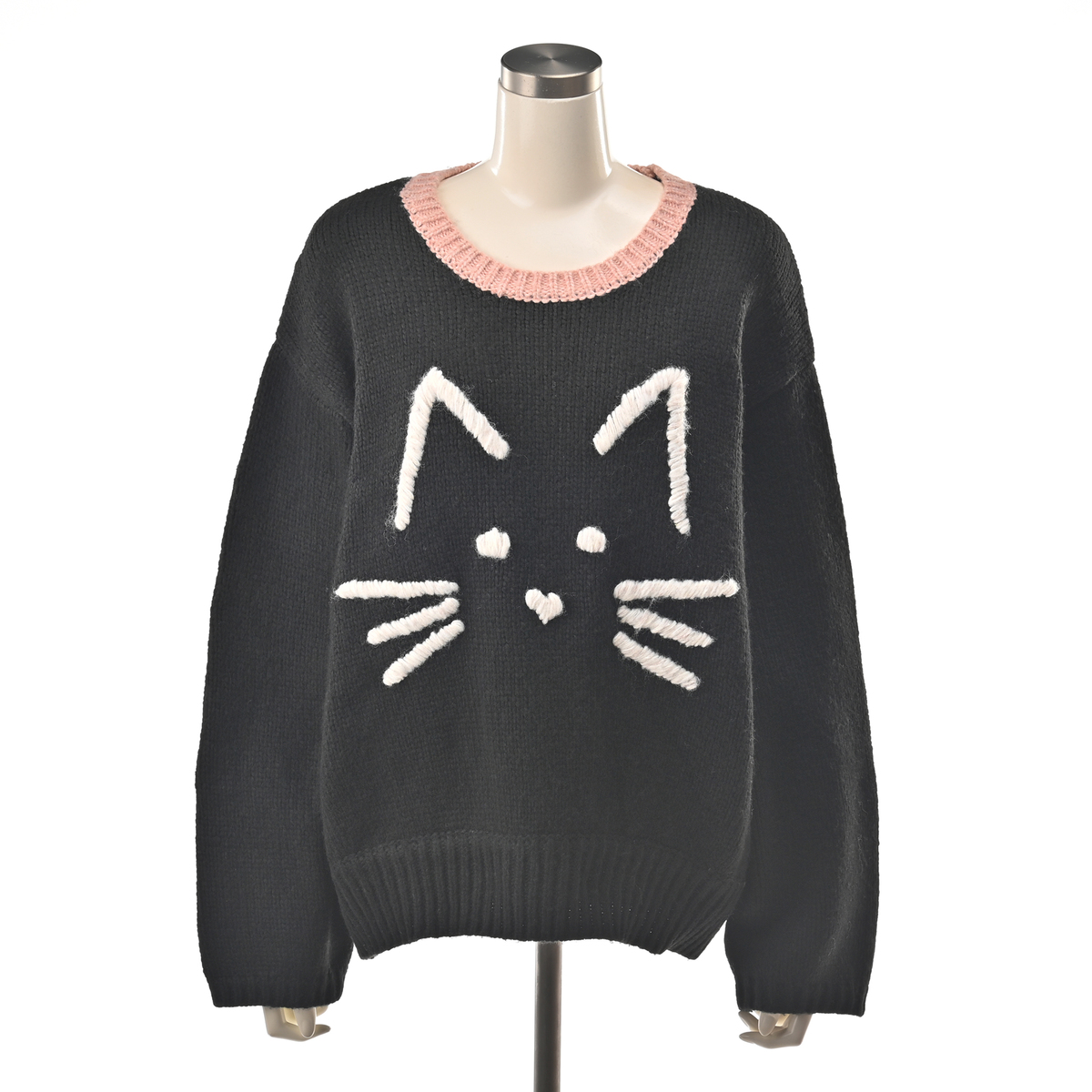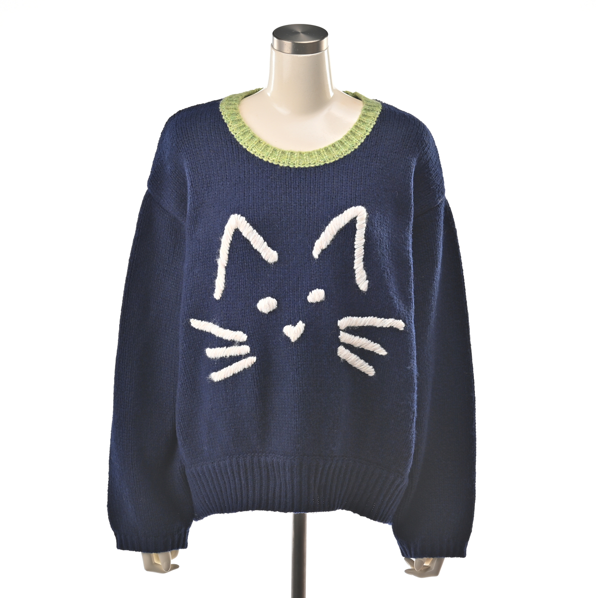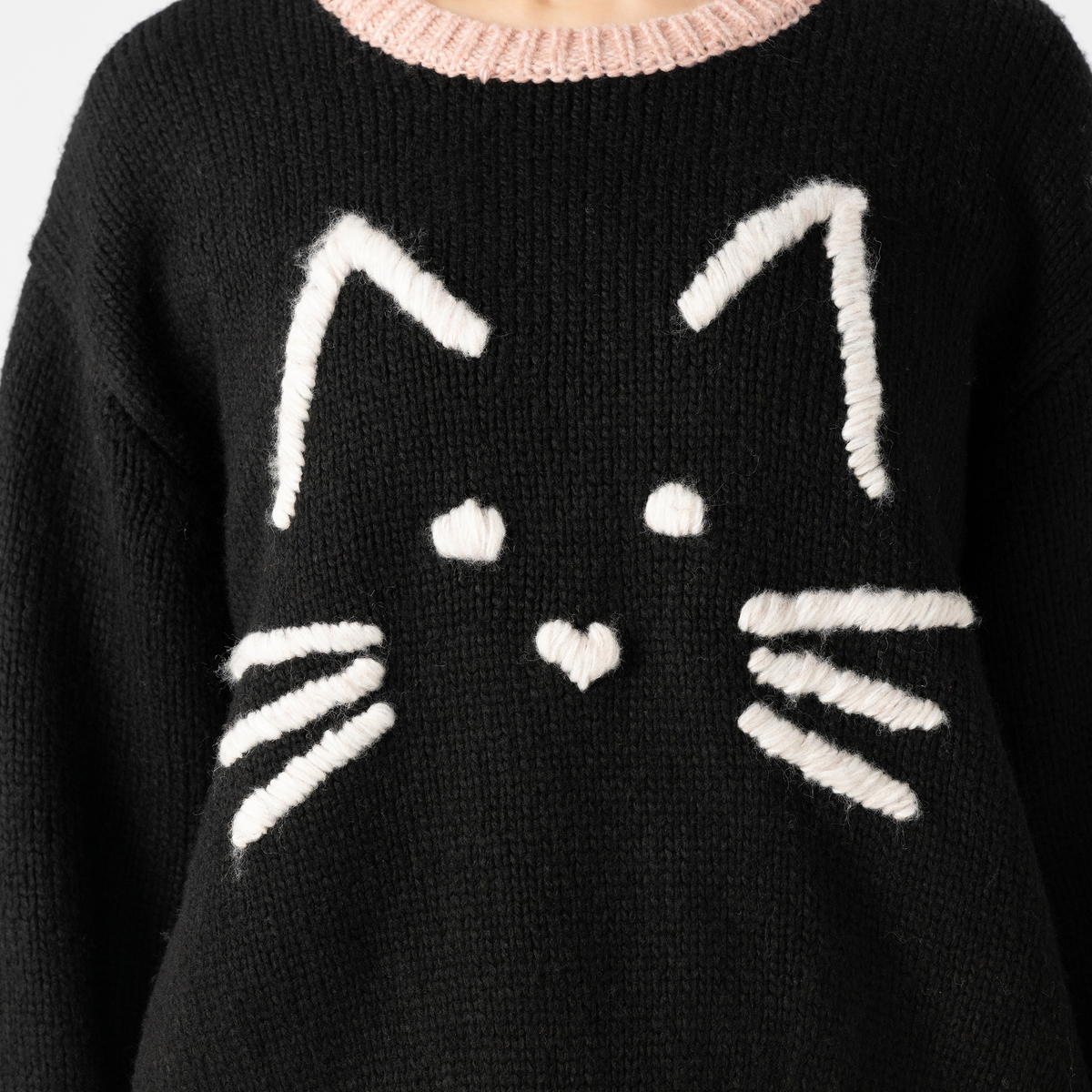 ヴィンテージ感を漂わせるキャットモチーフのクルーネックニット。前身頃には手刺し刺繍を施し、ぬくもりを感じる仕上がりです。太めの糸でざっくり編み上げた風合いが魅力で、Tシャツやスカートとの組合せもこなれた印象に