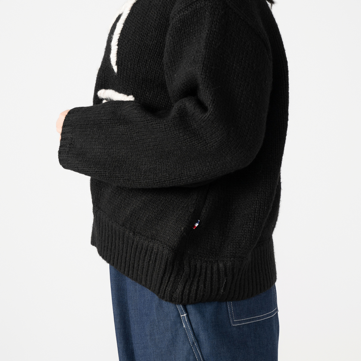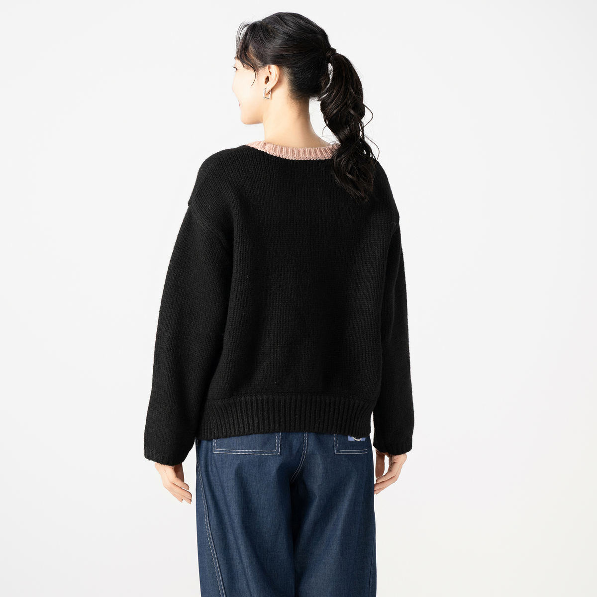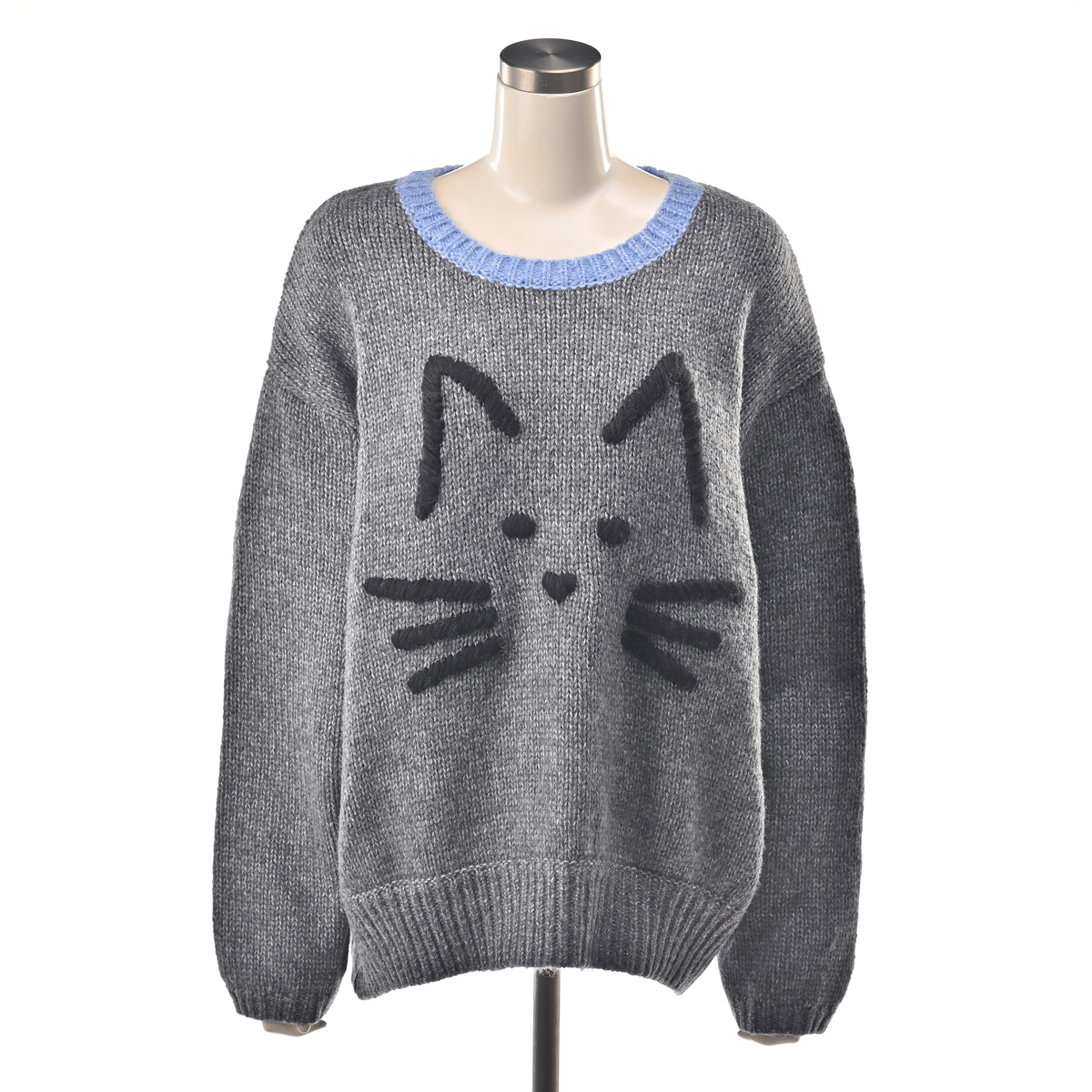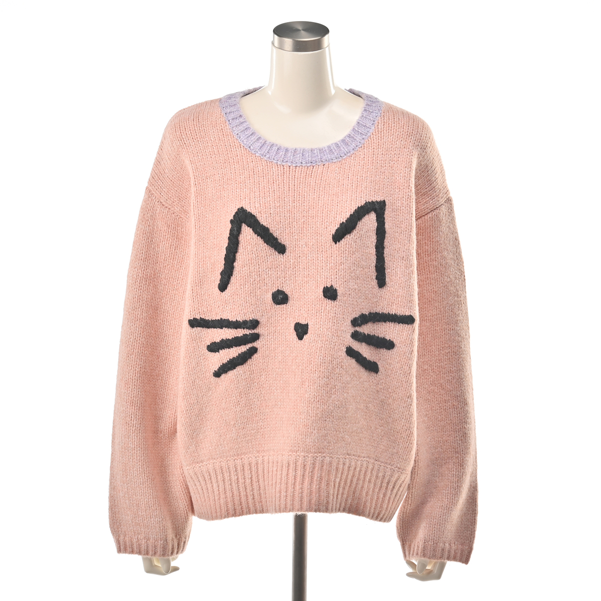 ヴィンテージ感を漂わせるキャットモチーフのクルーネックニット。前身頃には手刺し刺繍を施し、ぬくもりを感じる仕上がりです。太めの糸でざっくり編み上げた風合いが魅力で、Tシャツやスカートとの組合せもこなれた印象に